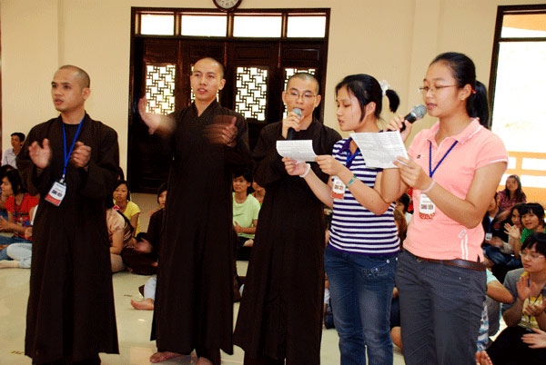 Sau khi dùng cơm sáng, các bạn đều tập trung lên giảng đường. Đại đức Thích Trí Huệ – giảng sư được mời phụ trách chính buổi pháp thoại, đã chia sẻ đề tài “Tài và Đức” với các bạn. Sau thời pháp là khoảng thời gian vấn đáp trực tiếp giữa các bạn với giảng sư xoay quanh nội dung đề tài vừa thuyết giảng. Tiếp theo, quý thầy bổn tự có buổi sinh hoạt giao lưu và trả lời những chất vấn Phật pháp cho các bạn.