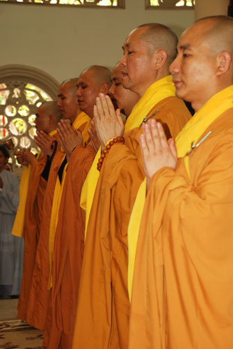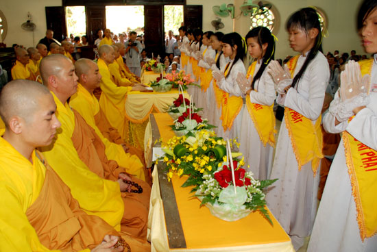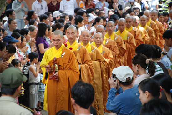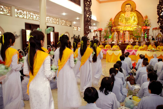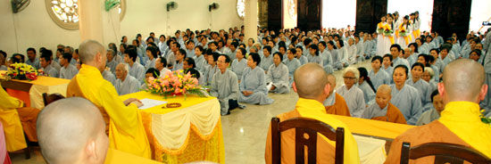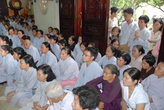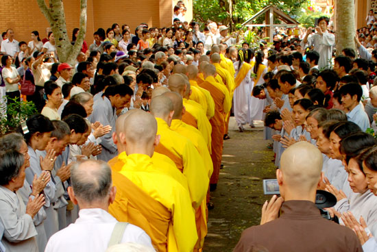 Đúng vào lúc 9h00, Phật tử đã tề tựu đông đủ, ba hồi chuông trống Bát-nhã vang lên cung nghinh chư tôn đức quang lâm lễ đài. Từng bước chân nhẹ nhàng tỉnh thức tiến về lễ đài tạo nên không khí thật trang nghiêm.