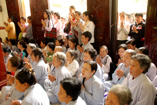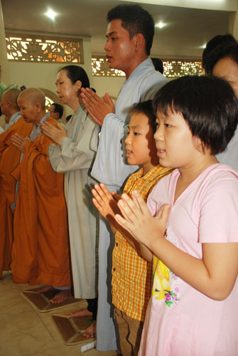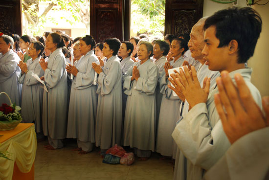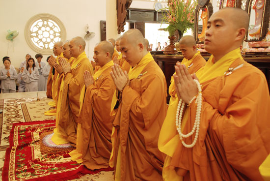 Sau những pháp âm của thầy trụ trì chùa Hoằng Pháp là nghi lễ tụng kinh Khánh Đản.