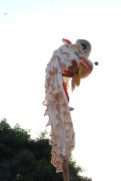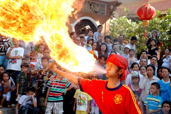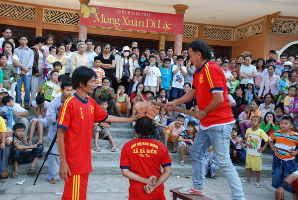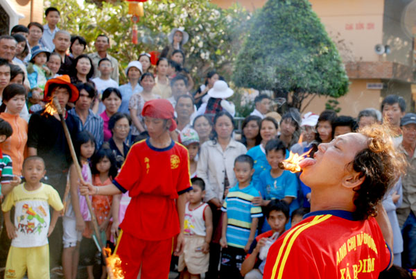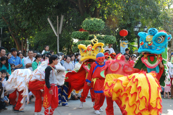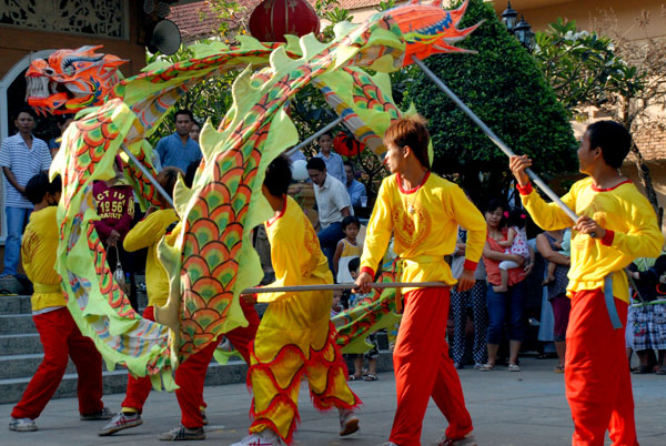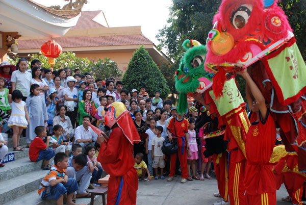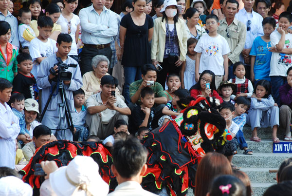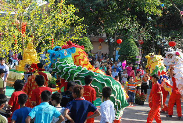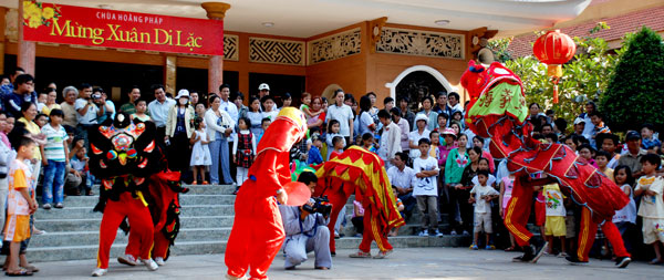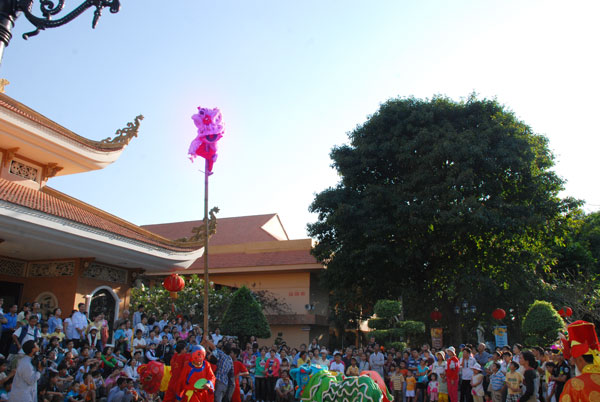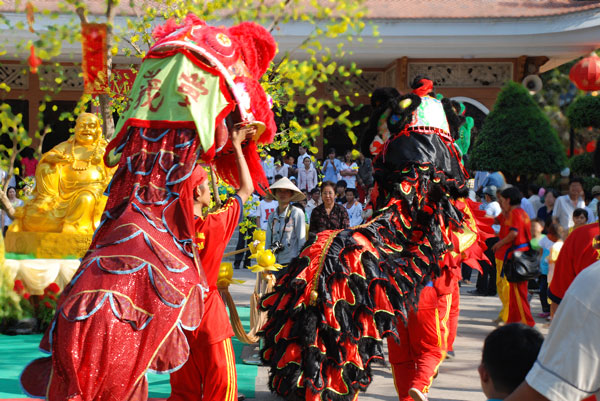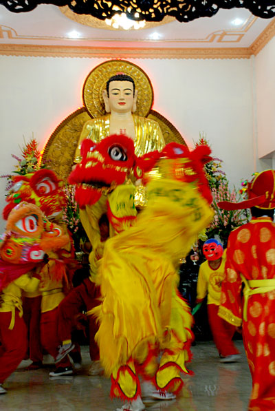 Không khí tết ở chùa càng thêm vui nhộn khi hàng chục đoàn múa lân, múa rồng về chùa biểu diễn.
