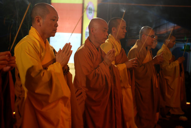 Buổi lễ được bắt đầu vào lúc 18h30. Ba hồi chuông trống bát nhã vang lên hòa cùng tiếng niệm Phật của đại chúng cung nghinh chư tôn đức quang lâm lễ đài chứng minh.