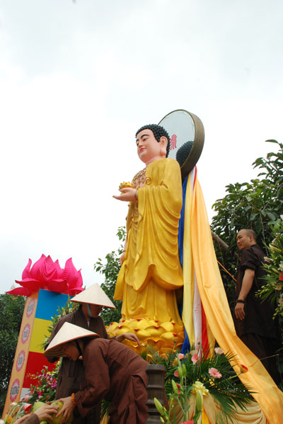 Tiếp đến, hàng nghìn người con Phật chắp tay thành kính lắng nghe Thượng tọa trụ trì đọc 48 lời đại nguyện và 12 lời phát nguyện niệm Phật.