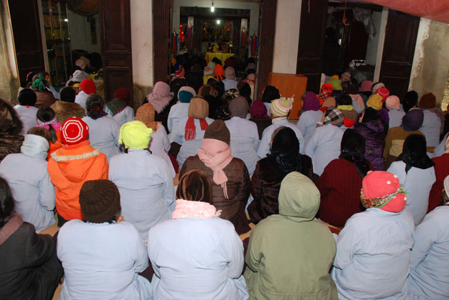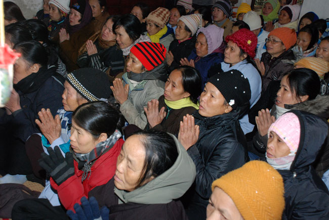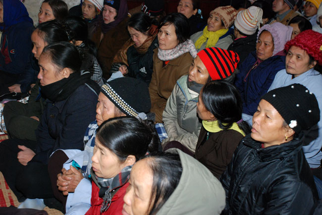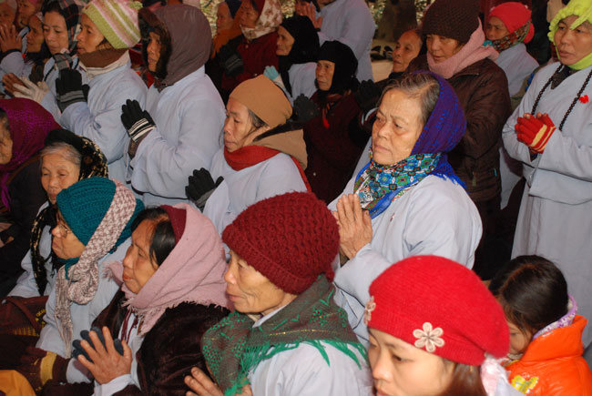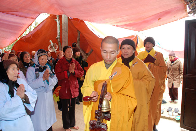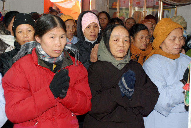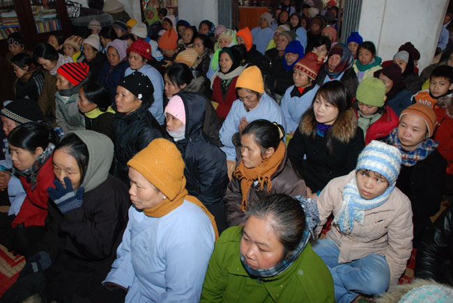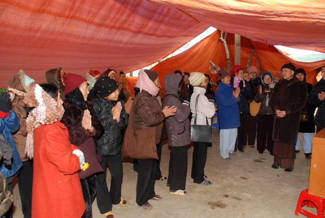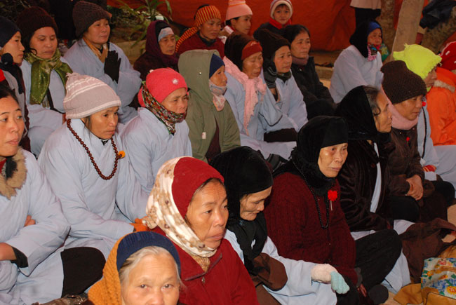 Như những bông hoa sen bình dị, để trở thành con Phật và là một Phật tử đối với người dân nơi đây tưởng như một điều mơ ước cao xa mà nay đã thành hiện thực. Trong khu chánh điện mái ngói cũ kỹ chỉ rộng chừng 40 m2, cột kèo mối mọt hư hại nặng nề, có cảm tưởng như sắp đổ lúc nào không biết, phía sân ngoài được căng vải bạt chỉ đủ để che tạm những hạt mưa phùn nặng hạt và những cơn gió rét luôn rít lên từng hồi. Gần 200 quý Phật tử vẫn ngồi yên lặng, chăm chú lắng nghe từng lời giảng của Thượng toạ về ý nghĩa “Tam quy ngũ giới’’, để rồi nhận ra được rằng thứ quý giá nhất trên cuộc đời này không phải là vàng bạc châu báu, mà chính giáo pháp của Đức Thế Tôn mới là phương pháp soi đường chỉ lối giúp con người thoát khỏi lầm mê, tu sửa thân tâm để tìm thấy sự an vui, hạnh phúc không những trong kiếp này mà cả vị lai.