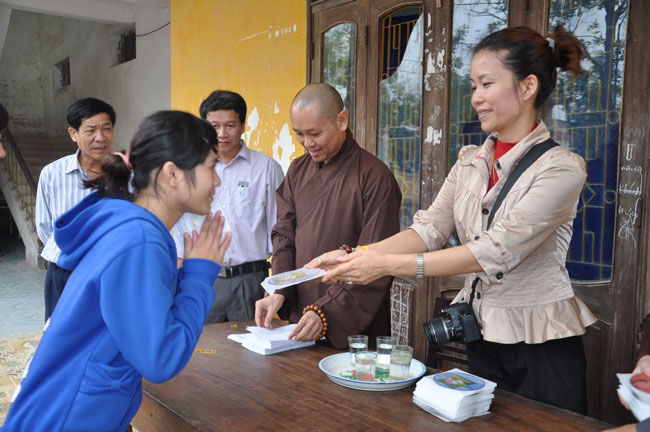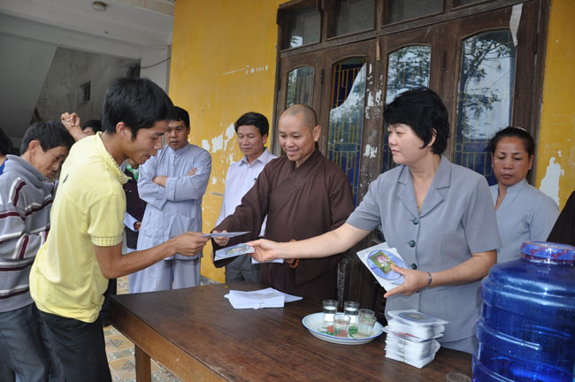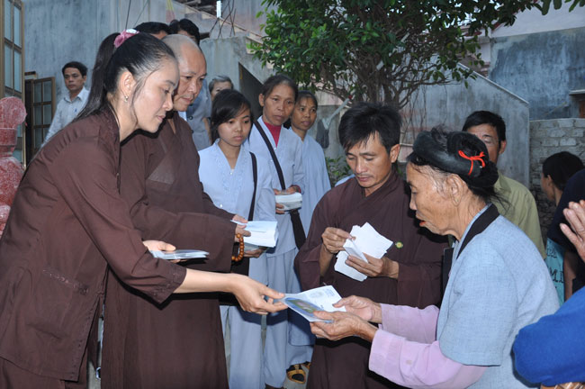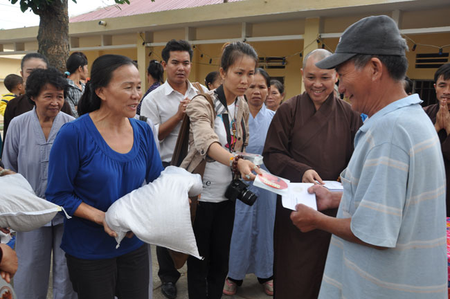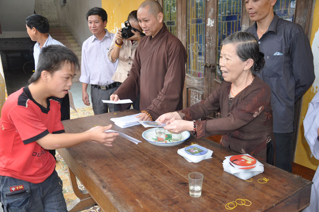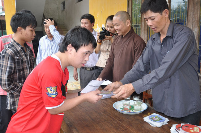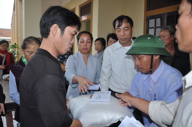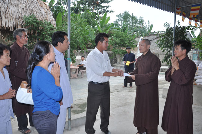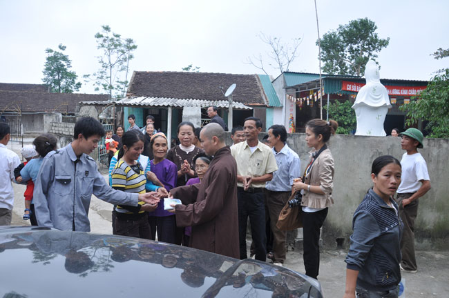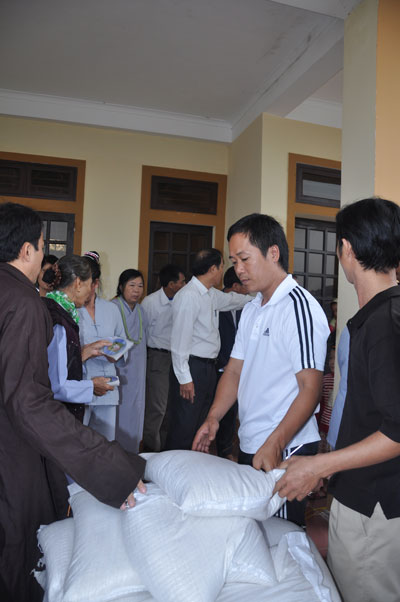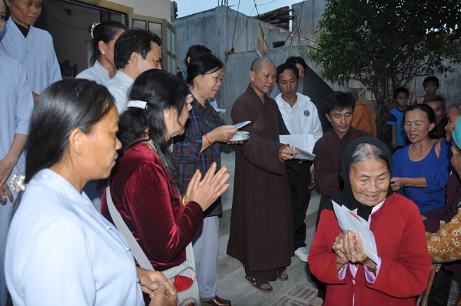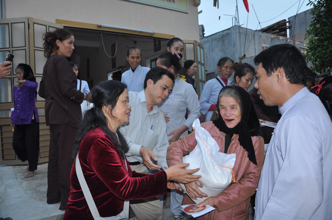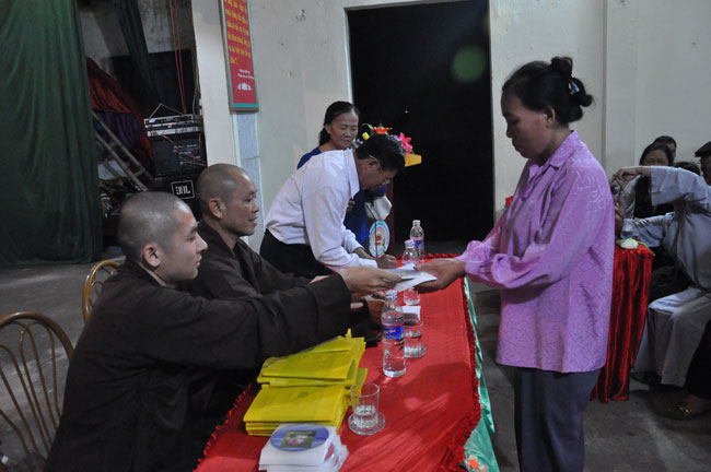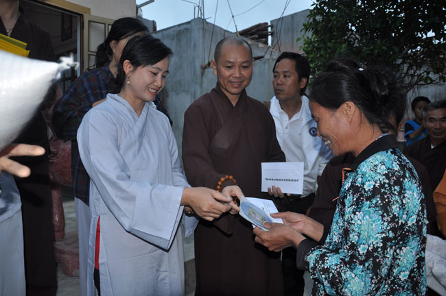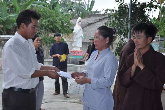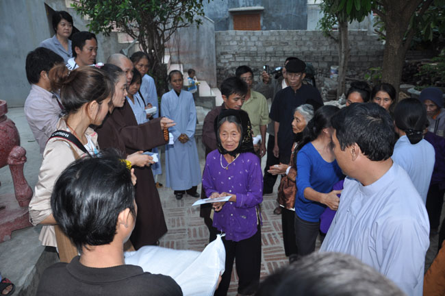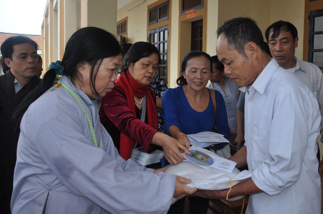 Không quản mệt mỏi, mặc dù trời đã tối, nhưng đoàn vẫn tiếp tục đi tới xã Quỳnh Phương, huyện Quỳnh Lưu. Tại đây, cùng với Phật tử Hoàng Thị Thoa, đoàn đã gửi đến 25 phần quà cho 25 hộ đặc biệt khó khăn. Mỗi phần quà trị giá 2 triệu đồng.