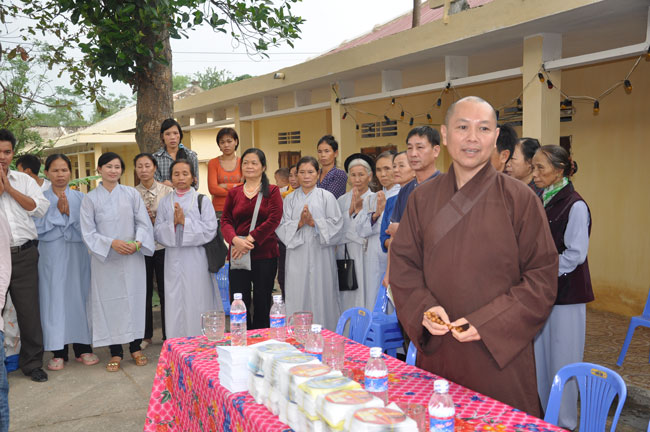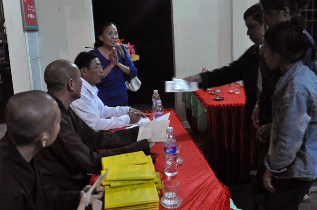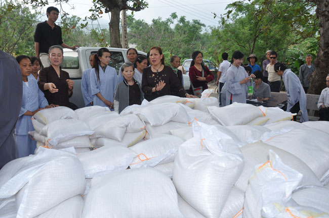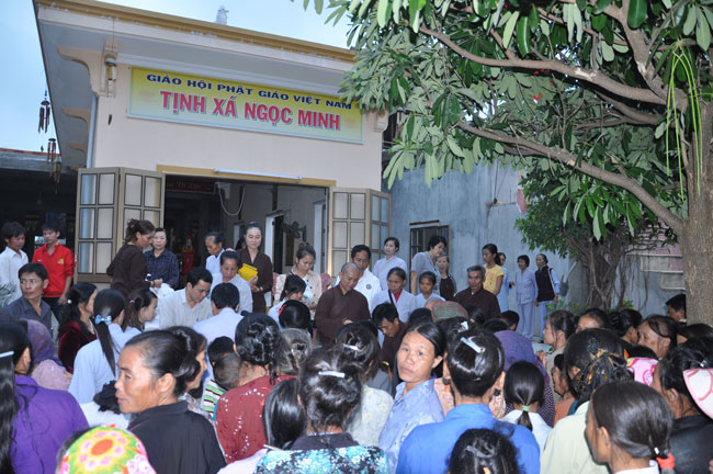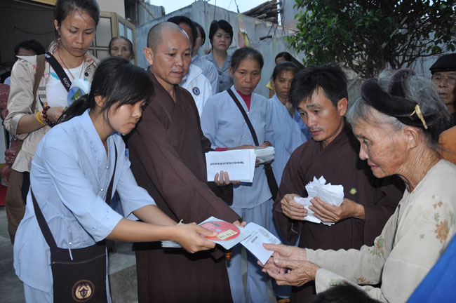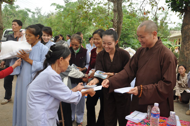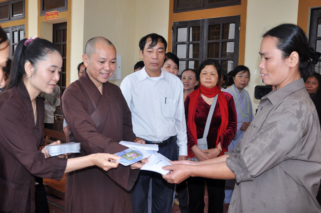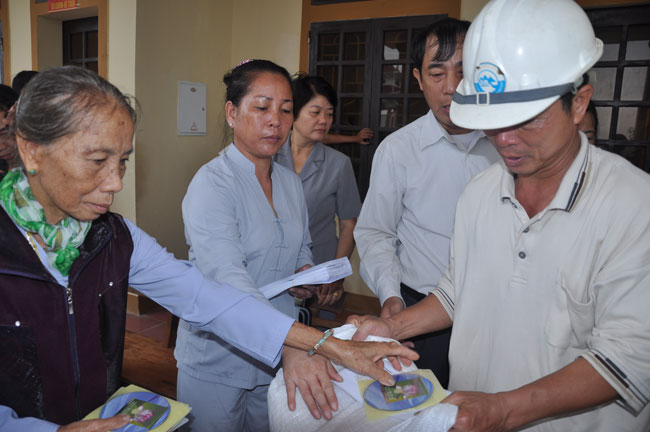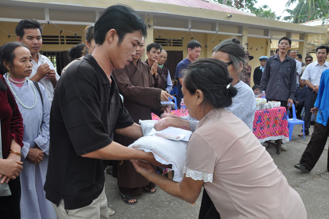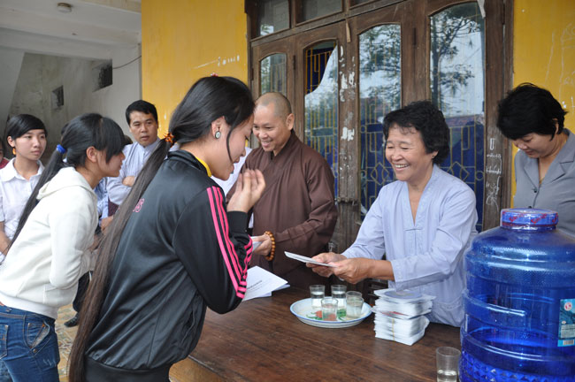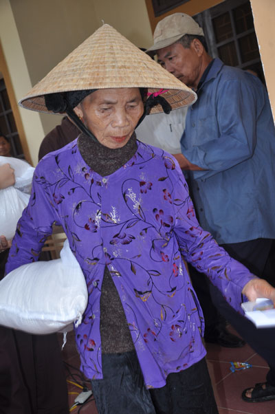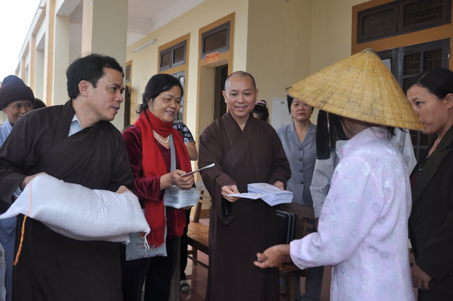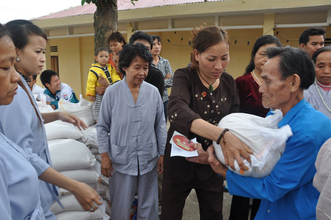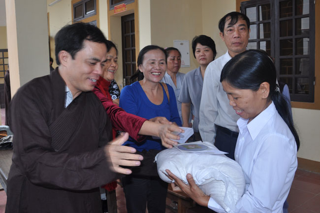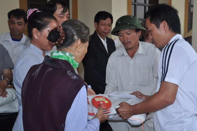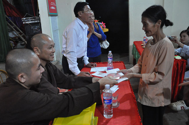 Không quản mệt mỏi, mặc dù trời đã tối, nhưng đoàn vẫn tiếp tục đi tới xã Quỳnh Phương, huyện Quỳnh Lưu. Tại đây, cùng với Phật tử Hoàng Thị Thoa, đoàn đã gửi đến 25 phần quà cho 25 hộ đặc biệt khó khăn. Mỗi phần quà trị giá 2 triệu đồng.