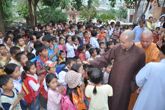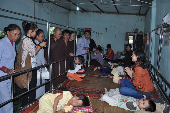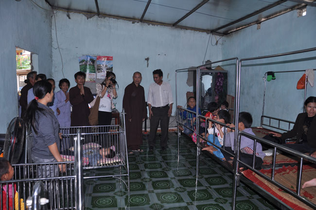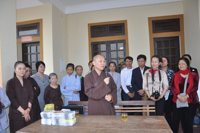Sau bữa cơm trưa giản đơn mang theo, ngay đầu giờ chiều đoàn tiếp tục ghé thăm cơ sở bảo trợ Hiền Lương, xã Thọ Thành, huyện Yên Thành. Được biết, cơ sở này do anh Tạ Duy Sáu sáng lập từ năm 2006. Ban đầu, chỉ có 7 em nhưng giờ đây, với tấm lòng rộng mở, cơ sở đã đón nhận 47 em, trong đó là 26 trẻ em mồ côi không nơi nương tựa và 21 người khuyết tật đang sinh hoạt và học nghề ngay tại cơ sở. Trân trọng tấm lòng nhân ái của người sáng lập, cũng như tình thương yêu trải khắp cơ sở, Thượng tọa cùng đoàn đã động viên và ca ngợi tinh thần vươn lên cũng như ý chí sống của những mảnh đời bất hạnh này. Kết thúc chuyến thăm, đoàn đã gửi tặng 60 phần quà, mỗi phần trị giá 300.000 ngàn đồng.