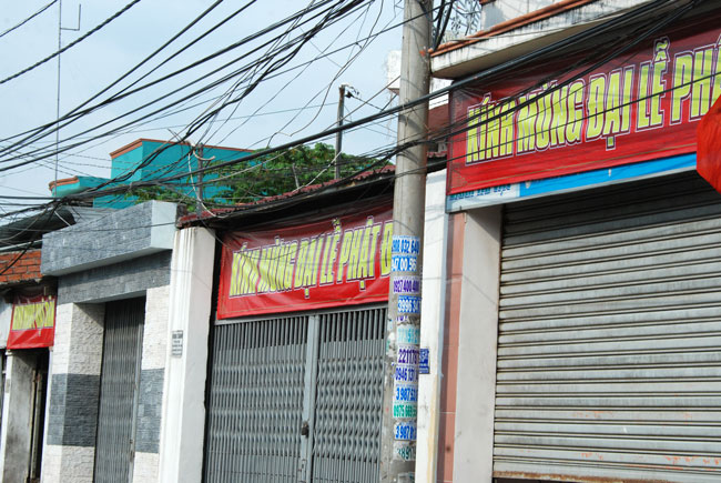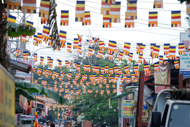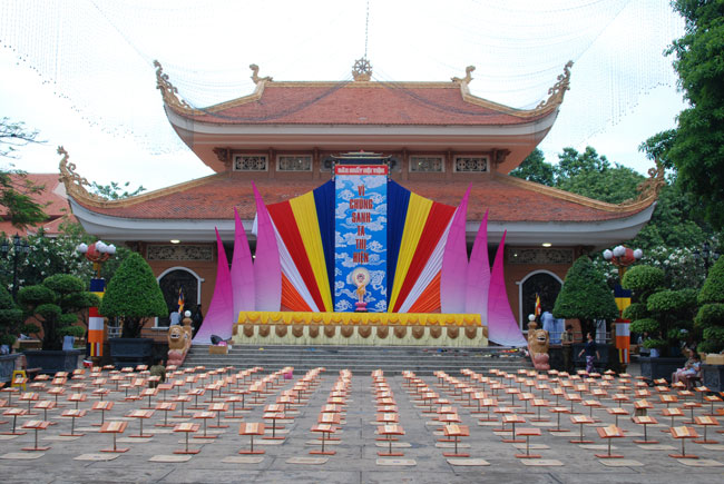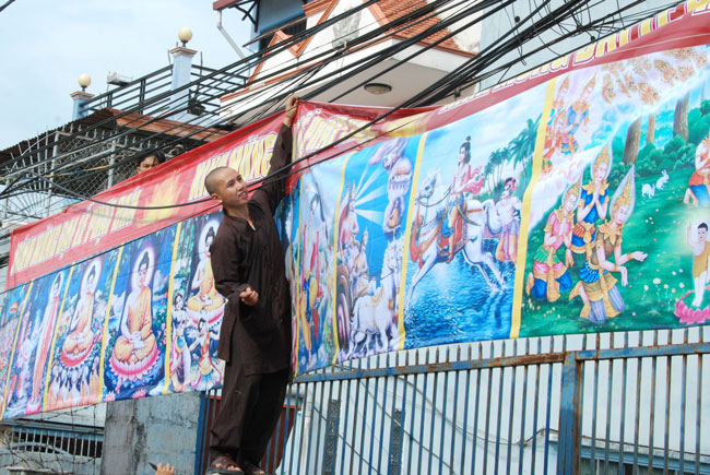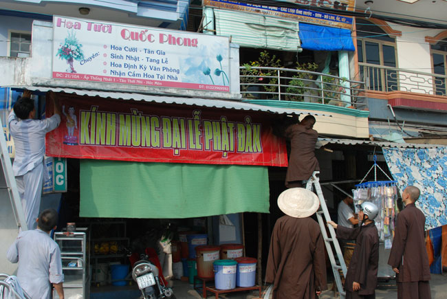 Một trong số các chương trình đó là việc quý thầy đã giúp các gia đình Phật tử gần phạm vi chùa treo băng rôn Kính Mừng Đại Lễ Phật Đản và phông ảnh Vườn Lâm Tỳ Ni cùng cờ Phật giáo. Dưới cái nóng oi ả của ngày hè, quý thầy vẫn tỉ mỉ, cẩn thận buộc dây cho thật chắc chắn. Khi những tấm băng rôn được căng lên, vườn Lâm Tỳ Ni hiện ra vô cùng sinh động, lòng người trở nên phấn chấn, hân hoan lạ thường. Dường như ai ai cũng háo hức mong chờ ngày kỷ niệm đức Phật đản sinh. Đó là những đóng góp tinh thần hết sức lớn lao cho sự hưng thịnh của Phật pháp trong tương lai. Vì vậy, nếu nhà nhà đều treo cờ Phật giáo chào mừng Phật đản thì sẽ tạo ra không gian văn hóa tâm linh để hướng mọi người tìm về bên đấng cha lành tôn quý.