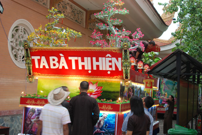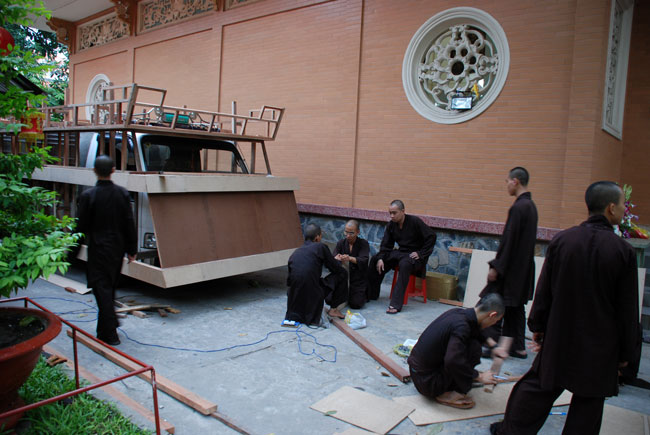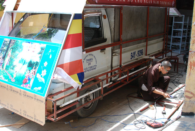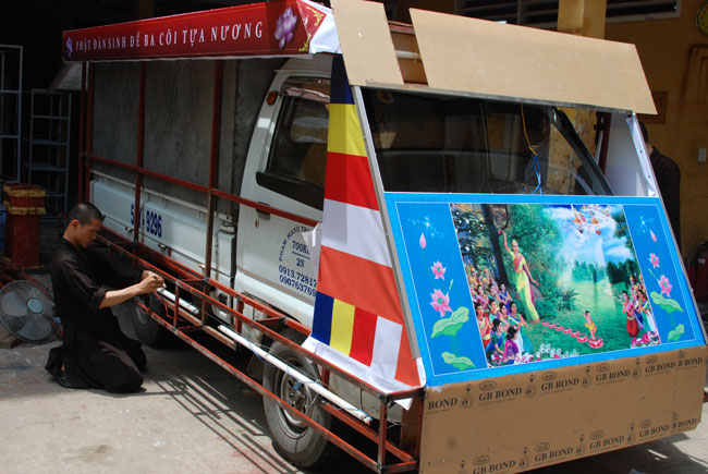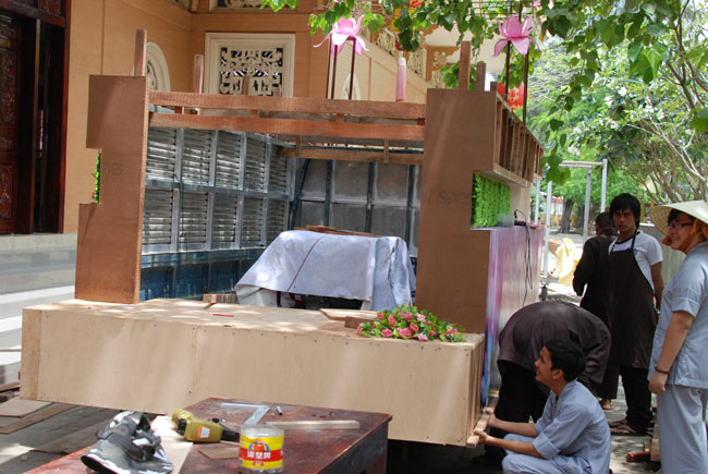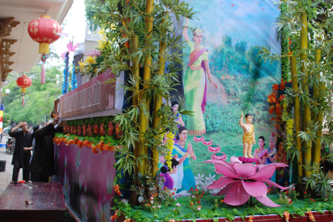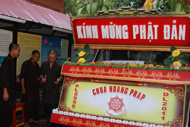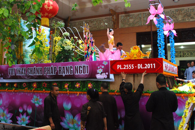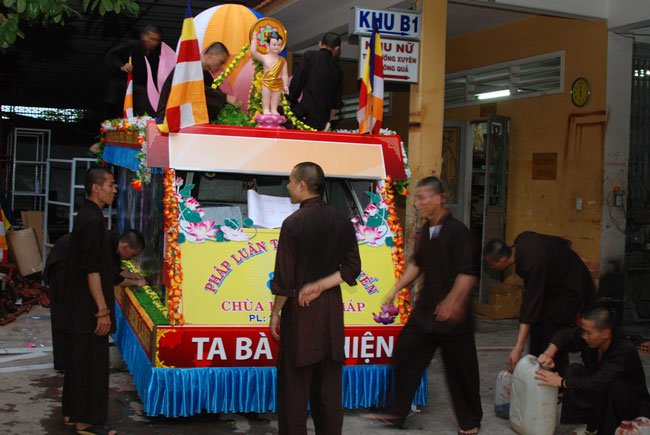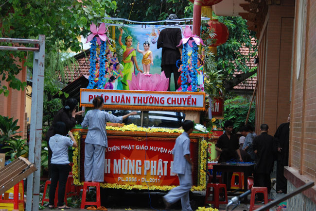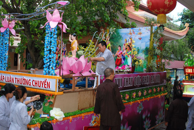 Tiếp đó, là chương trình diễu hành xe hoa mừng ngày Phật đản. Chương trình diễu hành sẽ bắt đầu từ ngày 13 âm lich, vì vậy mà công tác chuẩn bị hết sức công phu từ thiết kế đến trang trí xe hoa đều đã được thực hiện trong nhiều ngày trước. Hòa chung vào không khí nô nức đón chào ngày lễ Phật đản, mỗi người con Phật cùng chung tay góp sức phụ giúp một phần công việc. Ngoài quý thầy, các Phật tử trong chùa, bổn tự còn nhận được sự đóng góp nhiệt tình từ các bạn trẻ trong câu lạc bộ sinh viên Hoằng Pháp. Từng tranh đức Phật, tượng Phật đản sanh, hình tượng hoa sen, hình quả địa cầu hòa bình, băng rôn… đến những bông hoa đã được gắn lên xe bằng đôi bàn tay của những người con Phật có tín tâm với lòng từ bi và trí huệ của đức Phật. Nhìn những chiếc xe hoa dần được hình thành qua từng ngày, trong lòng người con Phật dường như cũng đang hướng đến nguồn cội, đến sự ra đời của đức Phật.