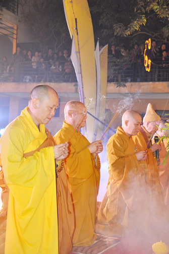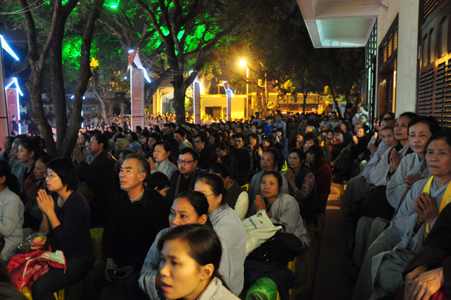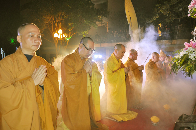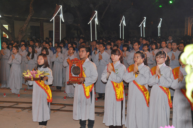 Sau khi cung thỉnh chư tôn đức Tăng Ni quang lâm pháp tòa, đêm hội được chính thức bắt đầu qua phần diễn văn khai mạc của HT. Thích Bảo Nghiêm, Trưởng BTC đêm hội Hoa Đăng. Những ngày cuối năm tại miền Bắc, cái lạnh lại càng khắc nghiệt hơn, nhưng với lòng thành kính thiết tha, hàng ngàn Phật tử cùng chư tôn đức đã thành kính hướng lên lễ đài làm lễ nguyện hương. Và giây phút thiêng liêng nhất trong đêm lễ được hàng Phật tử tứ chúng đón chờ nhất, đó là thời khắc đón nhận ánh sáng trí tuệ từ bàn Phật của HT. Thích Trí Quảng. Cũng từ đó, ánh sáng được truyền qua cho chư Tôn đức như biểu hiện của sự hòa hợp, kế thừa và phát huy những giá trị của Phật giáo. Từ ánh sáng ấy, HT. Thích Bảo Nghiêm truyền đến cho hàng Phật tử, chính giây phút này trong không gian bao la tĩnh lặng, hàng ngàn người con Phật như nhất tâm chí hướng, một lòng thanh tịnh đón nhận ánh sáng từ tình thương và sự che chở của quý Ngài như thể nơi đây, chính giây phút này tất cả đang ở bến đỗ tâm linh của chính mình. Từng ngọn nến được thắp lên, những tâm hồn như ấm lại để hòa mình trong một khung cảnh lung linh huyền ảo.