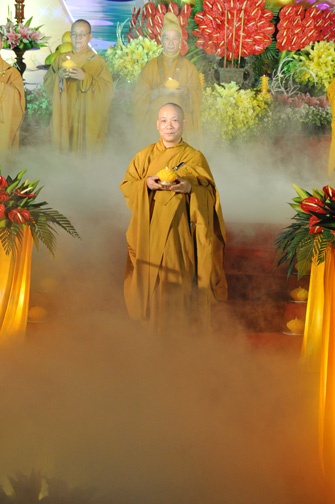 Tiếp theo là nghi thức xưng tán Phật và phần ý nghĩa ngày đức Phật thành đạo do Thượng tọa Thích Chân Tính tuyên đọc. Hàng ngàn Phật tử hiện diện như thấy được khung cảnh khi xưa lúc Đức Phật thành đạo dưới gốc cây Bồ Đề, giây phút ấy rung động cả cõi nhân thiên, khiến cho trời người hoan hỉ. Đó là thời khắc nhiệm mầu, huyền diệu, đức Phật đã vinh quang chiến thắng ma quân, phất cờ giải thoát,phá tan não phiền, cất khúc khải hoàn ca. Chính sự kiện giác ngộ phi thường này đã mở lối giải thoát cho chúng sinh, khẳng định mọi loài đều có tánh giác, đều có khả năng chứng ngộ và thành đạo.