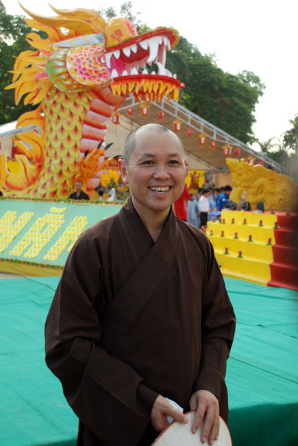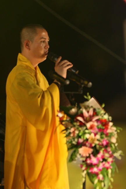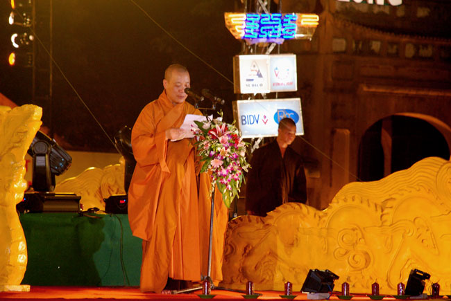 Trước khi vào nghi lễ thắp nến truyền đăng, TT. Thích Bảo Nghiêm trưởng ban tổ chức đọc diễn văn khai mạc lễ hội hoa đăng kỷ niệm 1.000 năm Thăng Long.