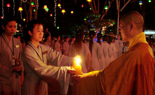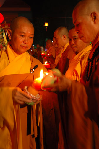 Sau phần dâng hương, đêm hội hoa đăng được tiếp diễn qua nghi thức truyền đăng. Đây là nghi thức quan trọng nhất của buổi lễ. Ánh sáng lung linh huyền ảo từ ngọn nến trên tay Thượng tọa trụ trì bắt đầu truyền sang cho Chư tôn thiền đức và hàng Phật tử như ánh sáng của tuệ tri, soi chiếu vào dòng đời, phá tan màn vô minh si ám. Và từ ngọn nến được truyền đầu tiên ấy, ánh sáng cứ tiếp tục truyền đi, một vùng sáng đã dần dần lan tỏa…