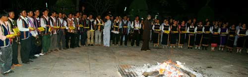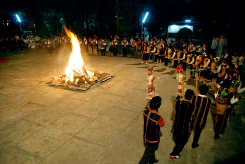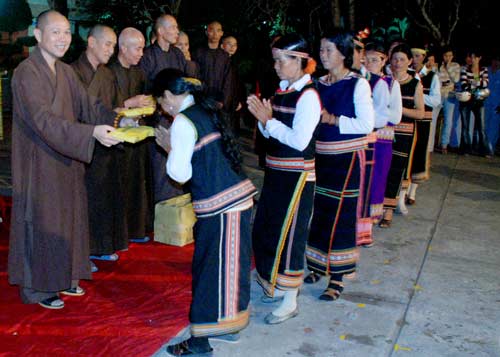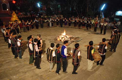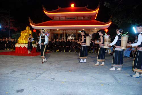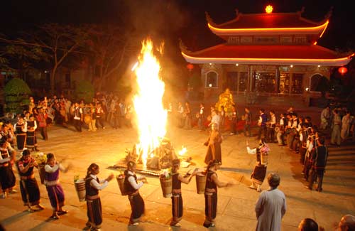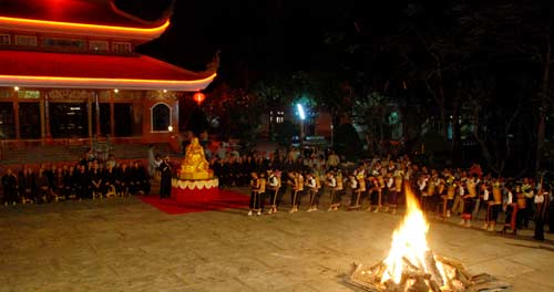 Đêm hội bắt đầu với tiếng cồng chiên nhịp nhàng, tiếng reo hò cổ vũ của hàng trăm Phật tử. Những âm vang sống động, những giai điệu quyến rũ mang đậm bản sắc văn hóa Gia Chim cứ chập chờn lung linh và xuống lên cùng ánh lửa. Đây quả là một đêm hội ý nghĩa và thân thiện, thắt chặt thêm tình đoàn kết, sự gắn bó, gần gũi hơn với các dân tộc anh em.
