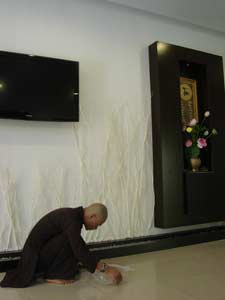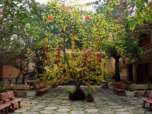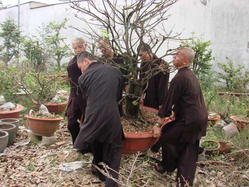 Những chậu mai kiểng cũng hội tụ về chùa để đón năm mới – năm Kỷ Sửu. Mọi công việc bắt đầu từ sáng sớm. Những cành mai xuân được các thầy cẩn thận bố trí trong khuôn viên chùa.