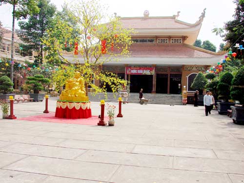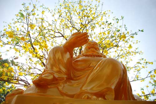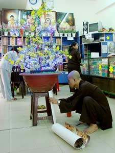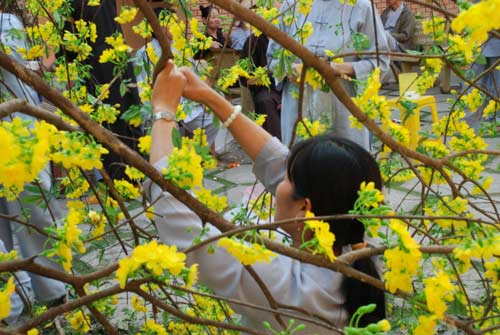Người đời nô nức đón xuân. Thiền môn cũng không kém phần tất bật. Công việc chuẩn bị khá tỉ mỉ. Cành mai vàng bên nhánh đào tươi đang khoe sắc thắm, tượng trưng cho hai miền Nam Bắc được các thầy chuẩn bị thật khéo léo từ việc tuyển chọn cho đến dáng dấp, chúng được chỉnh chu và dựng lên trông thật bắt mắt.