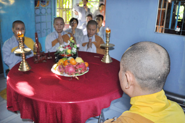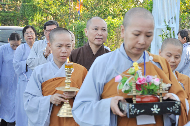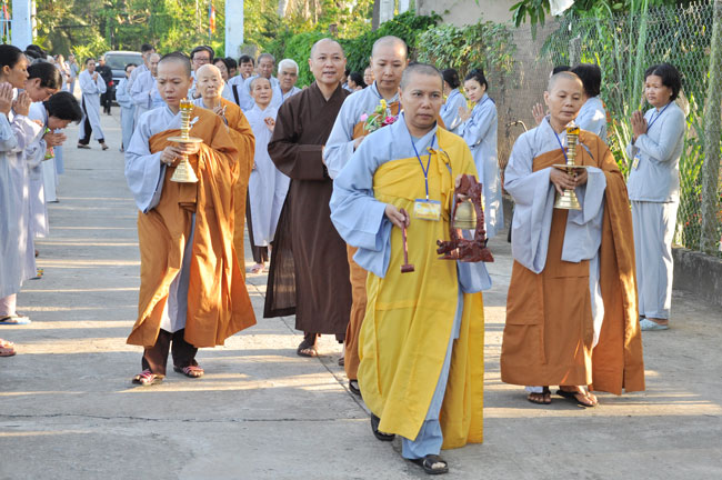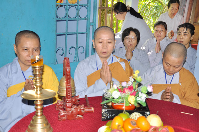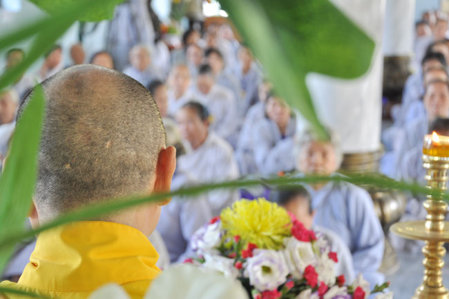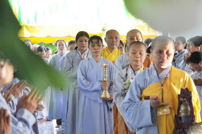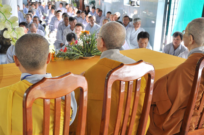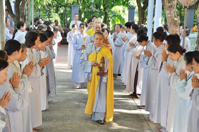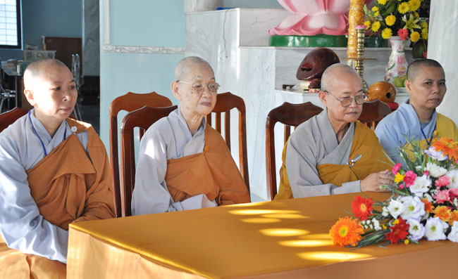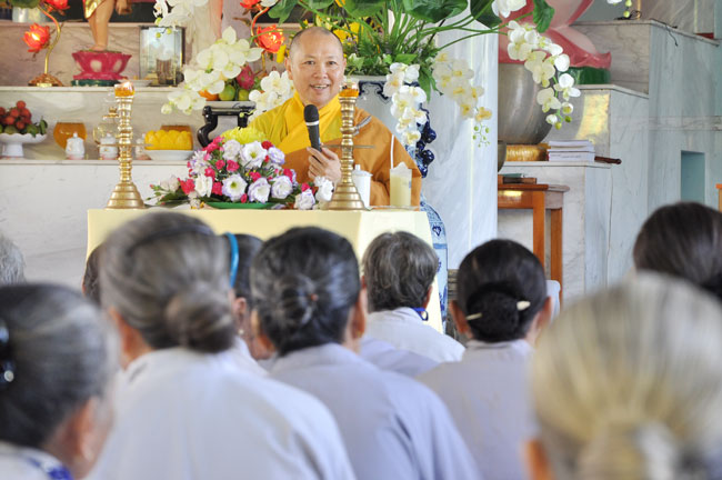 Đúng 9h, hai hàng Phật tử chắp tay trang nghiêm, thành kính cung thỉnh Thượng tọa thăng tòa giảng pháp. Sau lời tác bạch của sư cô trụ trì, Thượng tọa đã có bài pháp thoại qua câu kệ: “Thân người khó được, đạo tràng khó gặp, Phật pháp khó nghe” đến toàn thể Phật tử trong đạo tràng. Thượng tọa đã giải thích:"