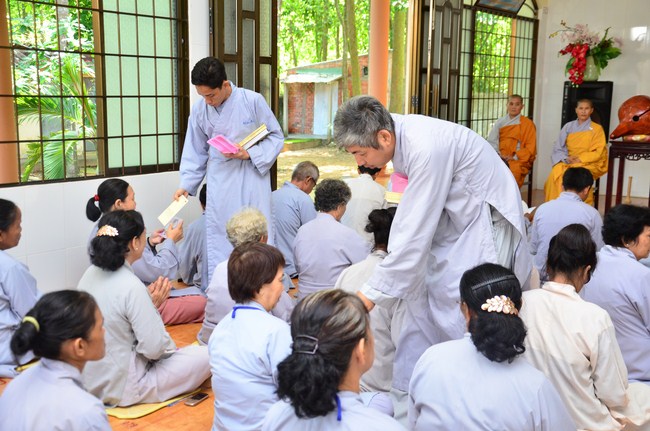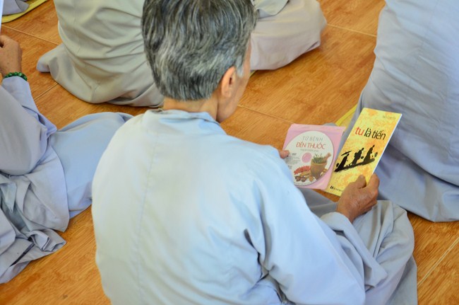 Sau buổi giảng pháp, Thượng tọa gởi tặng đến đại chúng VCD “Từ Bệnh Đến Thuốc” và sách “Tu Là Tiến”.