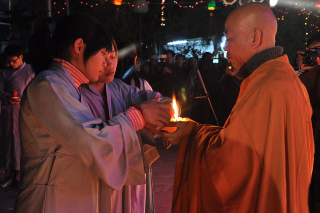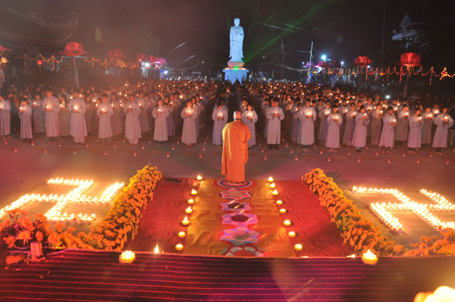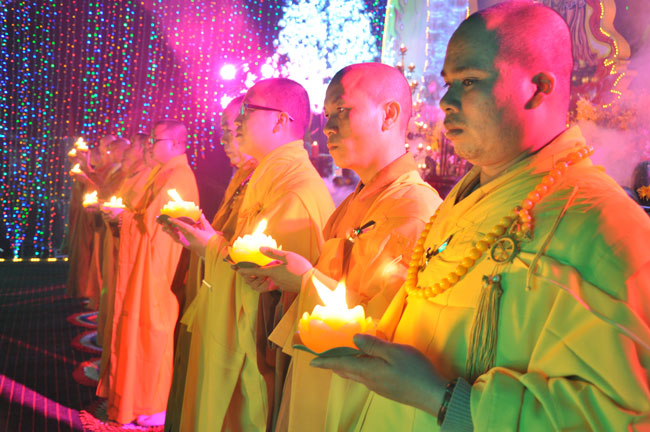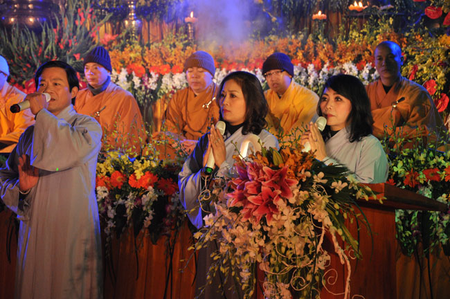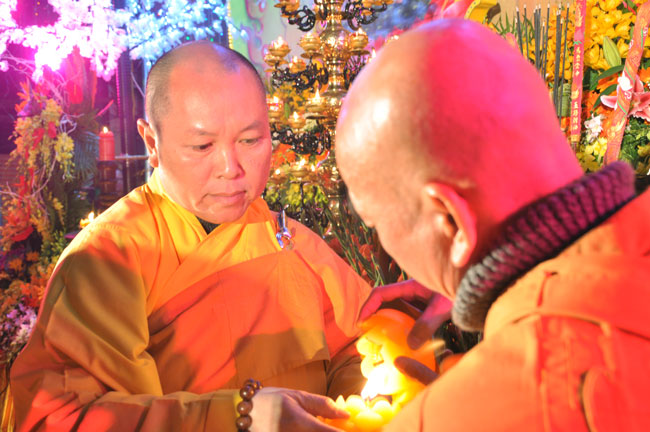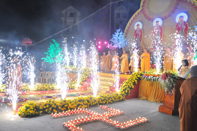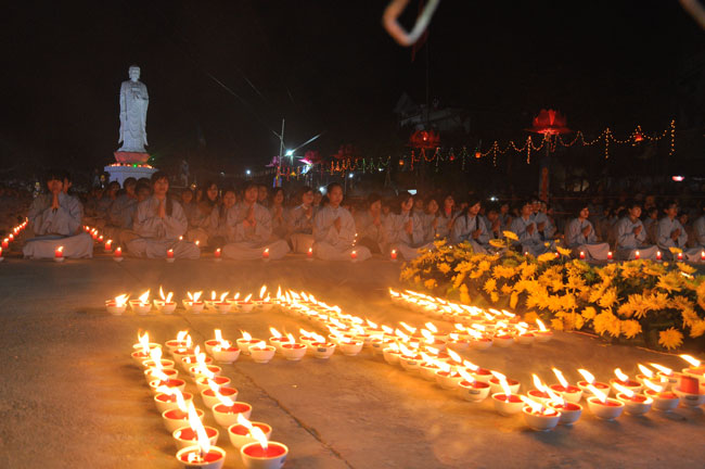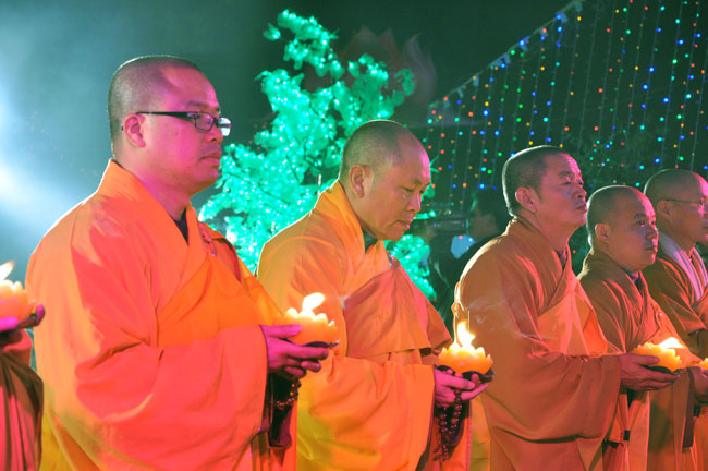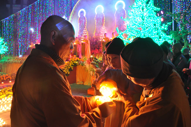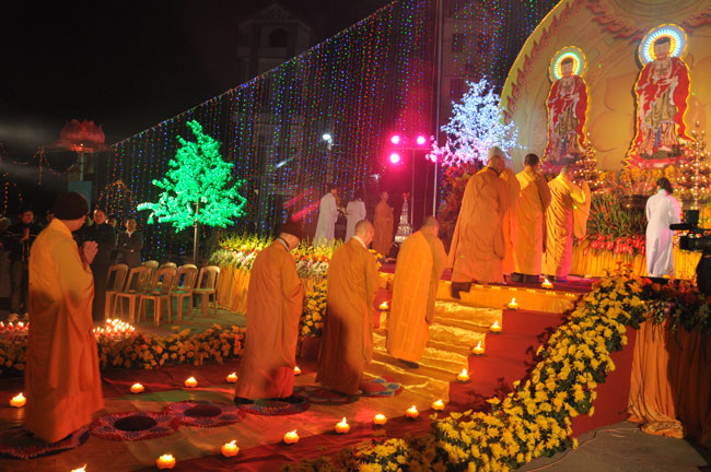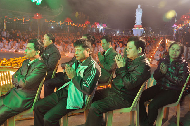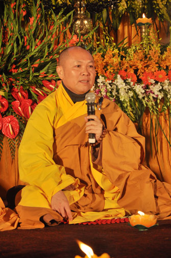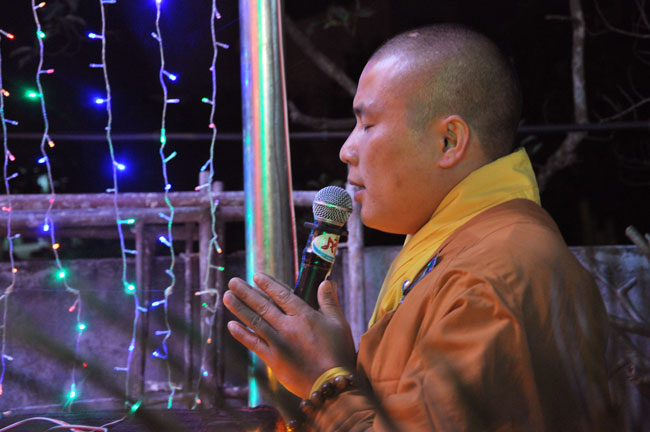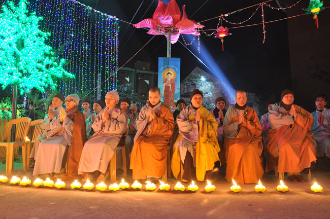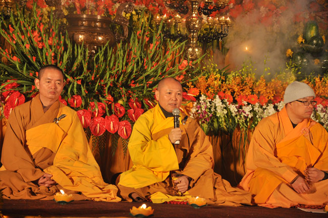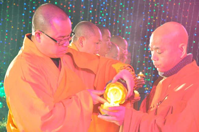 Giữa màn đêm giá lạnh của mùa đông, hàng nghìn ngọn nến lung linh tỏa sáng, sưởi ấm cho toàn thể đại chúng tham dự. Trước sự thanh tịnh trang nghiêm của đại chúng, Thượng tọa đại diện chư tôn đức chứng minh có lời pháp nhủ đến quý Phật tử. Thượng tọa nói về những thứ tài sản mà người Phật tử cần phải có, đó là tín tài, giới tài, văn tài, thí tài và tuệ tài. Đây là những tài sản có được nhờ sự tu tập và thực hành. Tài sản này mới thật bền chắc, không những hưởng được ở đời này mà còn mãi mãi các đời sau. Thượng toạ cũng giải thích về ý nghĩa của bốn chữ A Di Đà Phật có nghĩa là vô lượng quang và vô lượng thọ. Mỗi người nên phát huy trí tuệ của mình đó chính là vô lượng quang. Cống hiến cuộc đời mình phục vụ lợi ích an lạc cho chúng sinh, tên tuổi mình sống mãi trong lòng mọi người đó cũng chính là vô lượng thọ. Trí tuệ khác với thông minh. Có trí tuệ là người nhìn thấy rõ thực tướng của vũ trụ nhân sinh, hướng đến con đường giác ngộ giải thoát, luôn đem lại lợi ích và an vui cho chúng sanh. Còn thông minh lanh lợi của con người nếu bị tham sân si sai khiến sẽ đem lại nỗi sợ hãi và khổ đau cho nhân thế, chẳng hạn như con người đã vận dụng cái thông minh của mình, chế tạo các loại vũ khí giết người hàng loạt, đây chính là hậu quả của sự thông minh. Qua đó Thượng toạ khuyên quý Phật tử phát huy trí tuệ từ giáo pháp của đức Phật, làm lành lánh dữ, giúp đỡ mọi người, làm cho Phật pháp càng được lan truyền xa rộng đến mọi tầng lớp trong xã hội, để mọi người đều sống an vui hạnh phúc ở hiện tại và vị lai.