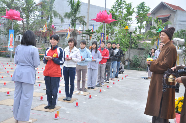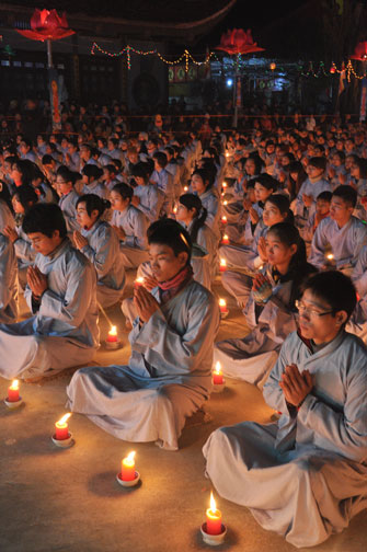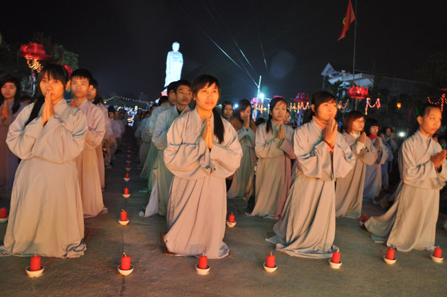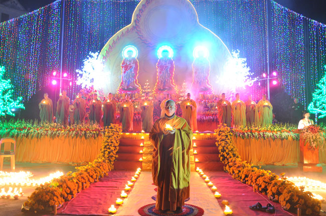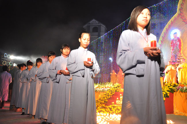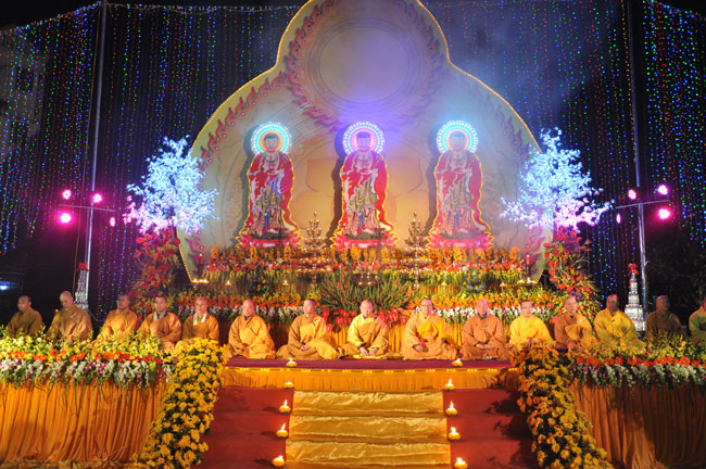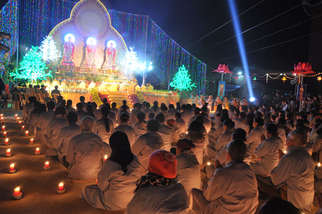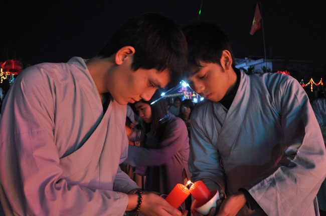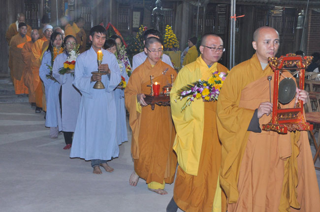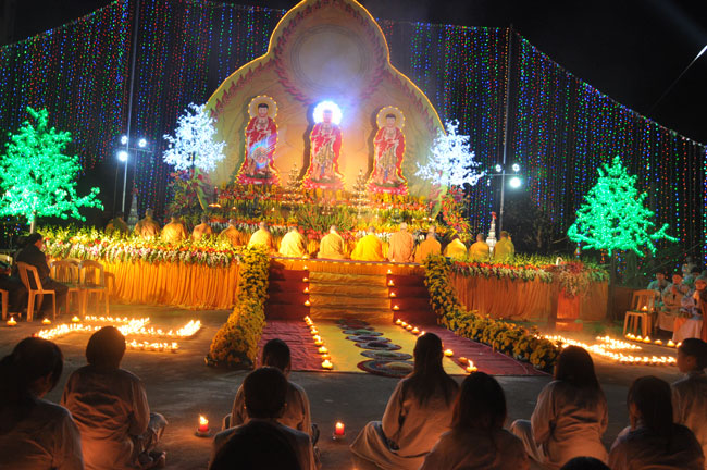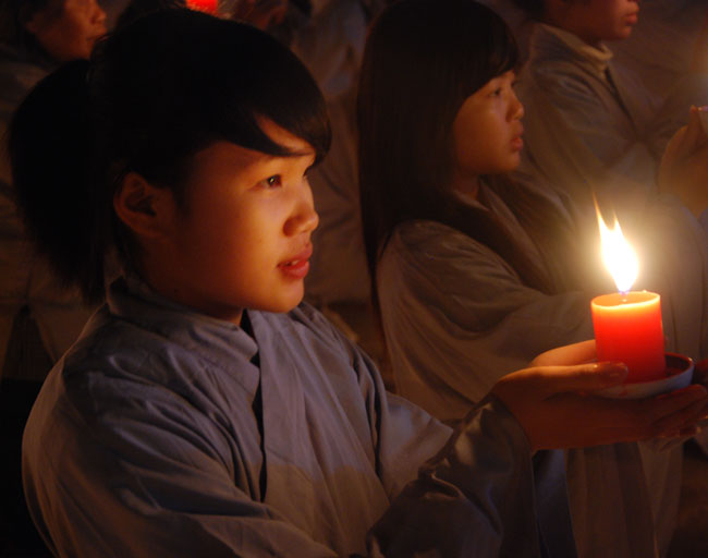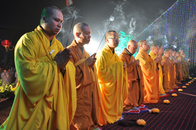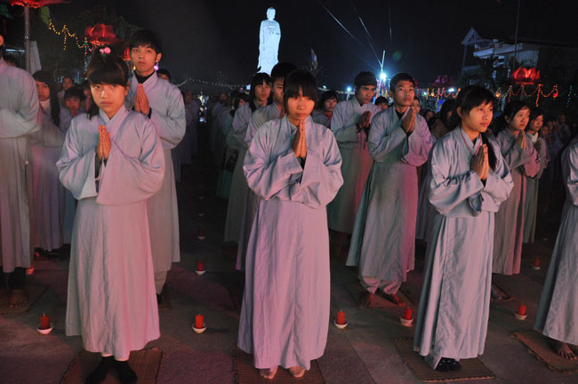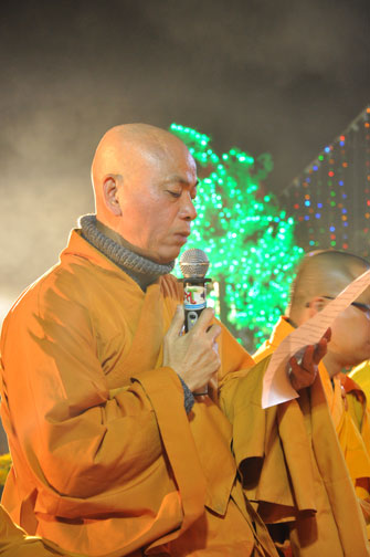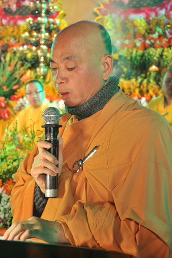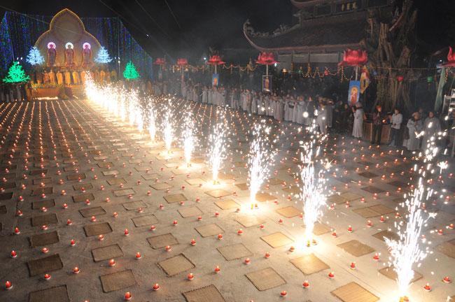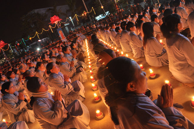 Giữa màn đêm giá lạnh của mùa đông, hàng nghìn ngọn nến lung linh tỏa sáng, sưởi ấm cho toàn thể đại chúng tham dự. Trước sự thanh tịnh trang nghiêm của đại chúng, Thượng tọa đại diện chư tôn đức chứng minh có lời pháp nhủ đến quý Phật tử. Thượng tọa nói về những thứ tài sản mà người Phật tử cần phải có, đó là tín tài, giới tài, văn tài, thí tài và tuệ tài. Đây là những tài sản có được nhờ sự tu tập và thực hành. Tài sản này mới thật bền chắc, không những hưởng được ở đời này mà còn mãi mãi các đời sau. Thượng toạ cũng giải thích về ý nghĩa của bốn chữ A Di Đà Phật có nghĩa là vô lượng quang và vô lượng thọ. Mỗi người nên phát huy trí tuệ của mình đó chính là vô lượng quang. Cống hiến cuộc đời mình phục vụ lợi ích an lạc cho chúng sinh, tên tuổi mình sống mãi trong lòng mọi người đó cũng chính là vô lượng thọ. Trí tuệ khác với thông minh. Có trí tuệ là người nhìn thấy rõ thực tướng của vũ trụ nhân sinh, hướng đến con đường giác ngộ giải thoát, luôn đem lại lợi ích và an vui cho chúng sanh. Còn thông minh lanh lợi của con người nếu bị tham sân si sai khiến sẽ đem lại nỗi sợ hãi và khổ đau cho nhân thế, chẳng hạn như con người đã vận dụng cái thông minh của mình, chế tạo các loại vũ khí giết người hàng loạt, đây chính là hậu quả của sự thông minh. Qua đó Thượng toạ khuyên quý Phật tử phát huy trí tuệ từ giáo pháp của đức Phật, làm lành lánh dữ, giúp đỡ mọi người, làm cho Phật pháp càng được lan truyền xa rộng đến mọi tầng lớp trong xã hội, để mọi người đều sống an vui hạnh phúc ở hiện tại và vị lai.