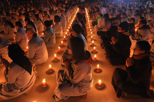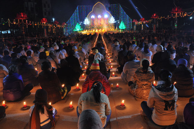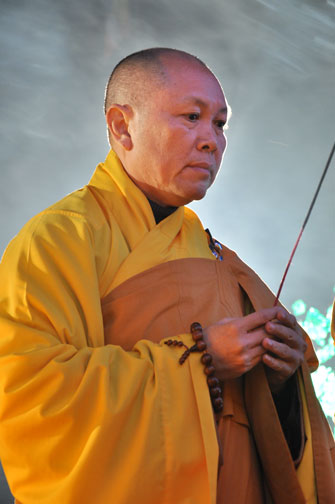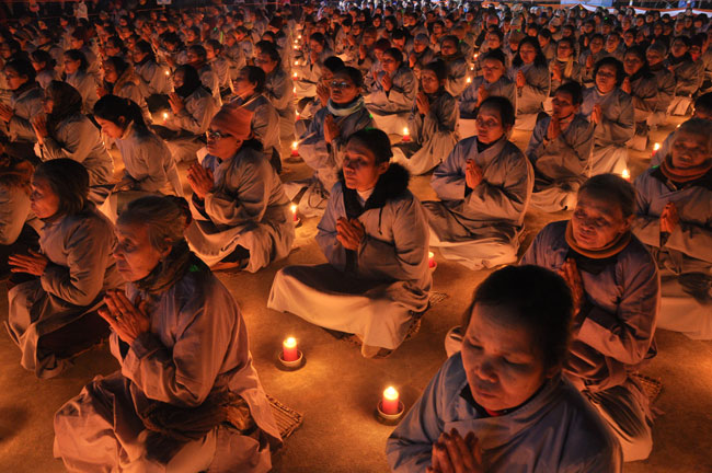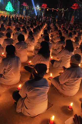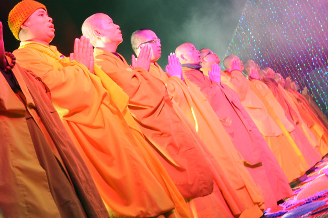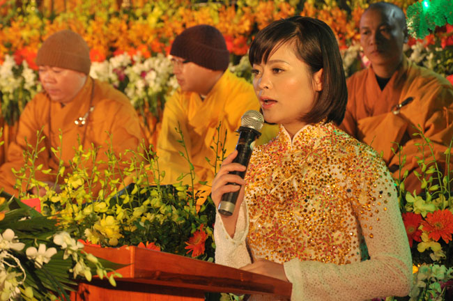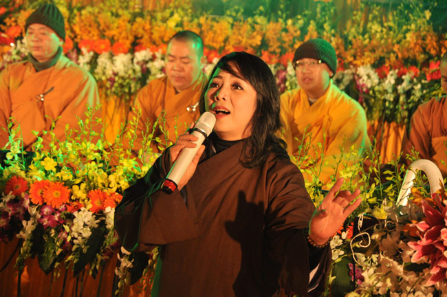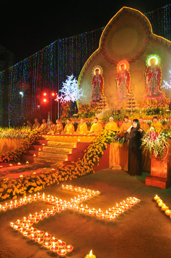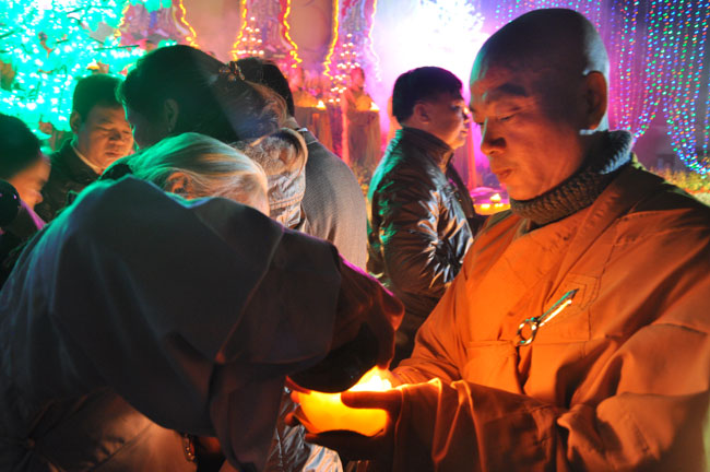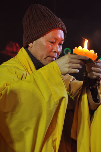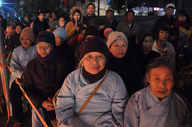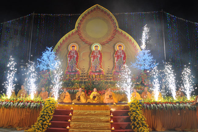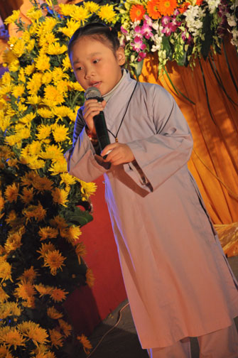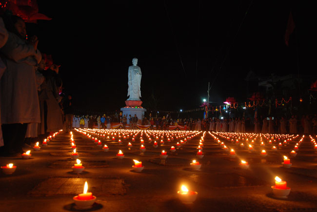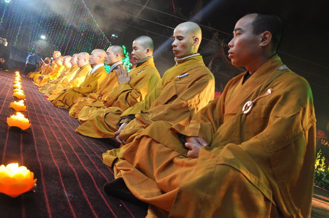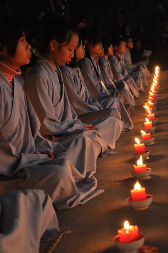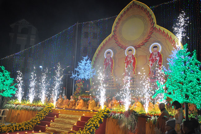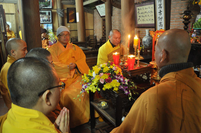 Giữa màn đêm giá lạnh của mùa đông, hàng nghìn ngọn nến lung linh tỏa sáng, sưởi ấm cho toàn thể đại chúng tham dự. Trước sự thanh tịnh trang nghiêm của đại chúng, Thượng tọa đại diện chư tôn đức chứng minh có lời pháp nhủ đến quý Phật tử. Thượng tọa nói về những thứ tài sản mà người Phật tử cần phải có, đó là tín tài, giới tài, văn tài, thí tài và tuệ tài. Đây là những tài sản có được nhờ sự tu tập và thực hành. Tài sản này mới thật bền chắc, không những hưởng được ở đời này mà còn mãi mãi các đời sau. Thượng toạ cũng giải thích về ý nghĩa của bốn chữ A Di Đà Phật có nghĩa là vô lượng quang và vô lượng thọ. Mỗi người nên phát huy trí tuệ của mình đó chính là vô lượng quang. Cống hiến cuộc đời mình phục vụ lợi ích an lạc cho chúng sinh, tên tuổi mình sống mãi trong lòng mọi người đó cũng chính là vô lượng thọ. Trí tuệ khác với thông minh. Có trí tuệ là người nhìn thấy rõ thực tướng của vũ trụ nhân sinh, hướng đến con đường giác ngộ giải thoát, luôn đem lại lợi ích và an vui cho chúng sanh. Còn thông minh lanh lợi của con người nếu bị tham sân si sai khiến sẽ đem lại nỗi sợ hãi và khổ đau cho nhân thế, chẳng hạn như con người đã vận dụng cái thông minh của mình, chế tạo các loại vũ khí giết người hàng loạt, đây chính là hậu quả của sự thông minh. Qua đó Thượng toạ khuyên quý Phật tử phát huy trí tuệ từ giáo pháp của đức Phật, làm lành lánh dữ, giúp đỡ mọi người, làm cho Phật pháp càng được lan truyền xa rộng đến mọi tầng lớp trong xã hội, để mọi người đều sống an vui hạnh phúc ở hiện tại và vị lai.