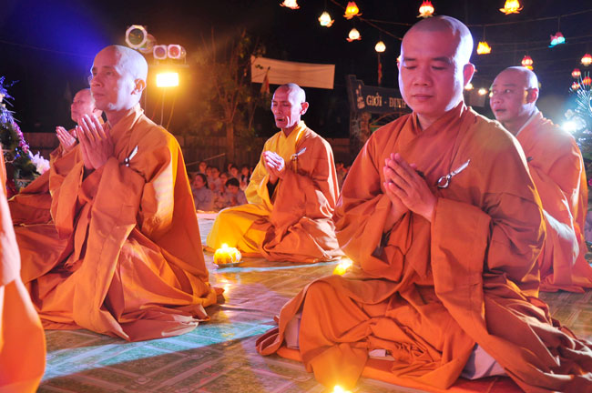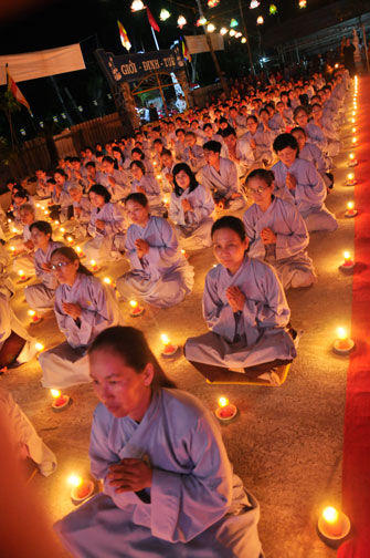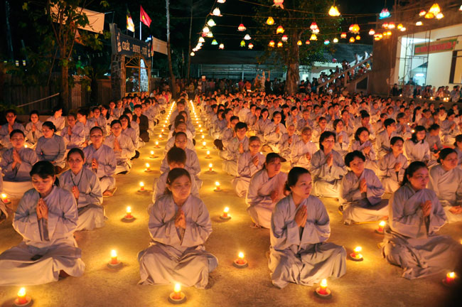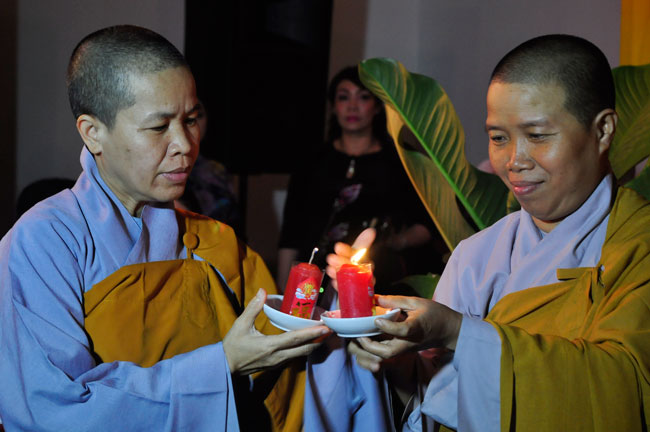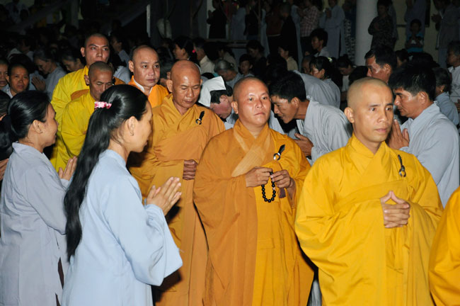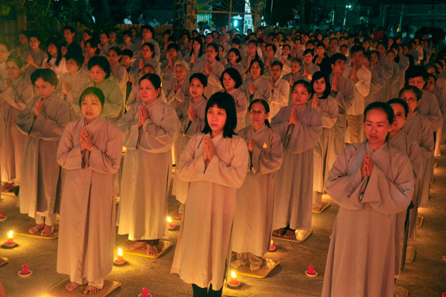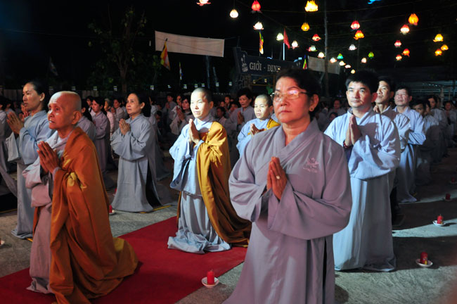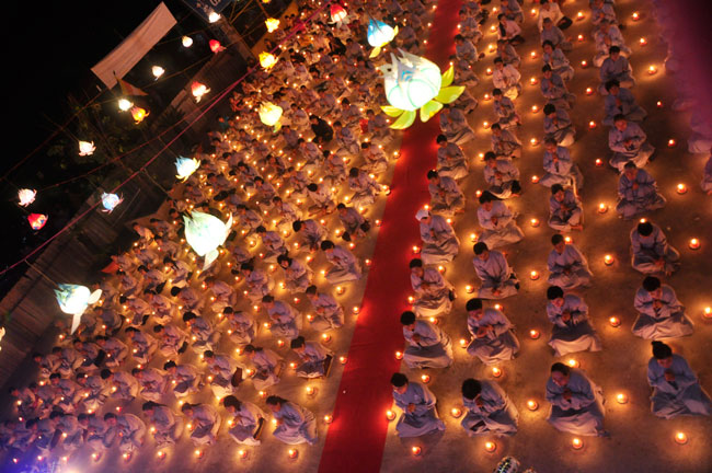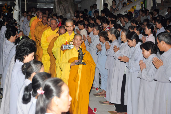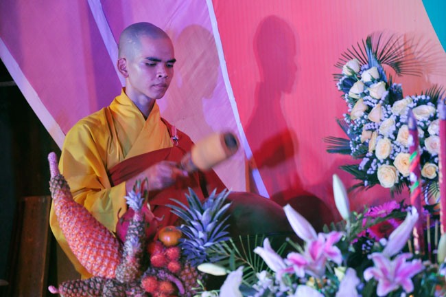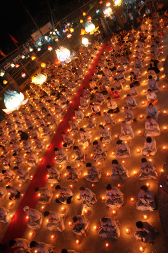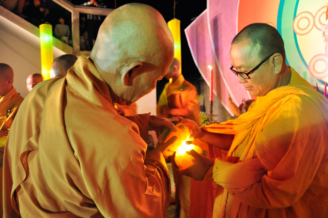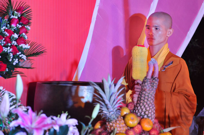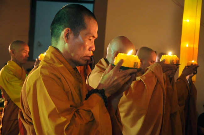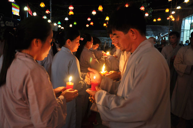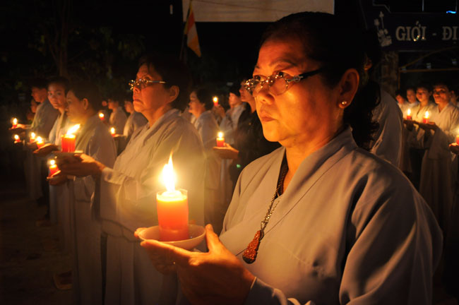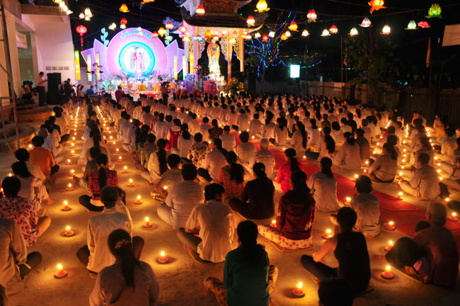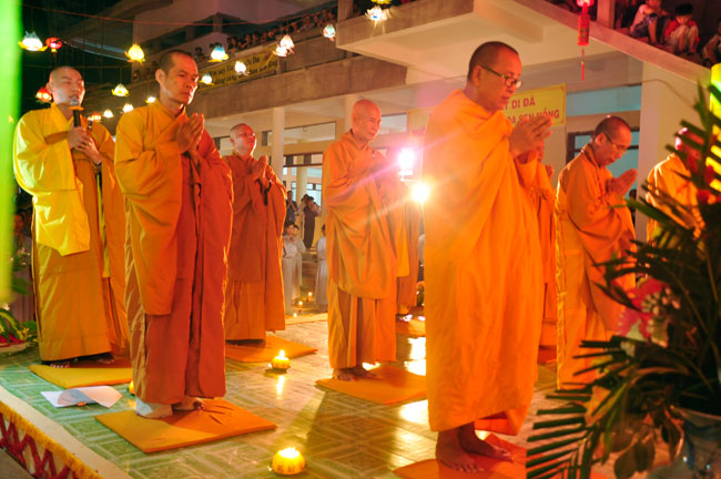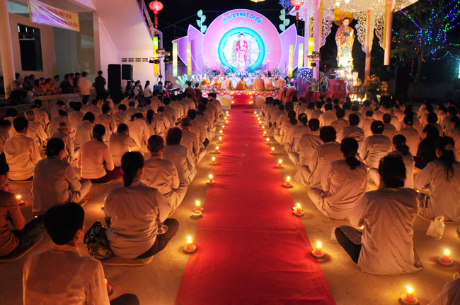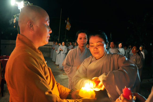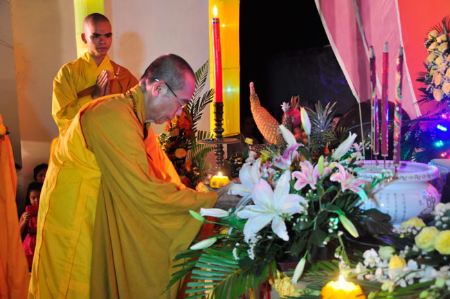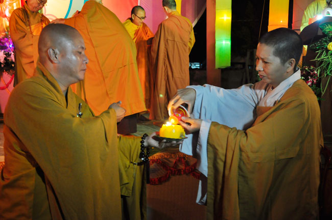 Đêm lễ diễn ra trong không khí trang nghiêm và thanh tịnh, với giọng đọc trầm ấm Đại đức Thích Tâm Hùng đã khai mạc đêm hội bằng phần tuyên đọc diễn văn khai mạc, tiếp đến là nghi thức truyền đăng do Chư tôn Hòa thượng khởi điểm - thắp nến từ bàn Phật rồi truyền trao cho Đại đức trụ trì, ánh sáng từ đó được lan truyền và tỏa sáng trong sân lễ. Những ngọn nến ấy mang thông điệp của tình yêu thương, lòng từ bi lan tỏa khắp nơi nơi, mang những điều nguyện cầu tốt đẹp cho toàn nhân loại. Nâng ngọn nến trong tay mọi người như thấy ấm lòng hơn, hiền hòa hơn và cảm nhận được niềm hạnh phúc trong chính mình mà từ lâu đã bị màn đêm vô minh che lấp.