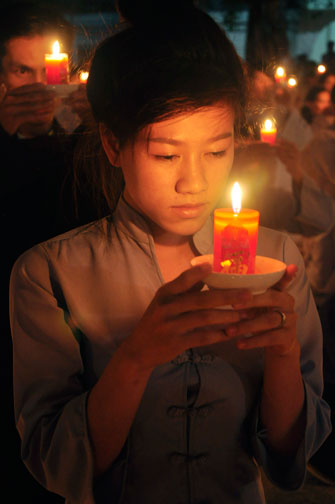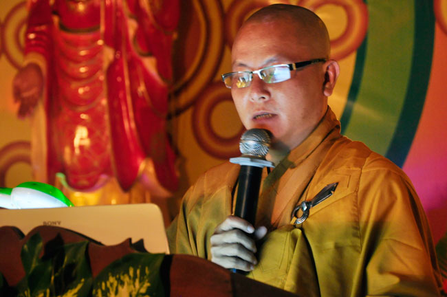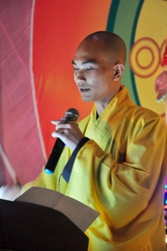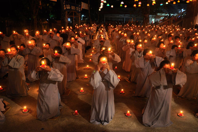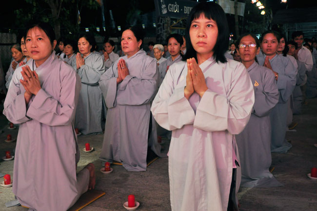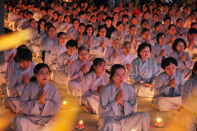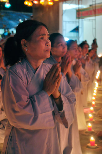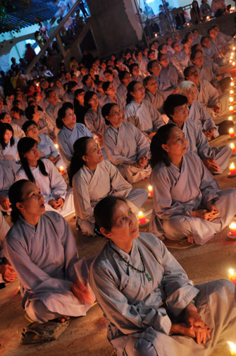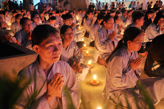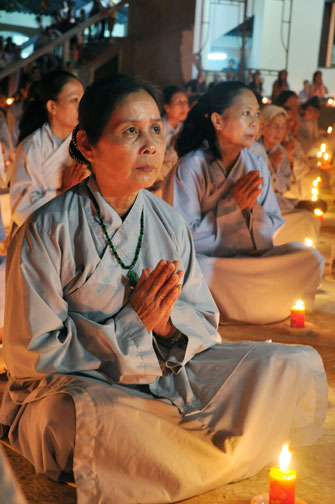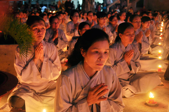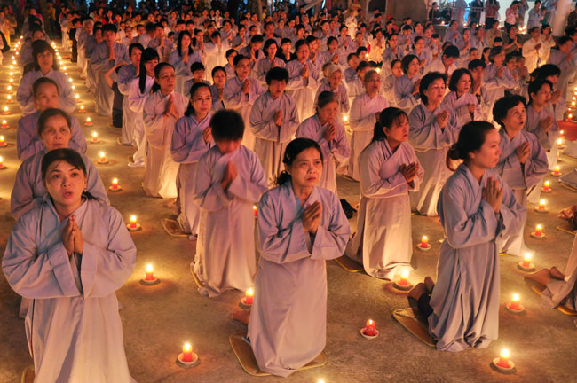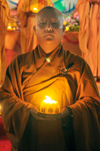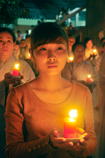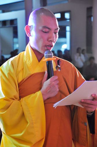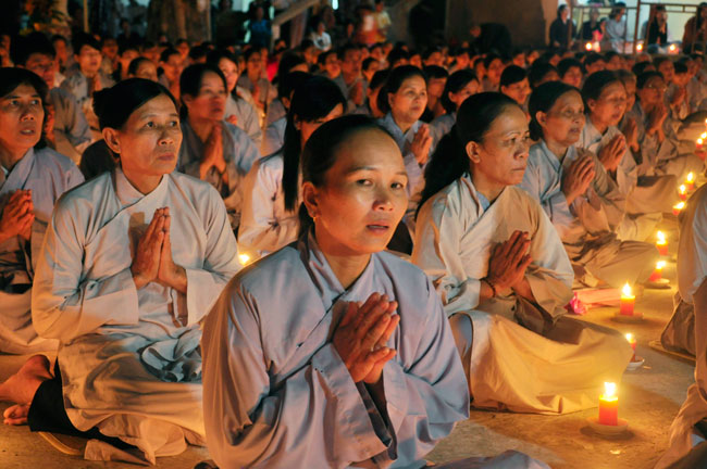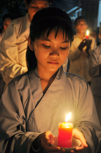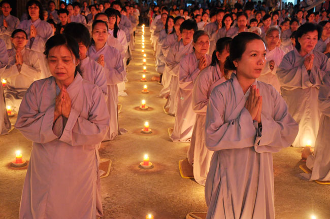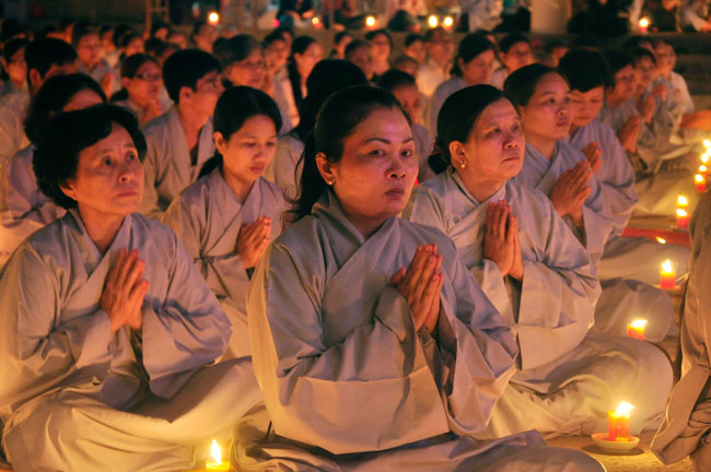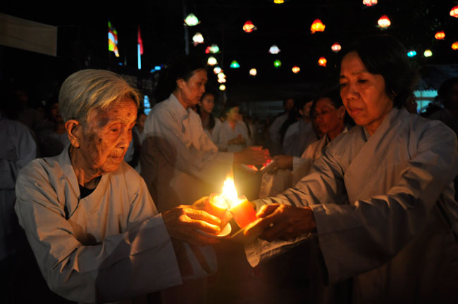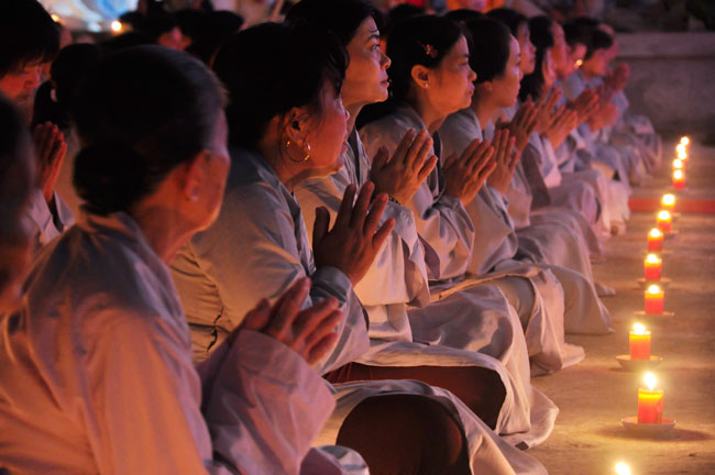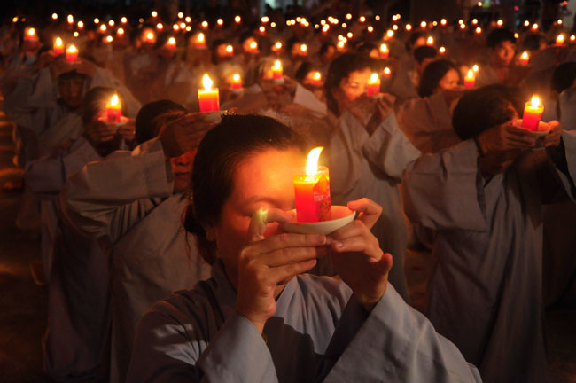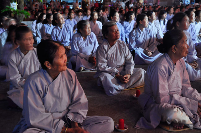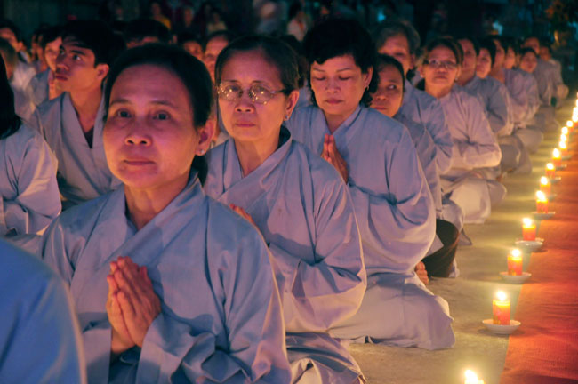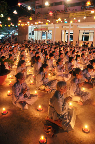 Đêm lễ diễn ra trong không khí trang nghiêm và thanh tịnh, với giọng đọc trầm ấm Đại đức Thích Tâm Hùng đã khai mạc đêm hội bằng phần tuyên đọc diễn văn khai mạc, tiếp đến là nghi thức truyền đăng do Chư tôn Hòa thượng khởi điểm - thắp nến từ bàn Phật rồi truyền trao cho Đại đức trụ trì, ánh sáng từ đó được lan truyền và tỏa sáng trong sân lễ. Những ngọn nến ấy mang thông điệp của tình yêu thương, lòng từ bi lan tỏa khắp nơi nơi, mang những điều nguyện cầu tốt đẹp cho toàn nhân loại. Nâng ngọn nến trong tay mọi người như thấy ấm lòng hơn, hiền hòa hơn và cảm nhận được niềm hạnh phúc trong chính mình mà từ lâu đã bị màn đêm vô minh che lấp.