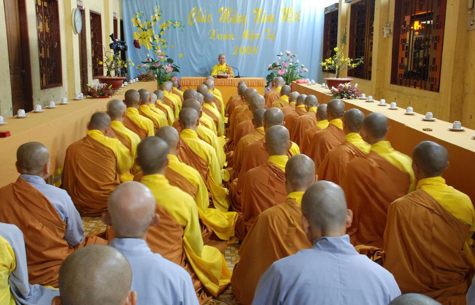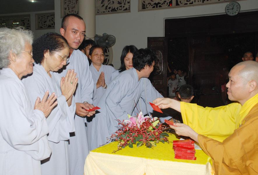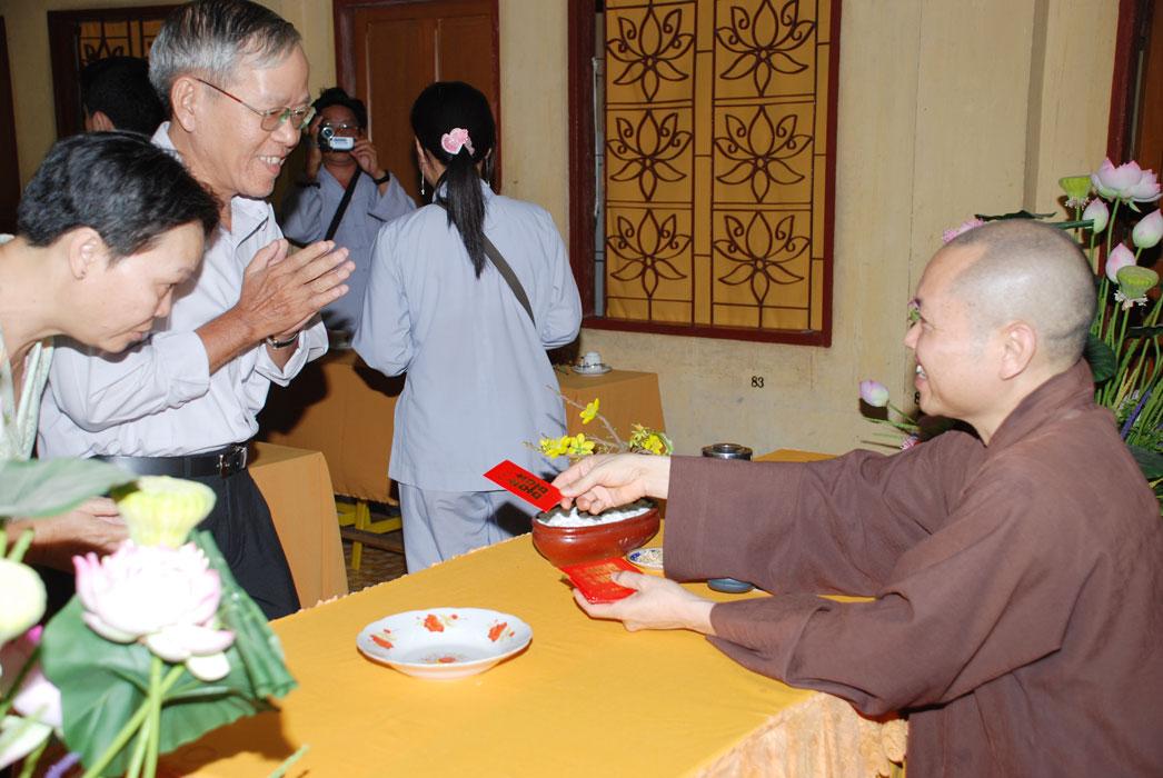 Sau lễ đón giao thừa tại chánh điện, Tăng chúng và Phật tử bổn tự đã vân tập về Tổ Đường dâng lời chúc Tết lên TT. Thích Chân Tính và lắng nghe đạo từ của Thượng tọa trụ trì. Thầy đã tán thán tinh thần tu học của đại chúng và sơ lược về những thành tích hoạt động Phật sự trong năm qua đã hoằng dương Phật Pháp gần như hầu khắp ba miền Bắc, Trung, Nam của đất nước và cả quý Phật tử ngoài nước, thông qua trang thông tin điện tử http://www.chuahoangphap.com.vn và kinh, sách, VCD…Đồng thời, qua buổi nói chuyện thầy cũng đã nêu ra những mặt hạn chế cần khắc phục, báo cáo tình hình tu tập của tăng chúng. Cuối cùng là lời chúc trân quý đến toàn thể chư Tăng và Phật tử tại bổn tự nhằm sách tấn và phát huy hơn nữa trong việc tu học và hoằng pháp.