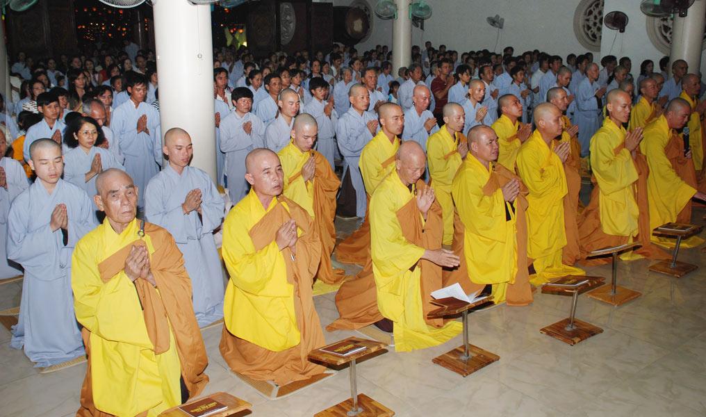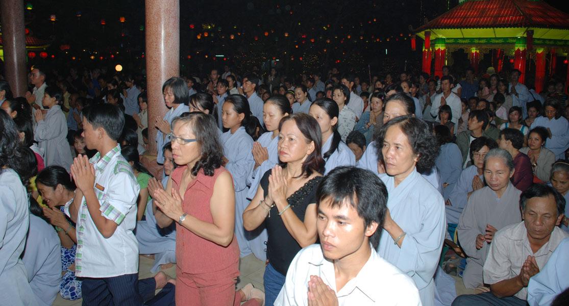 Đại chúng niêm hương bạch Phật và tụng kinh trong đêm giao thừa