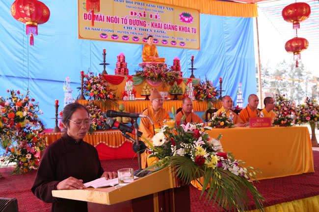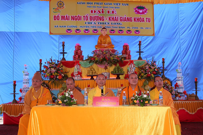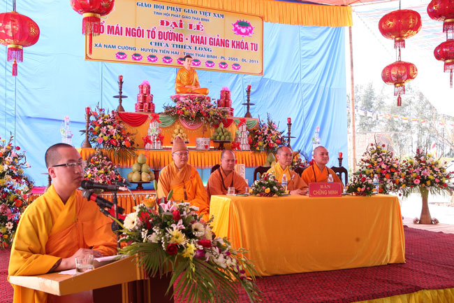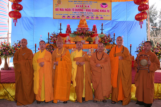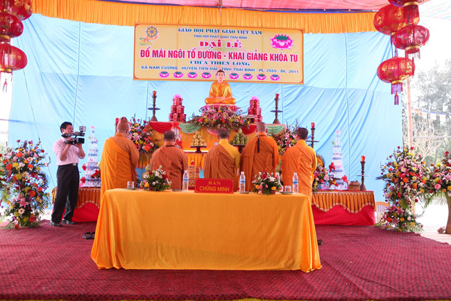Nhận lời thỉnh của Đại đức Thích Thanh Vượng trụ trì chùa Thiên Long – xã Nam Cường – huyện Tiền Hải – tỉnh Thái Bình, sáng nay ngày 12 tháng 4 năm 2011, Thượng tọa Thích Chân Tính đã hoan hỷ quang lâm tham dự và chứng minh buổi lễ đặt nóc ngôi Tổ đường và khai khóa tu niệm Phật một ngày.