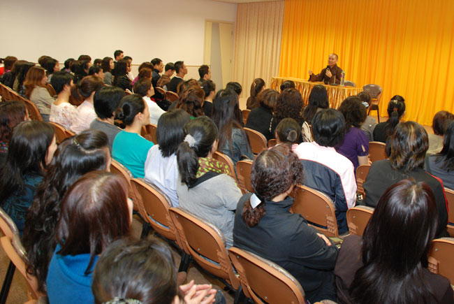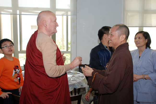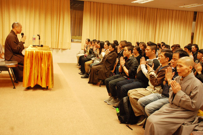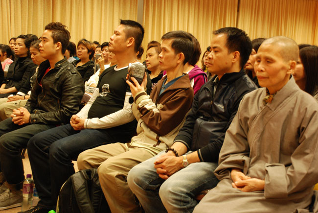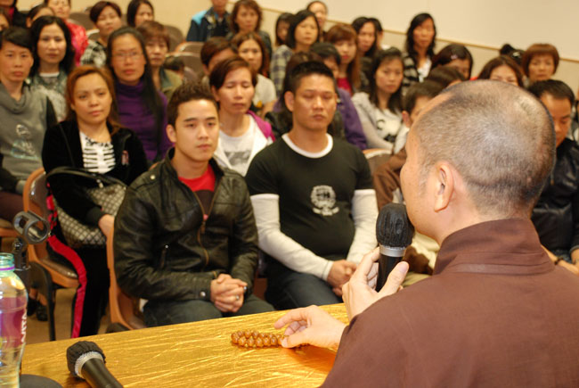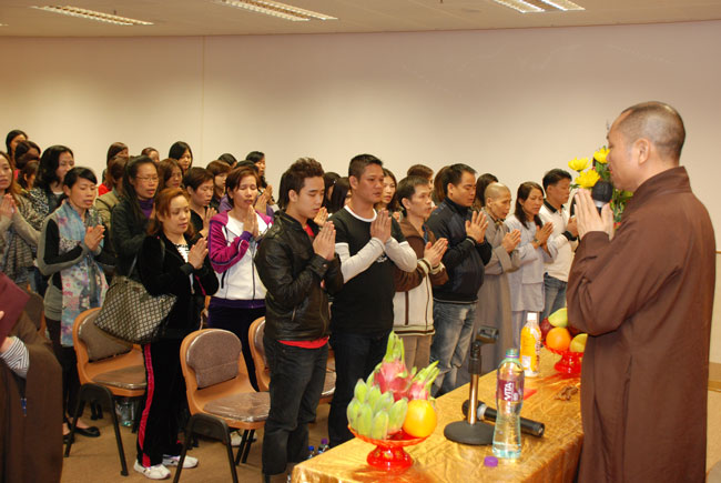 Điểm đầu tiên Thượng tọa đến thăm là chùa Lam Tei – Tuen Mun – Hồng Kông. Sau khi lễ Phật và dùng cơm chay với HT. Thích Tín Quang – người Tây Đức, Thượng tọa có thời thuyết giảng tại Liên Hoa Đại Điện chùa Lam Tei cho hơn 150 kiều bào Phật tử. Tại buổi nói chuyện Thượng tọa đã tán thán quý Phật tử, mặc dù sống ở nơi xứ lạ quê người nhưng đã biết đoàn kết cùng nhau tu học, đồng thời cũng chia sẻ những khó khăn gặp phải của những người con Phật sống xa quê hương, qua đó Thượng tọa cũng nhắc nhở Phật tử, tuy bận rộn với cuộc sống mưu sinh nhưng cũng cố gắng thu xếp thời gian để về chùa tu học. Thượng tọa nhấn mạnh “Đời sống vật chất tuy cần thiết nhưng đời sống tinh thần cũng không kém phần quan trọng, là người Phật tử không những chỉ lo sự nghiệp đời này mà còn phải lo sự nghiệp cả đời sau...”. Thượng tọa cũng khuyến khích các Phật tử Việt Nam nên đoàn kết nhau xây dựng một ngôi chùa để làm nơi nương tựa tâm linh, là nơi quy tụ những người con Phật và là nơi tu tập của người Phật tử Việt Nam. Nhất là phải nên quan tâm đến thế hệ con em mình biết nguồn cội tổ tông, biết Phật pháp và ngôn ngữ mẹ đẻ. Vì hiện nay cũng có rất nhiều trẻ em người Việt mà không biết nói tiếng Việt, không hiểu gì về văn hóa Việt Nam, tương lai có thể bị mất gốc.