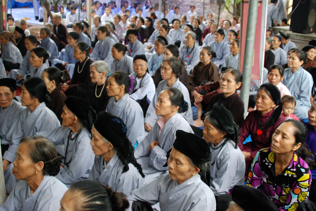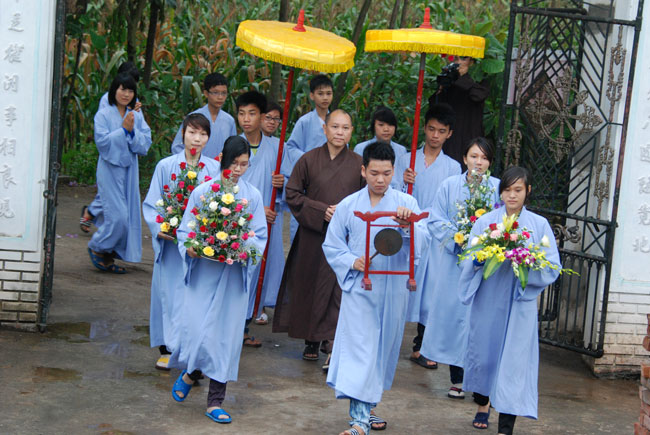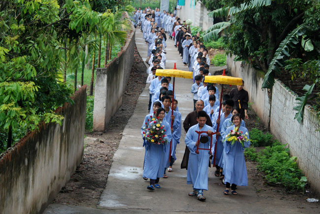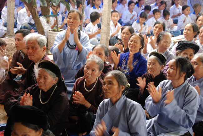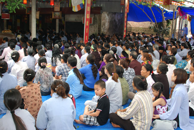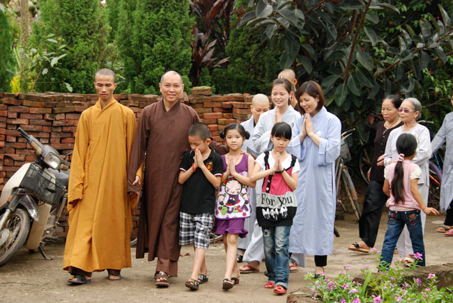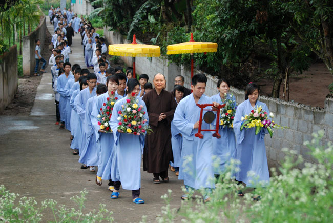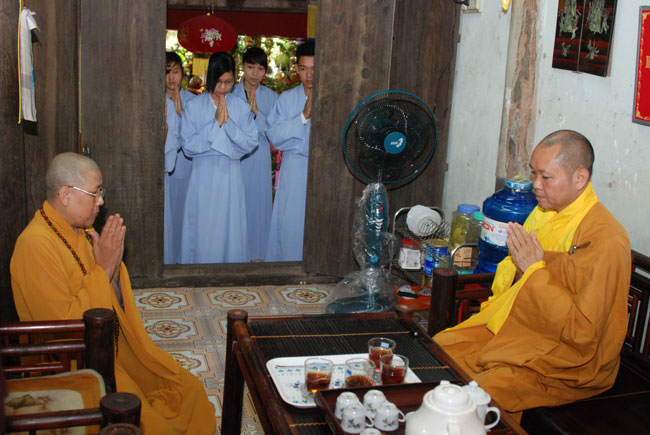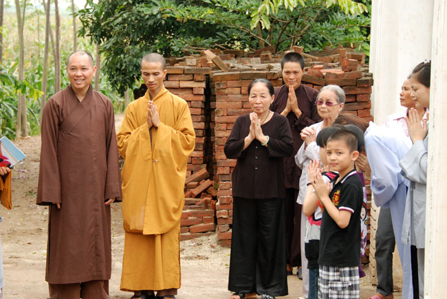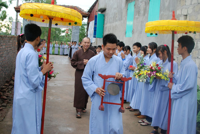 Với nhân duyên ấy, đúng 8 giờ sáng Thượng tọa đã đến chùa Hoàng Xá. Và thật cảm động vì ngay từ đường vào chùa, quý Phật tử đã trang nghiêm chắp tay xếp thành hai hàng cung đón Thượng tọa.