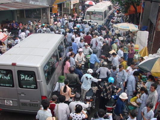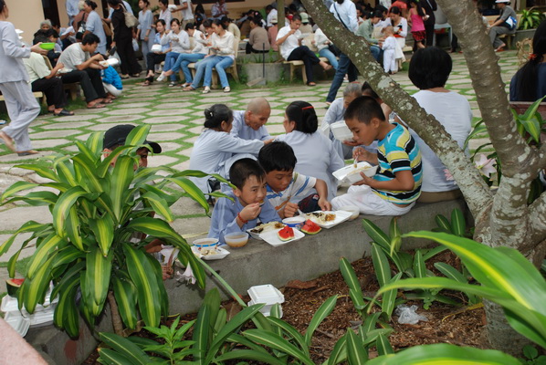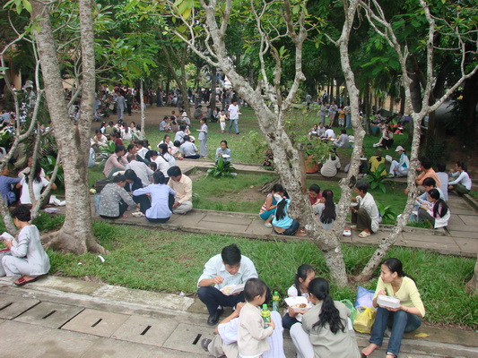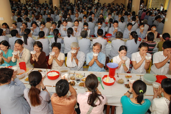Các trai đường quá tải. Phật tử phải dùng cơm ở sân chùa
