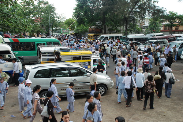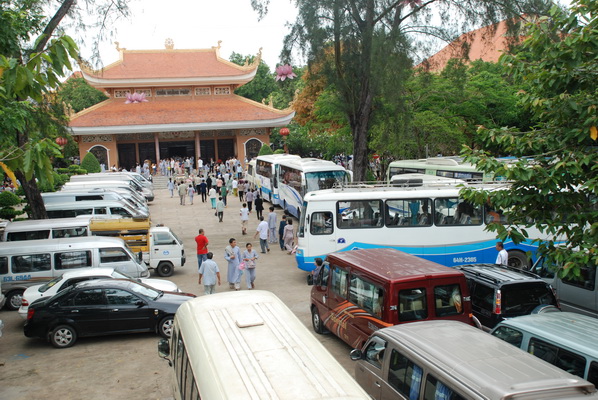 Từ rất sớm, sân chùa Hoằng Pháp đã có khá nhiều xe du lịch, xe ô tô, xe gắn máy của các đoàn Phật tử từ khắp nơi về dự tu niệm Phật đậu kín cả sân.