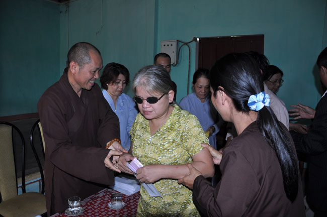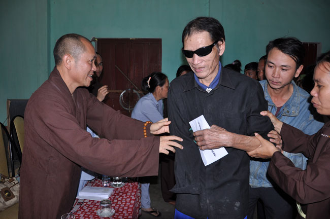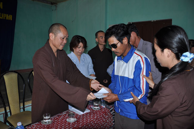 Nằm không xa TX. Đông Hà chỉ mất khỏang 20 phút đi xe, đoàn đã có mặt tại Huyện Hội Người Mù Triệu Phong, tọa lạc tại TK5 – TT Ái Tử - Triệu Phong – Quảng Trị. Nơi đây chỉ là một căn nhà nhỏ nằm khiêm tốn trong một khuôn viên rộng của một sân bay bỏ hoang, nhưng cũng chính trong ngôi nhà nhỏ đó đang chứa đựng những mảnh đời bất hạnh, những con người không còn nhìn thấy được ánh sáng của cuộc đời. Đồng cảm và chia sẻ trước những mảnh đời bất hạnh đó, Thượng Tọa Thích Chân Tính đã mở đầu bằng những lời lẽ động viên và khích lệ tinh thần đến những hội viên nơi đây. Để góp phần giúp cho những hội viên vượt qua giai đoạn khó khăn và ổn định cuộc sống đoàn đã gửi 157 phần quà đến tất cả những hội viên, mỗi phần quà trị giá 400 ngàn đồng và một đĩa VCD “Biết Lỗi Nên Sửa”. do TT giảng. Mặc dù giá trị mỗi phần quà không nhiều nhưng đó là tinh thần nhường cơm sẻ áo mà quý Phật tử trong và ngoài nước đã gửi tặng, với mong muốn chia sẻ bớt những nỗi đau mà mọi người nơi đây phải gánh chịu.