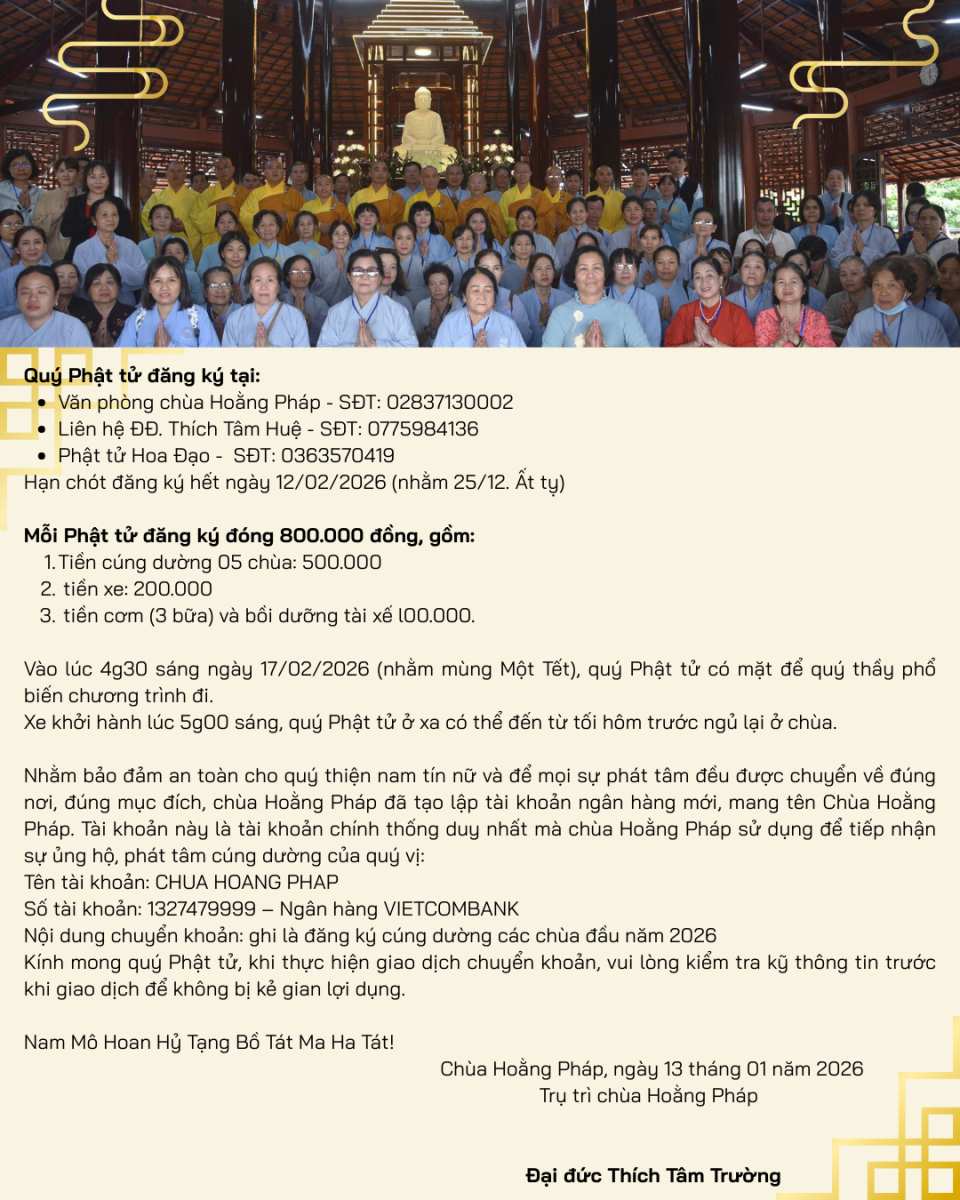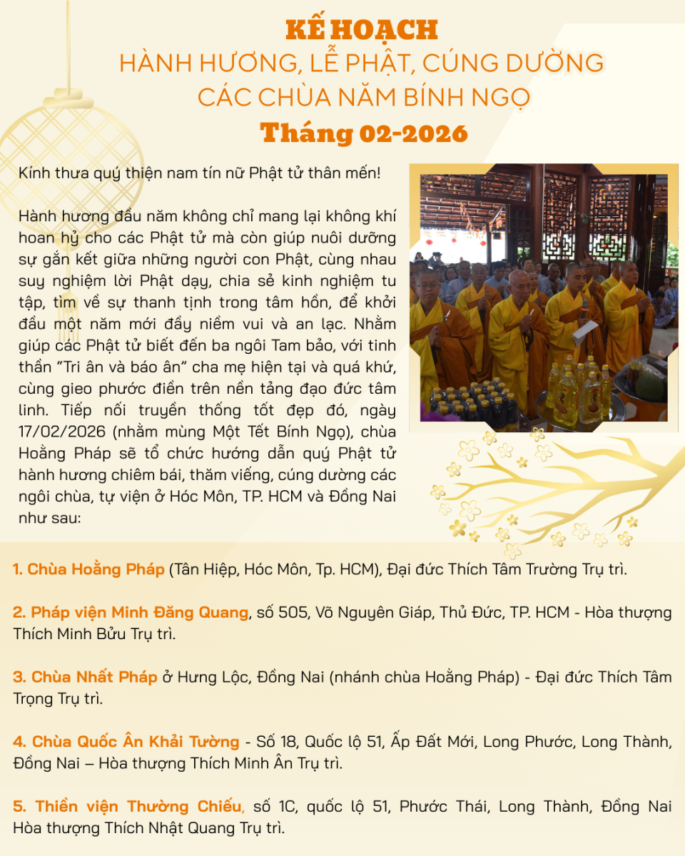 Hoạt động Phật sự Kế hoạch Từ Thiện và Chương trình hành hương thập tự Xuân Bính Ngọ 2026 Cập nhật: 04/02/2026 ___________ Chùa Hoằng Pháp Địa chỉ: 96 Ấp 8, xã Hóc Môn, TP. Hồ Chí Minh Văn Phòng chùa: 028 3713 0002 Email: chuahoangphapvietnam@gmail.com Fanpage: https://www.facebook.com/vietnamchuahoangphap Website: https://chuahoangphap.com.vn/ Facebook Google Tweet Danh mục tin tức Tin tức liên quan Chương trình từ thiện “Phương tiện nghĩa tình”. 01/04/2026 LỄ SÁM HỐI 14/02 Bính Ngọ. 01/04/2026 Khoá tu thiếu nhi “Em về bên Phật” Lần thứ 72. 29/03/2026 Khoá tu sinh viên "Hướng về Phật pháp". 29/03/2026 Đêm thiền trà - Khóa tu sinh viên “Hướng về Phật pháp". 28/03/2026 Xem tất cả Các tin đã đưa: Xem tin đến hôm nay Xem tin trở về trước