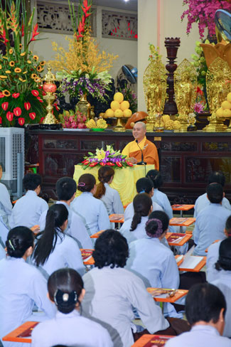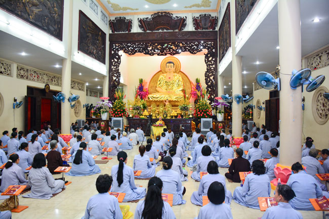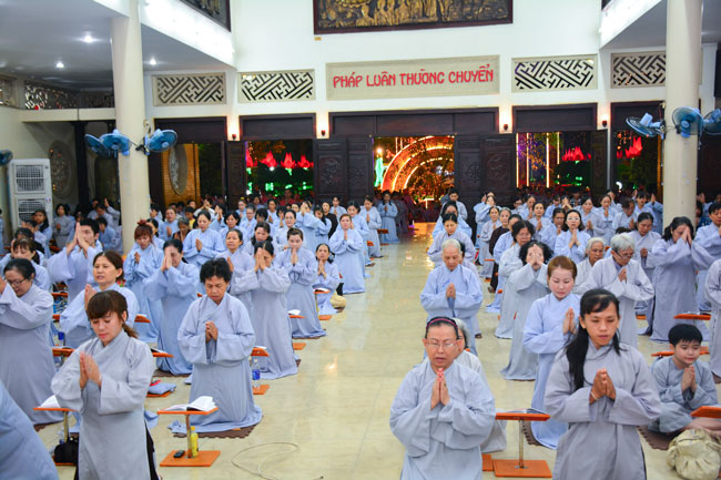 Kết thúc thời pháp thoại, đại chúng cùng lễ Hồng Danh Bảo Sám và đọc tụng giới pháp của người Phật tử tại gia.
