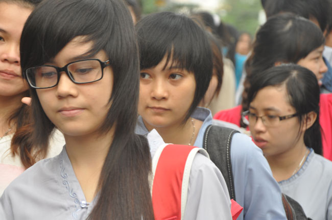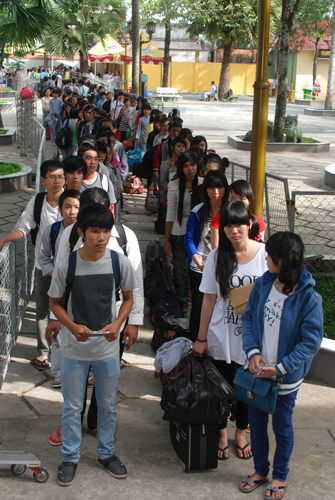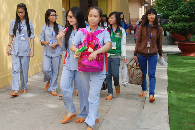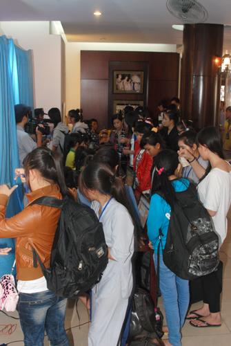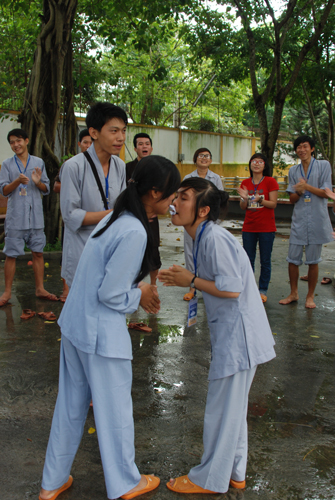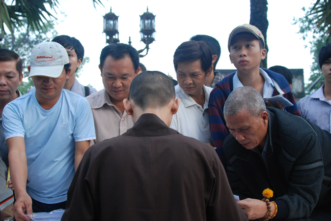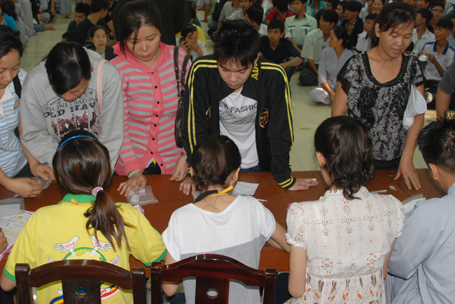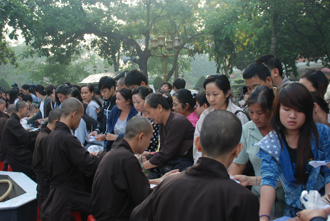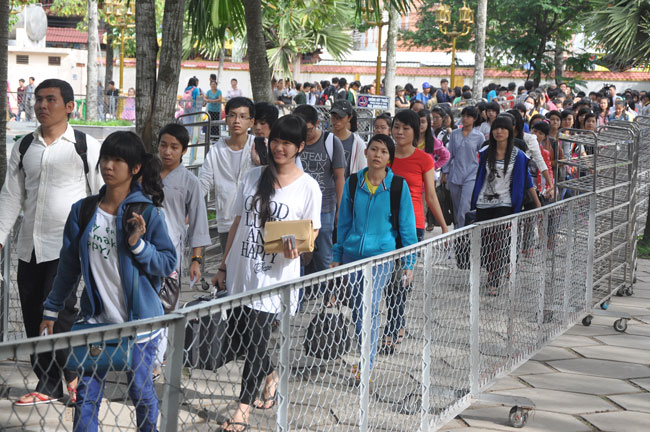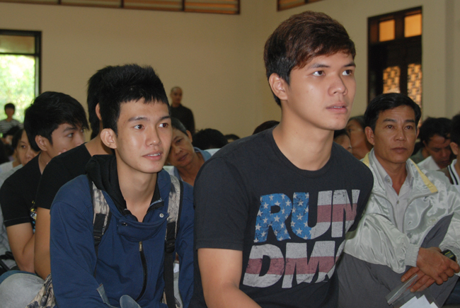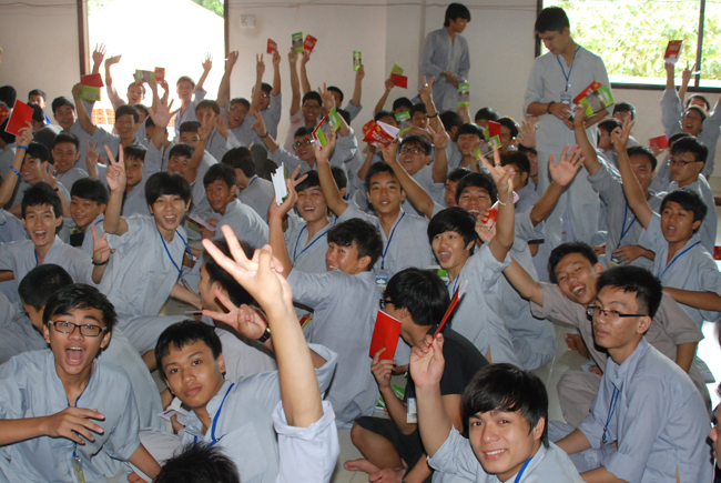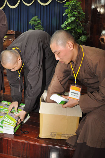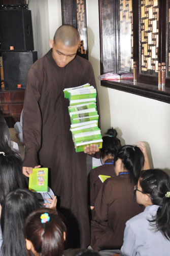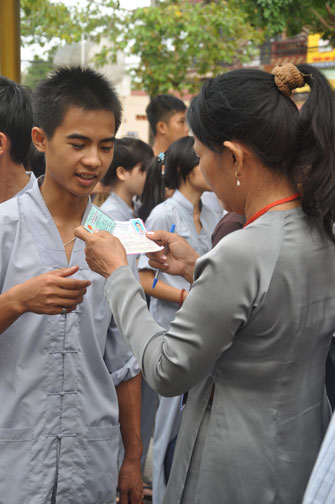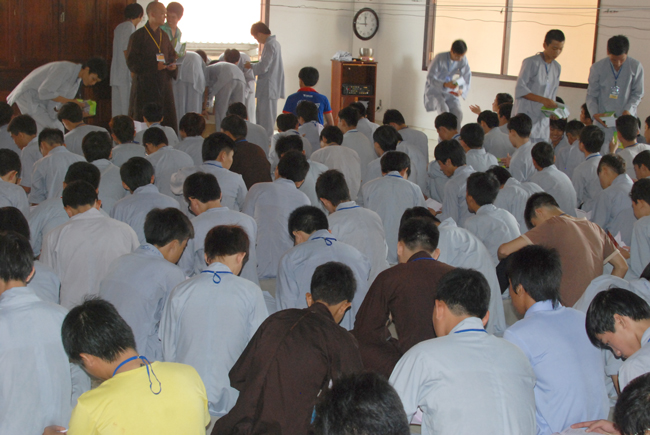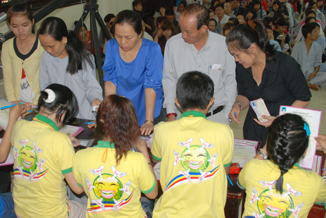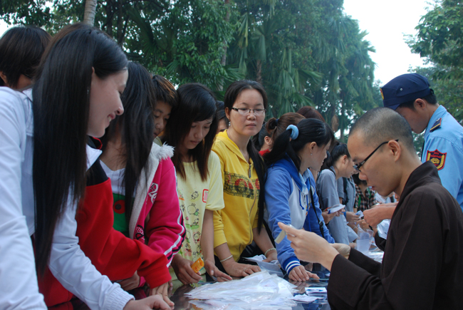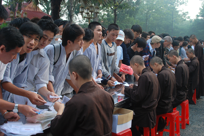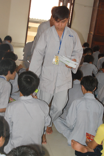 Đầu tiên, các em được quý thầy hướng dẫn gửi điện thoại, máy ảnh, MP3, MP4... và hành lý sau đó đến bàn đăng ký nhận thẻ tham dự khóa tu.