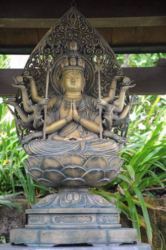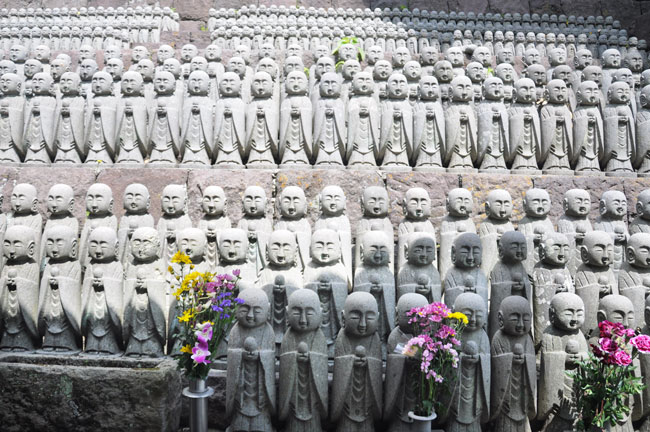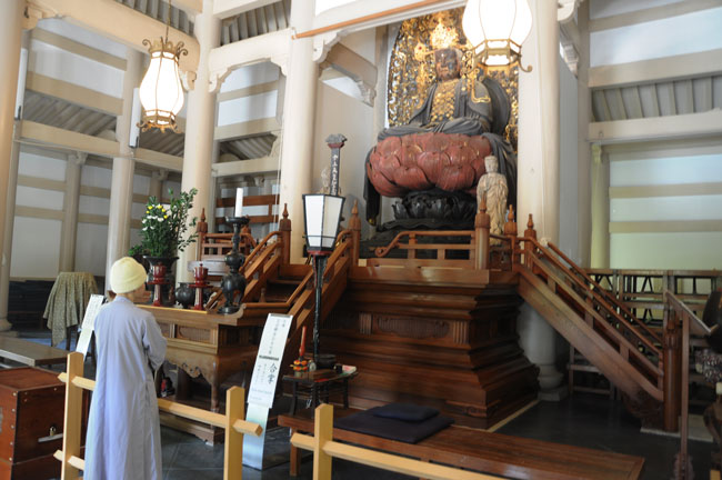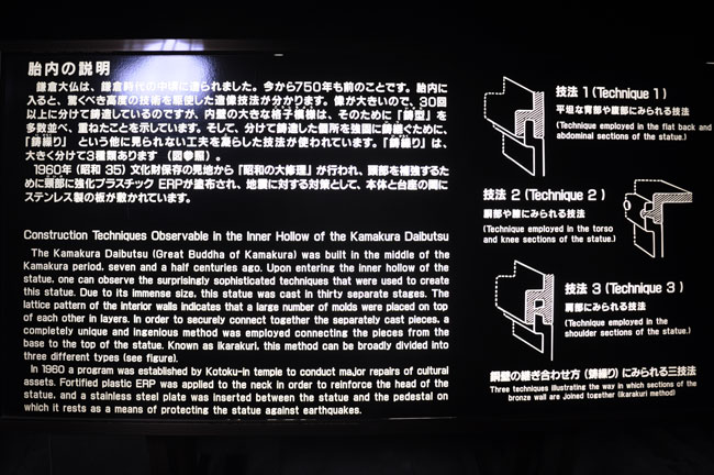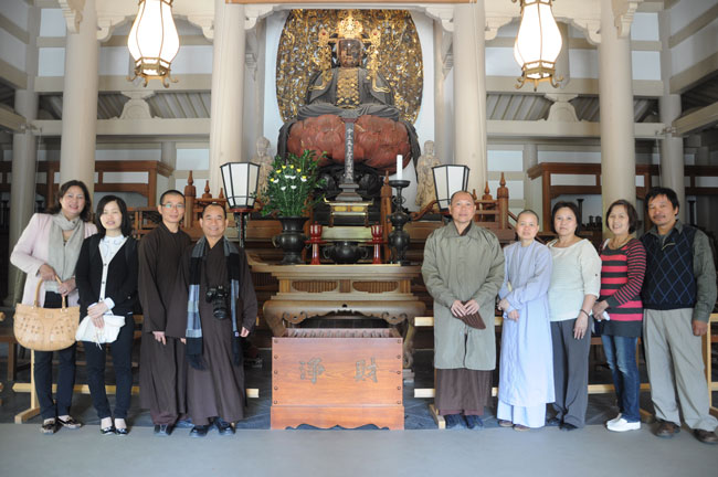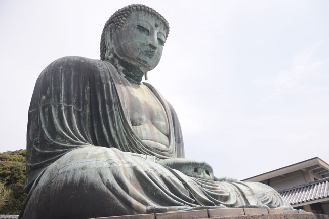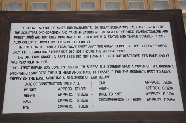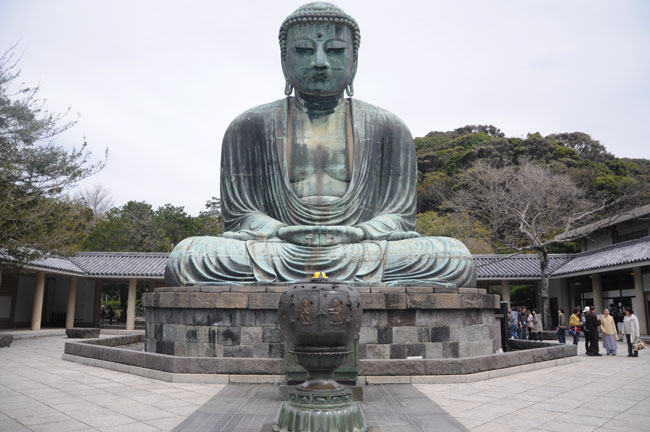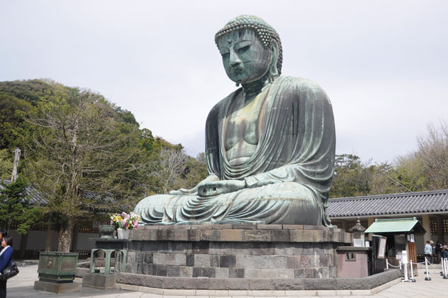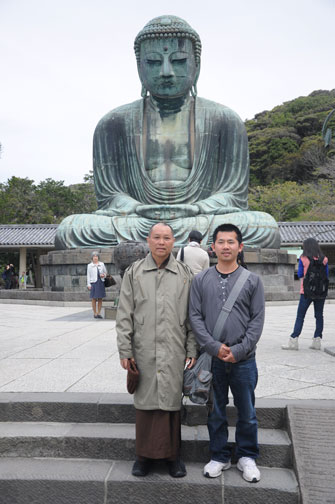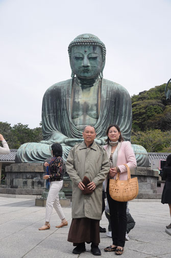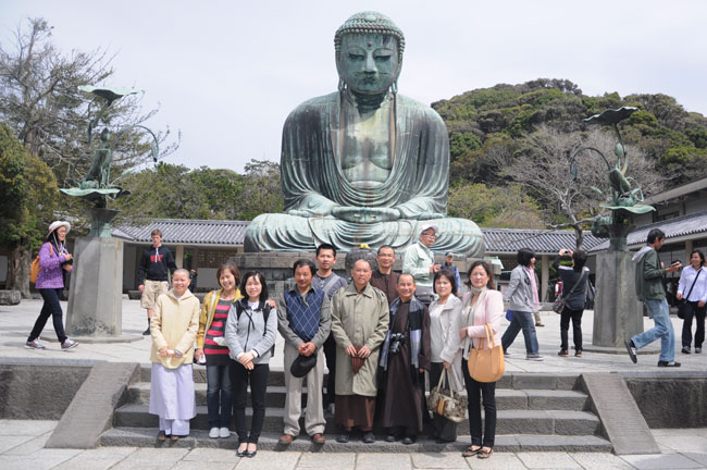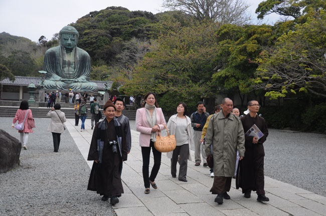 Đoàn xuất phát từ chùa Nam Hòa lúc 7h00 sáng, giờ địa phương. Sau 2 giờ xe chạy, đoàn có mặt tại thành phố Kamakura, nơi có đại tượng Phật A Di Đà bằng đồng ngồi, lớn và cổ nhất ở nơi đây. Sau khi mua vé vào bên trong, chúng tôi không khỏi ngỡ ngàng khi nhìn thấy pho tượng cổ vĩ đại, ngồi tĩnh tại trên tòa sen lớn. Với hình thái uy nghi, Daibustu là một tượng Phật ngồi bằng đồng được đúc vào năm 1252 bởi hai nhà điêu khắc Ohno Gorouemon và Taji Hisatomo theo đề xuất của bà Inadano Tsubone và nhà sư Joko, người không chỉ đề xướng ý tưởng đúc đại tượng và các đền chùa bao quanh mà còn quyên góp tiền để xây dựng. Tượng có chiều cao khoảng 13,4m, nặng khoảng 121 tấn.