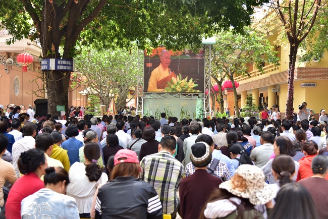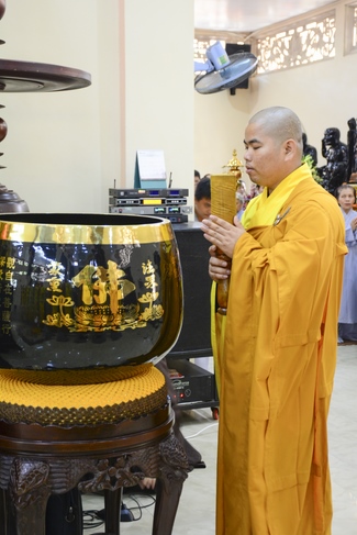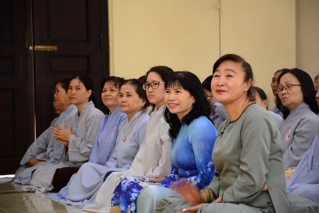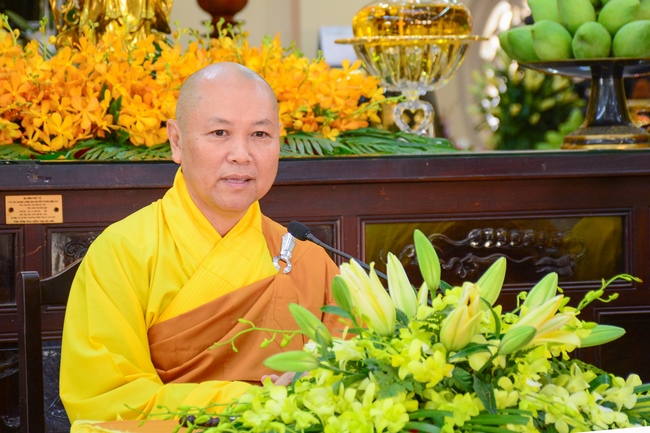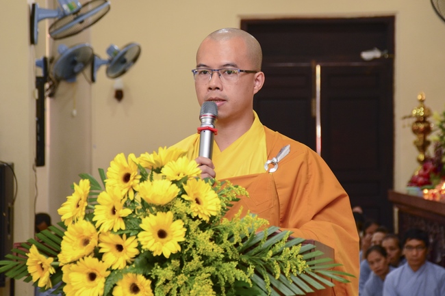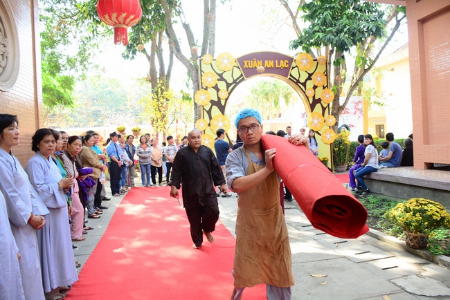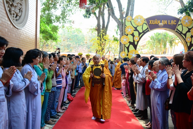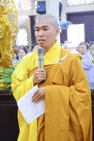 Đúng 9 giờ là nghi lễ cung nghinh chư tôn đức. Trước khi cử hành khóa lễ Cầu an đầu năm, Thượng tọa Thích Chân Tính, trụ trì chùa Hoằng Pháp đã chia sẻ cùng đại chúng một thời pháp thoại.