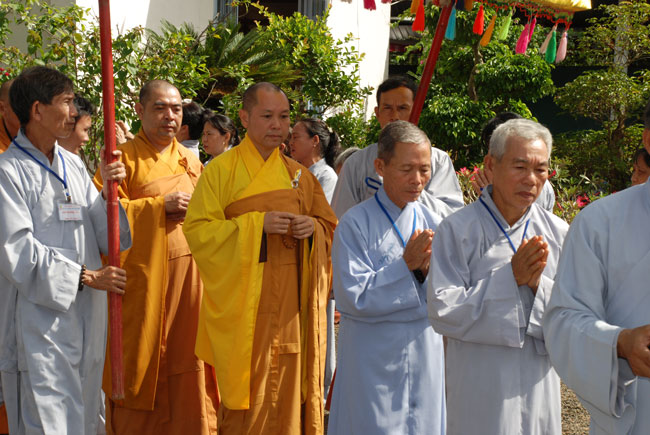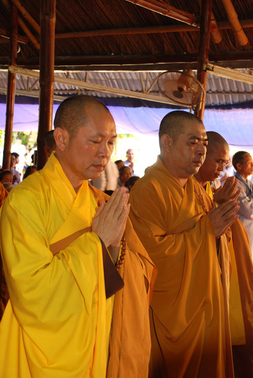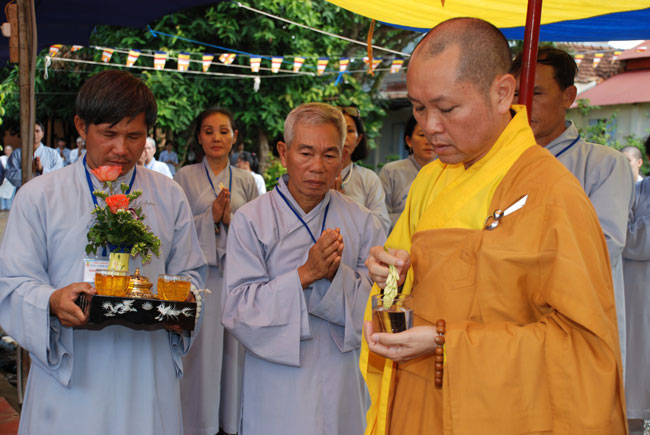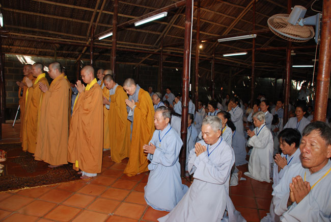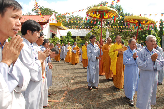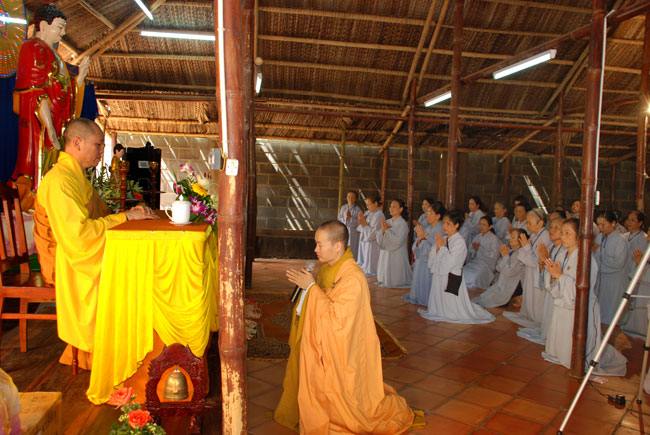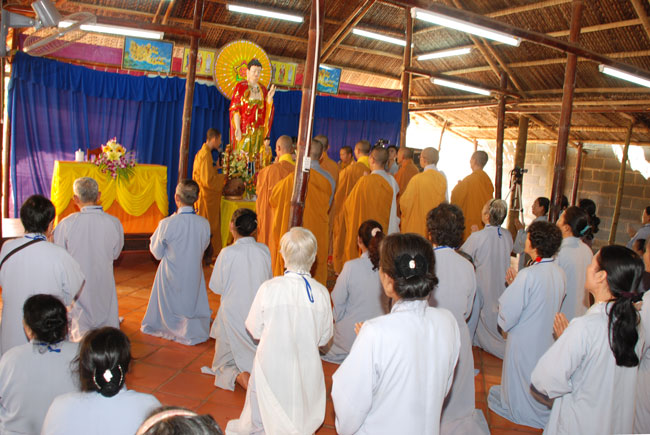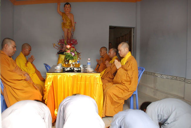 9 giờ, ba hồi chuông trống bát nhã vang lên cung nghinh chư tôn đức Tăng ni quang lâm hội trường chính thức cử hành lễ đặt đá xây dựng giảng đường. Sau phần nghi thức đặt đá, Thượng tọa đã có đôi lời tán thán tinh thần hoằng pháp lợi sinh của Đại đức trụ trì. Tuy là vùng sâu hẻo lánh, đời sống người dân còn khó khăn, nhưng Thầy đã nỗ lực khuyến hóa tổ chức cho Phật tử về tu tập, xây dựng cơ sở ngày một khang trang đúng với bản hoài của người xuất gia. Thượng tọa cũng tán thán tinh thần hộ pháp của quý Phật tử gần xa, người góp của kẻ góp công hiệp lực xây dựng ngôi tam bảo. Thượng tọa nhắc lại tinh thần hộ pháp trọng đạo khinh tài của Cấp Cô Độc. Thời Phật còn tại thế, trưởng giả Cấp Cô Độc do thấy được lợi ích của việc hoằng pháp, ông đã đem vàng trải đất để mua khu vườn của thái tử Kỳ Đà xây dựng tinh xá Kỳ Viên cúng dường đức Phật và chư Tăng làm nơi tu tập, hoằng pháp lợi sinh. Thượng tọa mong rằng chùa Phước Duyên sẽ có những cấp cô độc hộ pháp để công việc xây dựng giảng đường sớm hoàn thành. Được như vậy không những có lợi cho Phật tử hiện tại mà còn cho cả những thế hệ con cháu mai sau.
