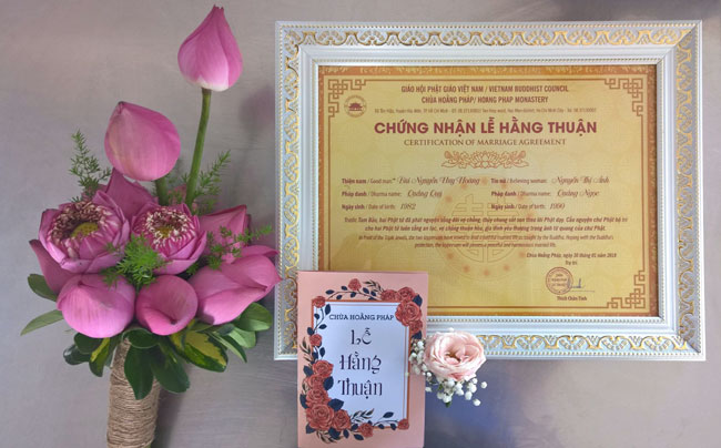 Dưới sự chứng minh của Tam bảo cùng sự có mặt của họ hàng hai bên, các đôi tân lang và tân nương đã thực hiện những nghi lễ truyền thống như lễ bái Tam bảo, lễ bái cha mẹ hai bên, trao nhẫn cưới cho nhau và cùng phát nguyện trọn đời chung sống theo những nguyên tắc đạo đức mà Đức Phật đã dạy.