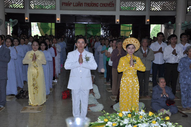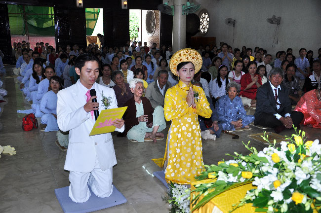 Sau phần nghi lễ niêm hương đảnh lễ Tam Bảo, quý thầy đã ban lời pháp nhủ về cách xây dựng hạnh phúc gia đình cho đôi uyên ương chuẩn bị bước vào đời sống vợ chồng. Hôn nhân là hoa trái tình yêu chân chính. Việc quyết định gắn bó cuộc đời dài lâu với nhau là một quyết định hệ trọng của đời người. Vì vậy, để duy trì tình yêu và hạnh phúc gia đình lâu dài thì cả vợ và chồng phải thường luôn trau dồi giới đức, biết tôn trọng, lắng nghe, tha thứ, hết lòng yêu thương và sống chung thủy với nhau. Qua hơn một giờ nghe giảng pháp, trước sự chứng minh của chư tôn đức và sự hiện diện của họ hàng hai bên, buổi lễ tác hợp của đôi uyên ương càng thêm thắt chặt và thiêng liêng. Đó cũng là tác duyên và là động lực để đôi uyên ương luôn cố gắng hết sức mình trong công trình vun bồi hạnh phúc gia đình.