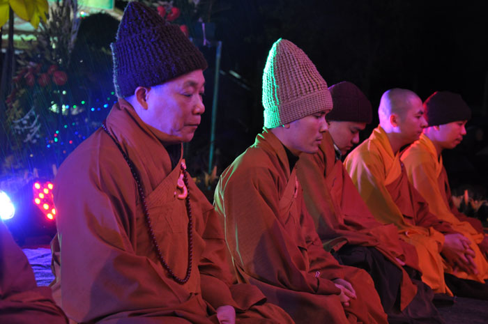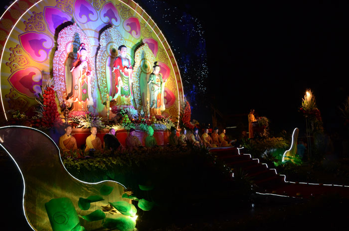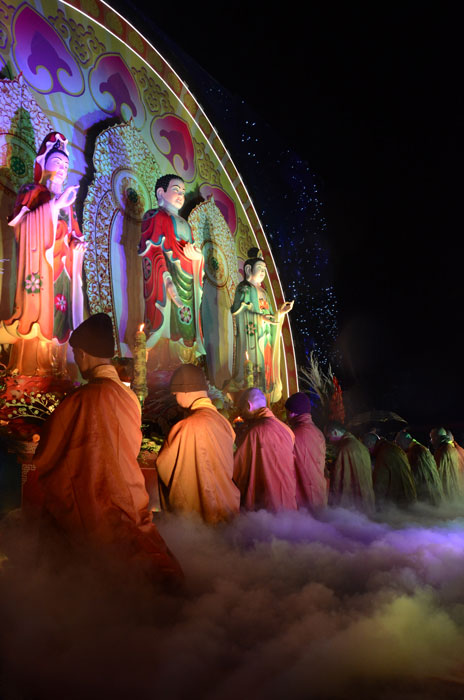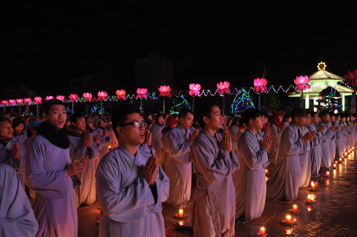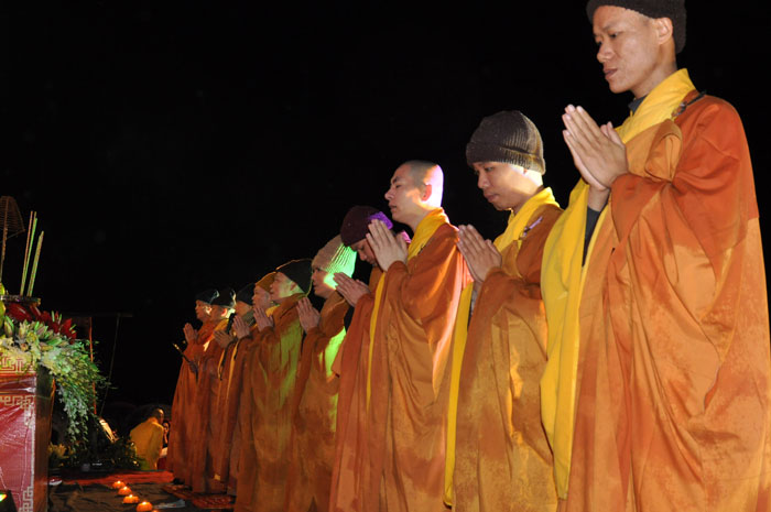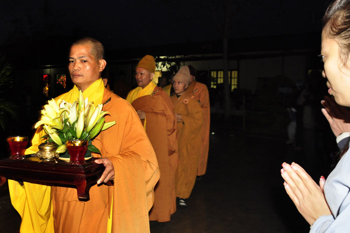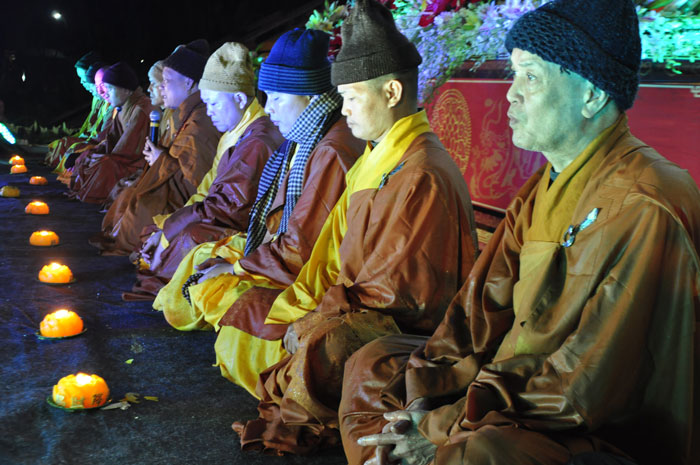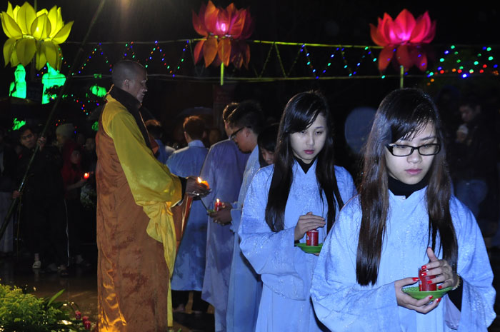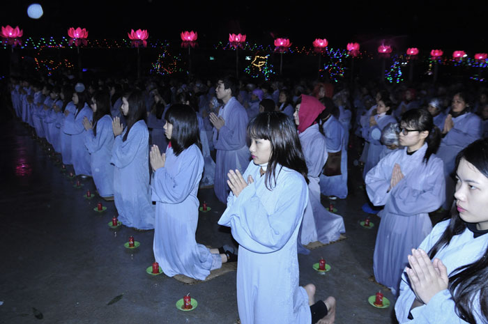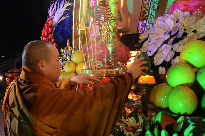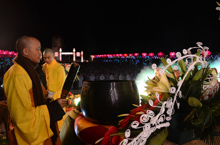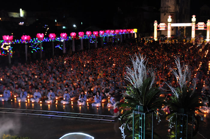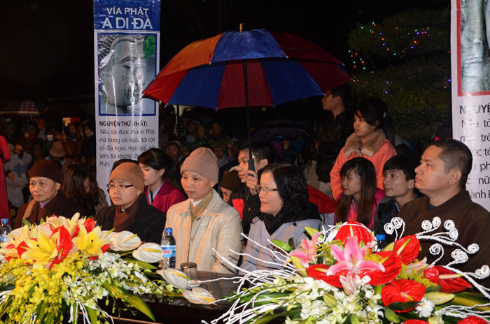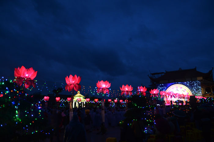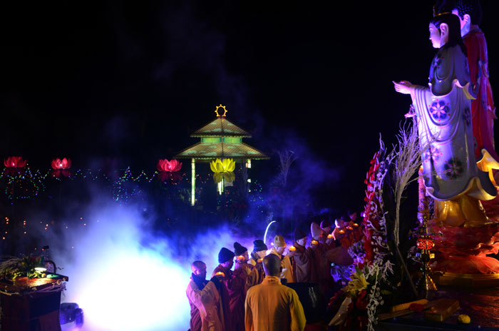 Buổi tối, đúng 18h00, Thượng tọa đã cùng chư Tôn đức quang lâm lễ đài chứng minh lễ hội hoa đăng kỷ niệm ngày vía của đức Từ phụ A Di Đà. Tuy thời tiết khá rét kèm theo mưa phùn, nên làm cho không khí càng thêm giá lạnh. Nhưng với lòng thành kính rất mực của toàn thể đạo tràng, đêm hội diễn ra rất trang nghiêm và long trọng. Hàng ngàn Phật tử trên tay với những ngọn nến lung linh huyền ảo, tỏa sáng đã làm ấm lại tâm hồn của mỗi người cũng như không gian của đêm hội. Với ánh sáng biểu tượng của từ bi và trí tuệ ấy, quý Phật tử lại một lần nữa cảm nhận được tình thương của đức Từ phụ đã dành cho nhân loại. Đêm lễ càng long trọng hơn với những màn pháo hoa hoành tráng và những giai điệu du dương ca ngợi tán thán công hạnh của đức Phật A Di Đà.