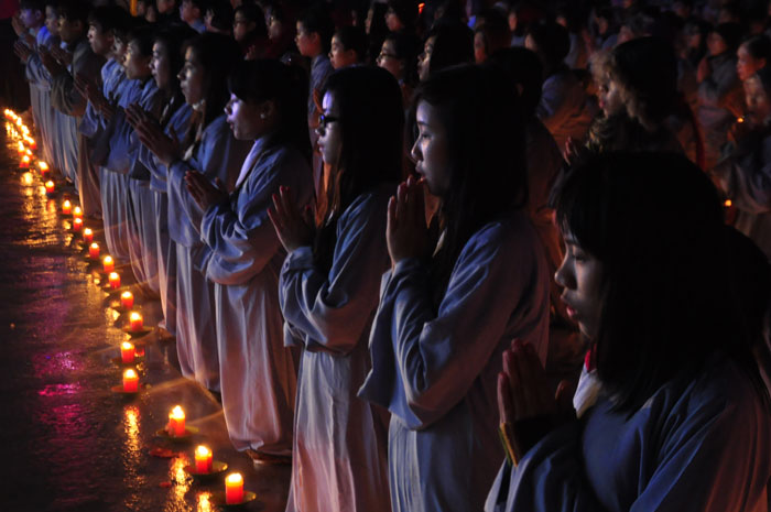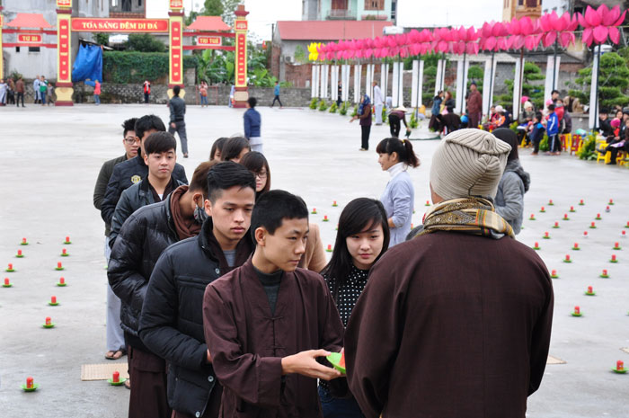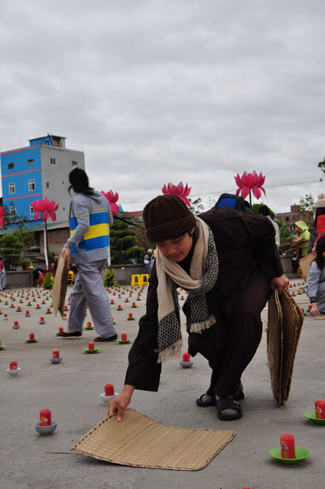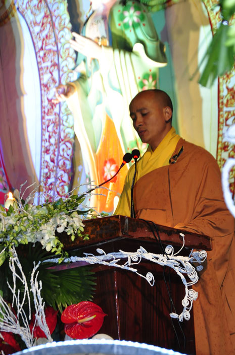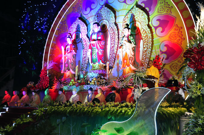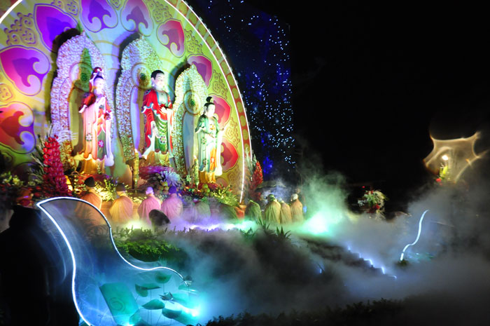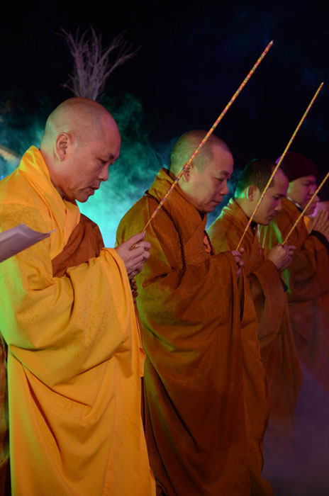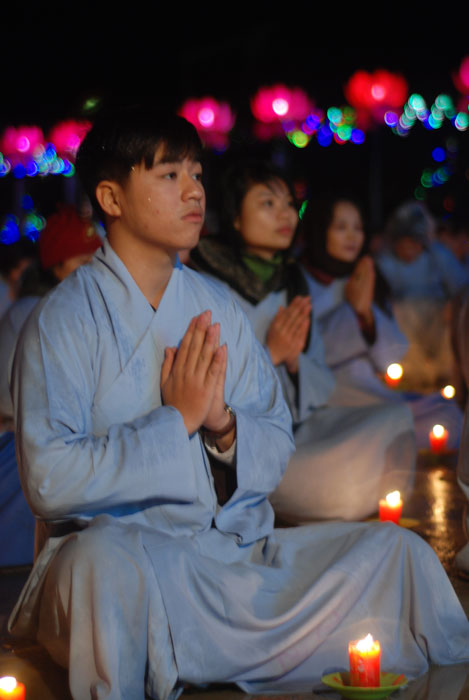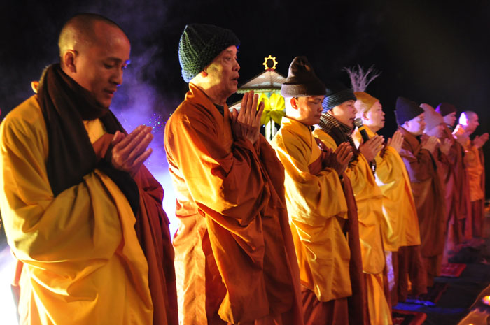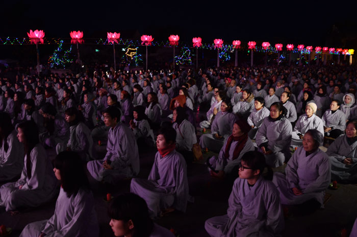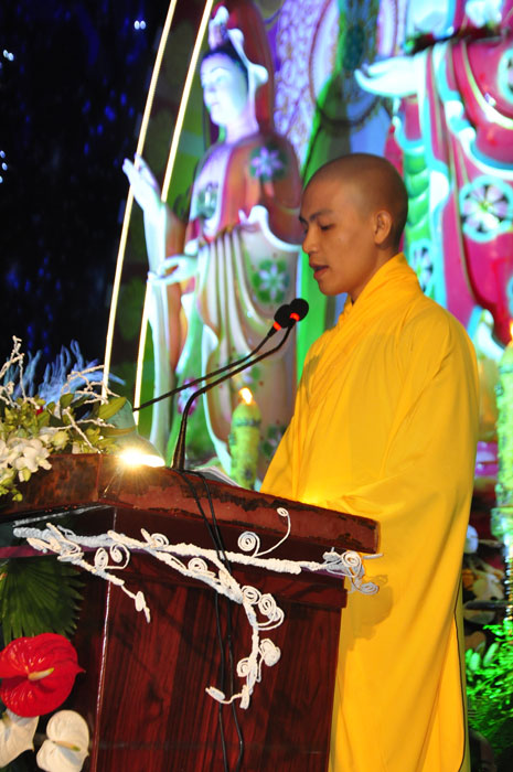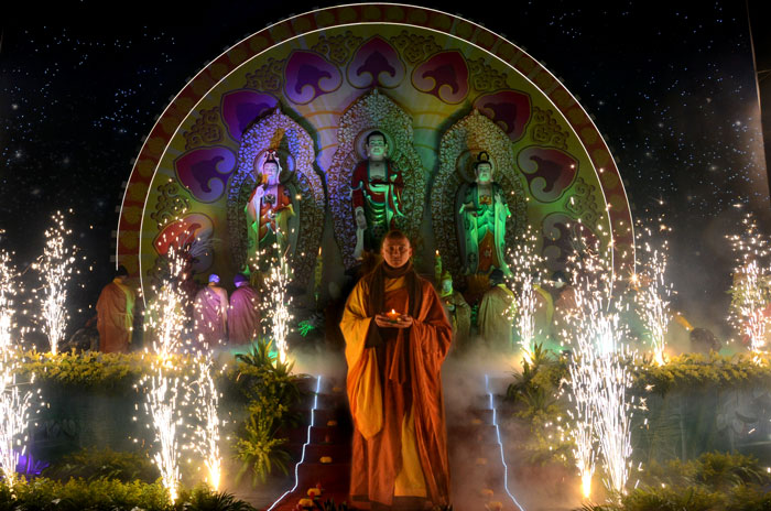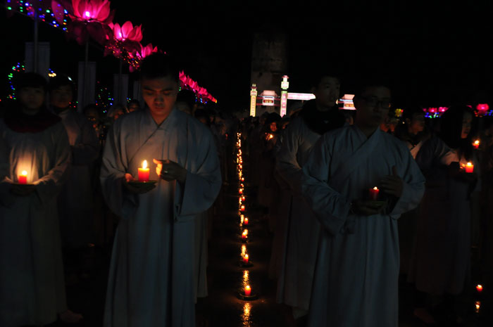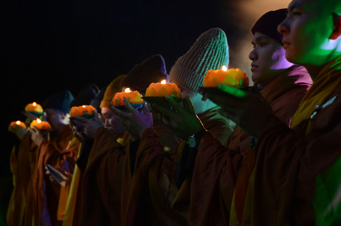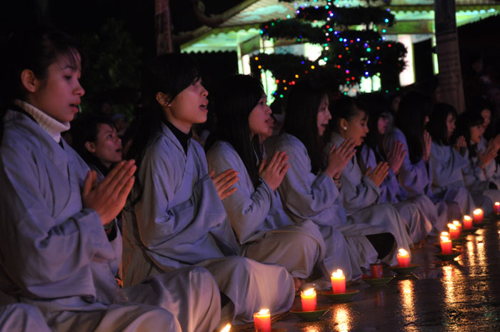 Buổi tối, đúng 18h00, Thượng tọa đã cùng chư Tôn đức quang lâm lễ đài chứng minh lễ hội hoa đăng kỷ niệm ngày vía của đức Từ phụ A Di Đà. Tuy thời tiết khá rét kèm theo mưa phùn, nên làm cho không khí càng thêm giá lạnh. Nhưng với lòng thành kính rất mực của toàn thể đạo tràng, đêm hội diễn ra rất trang nghiêm và long trọng. Hàng ngàn Phật tử trên tay với những ngọn nến lung linh huyền ảo, tỏa sáng đã làm ấm lại tâm hồn của mỗi người cũng như không gian của đêm hội. Với ánh sáng biểu tượng của từ bi và trí tuệ ấy, quý Phật tử lại một lần nữa cảm nhận được tình thương của đức Từ phụ đã dành cho nhân loại. Đêm lễ càng long trọng hơn với những màn pháo hoa hoành tráng và những giai điệu du dương ca ngợi tán thán công hạnh của đức Phật A Di Đà.
