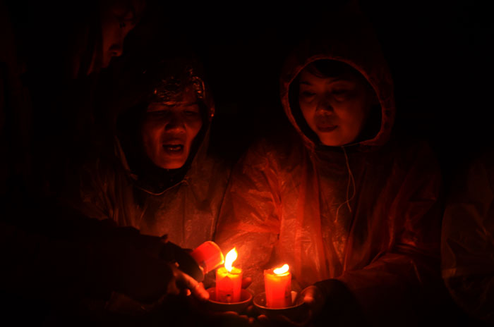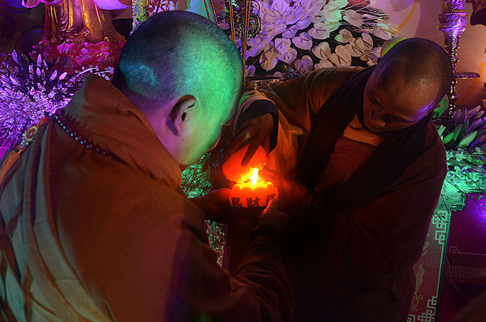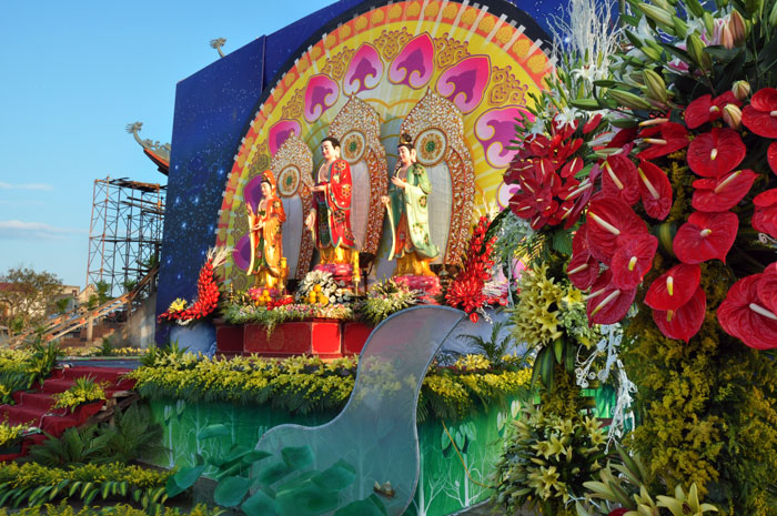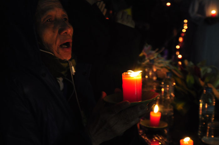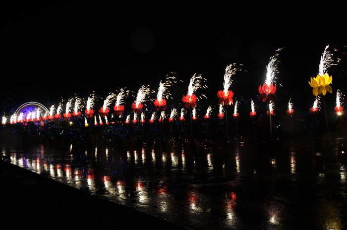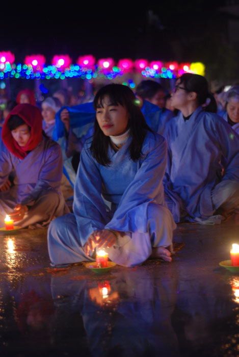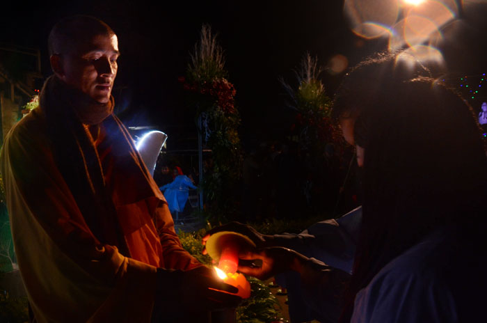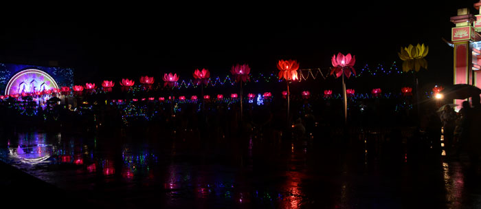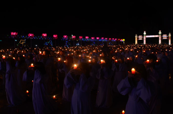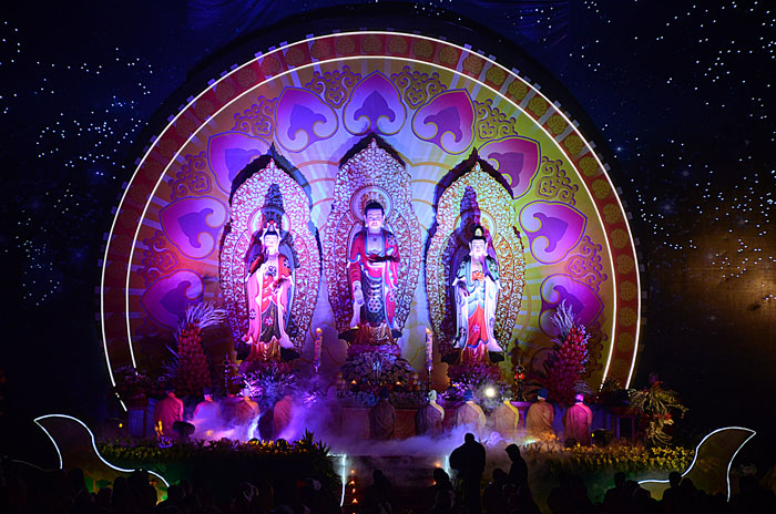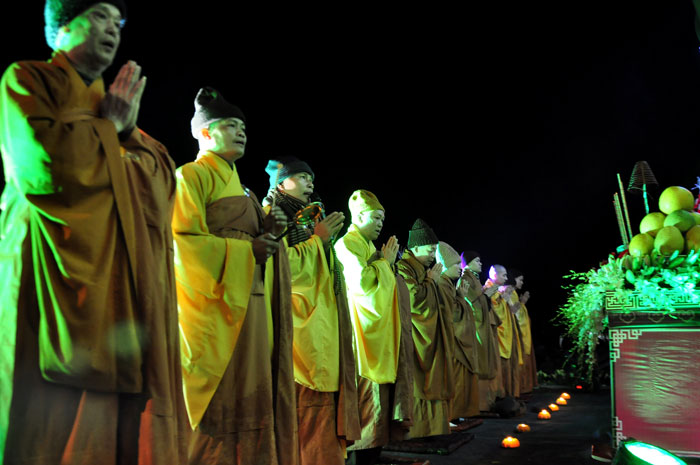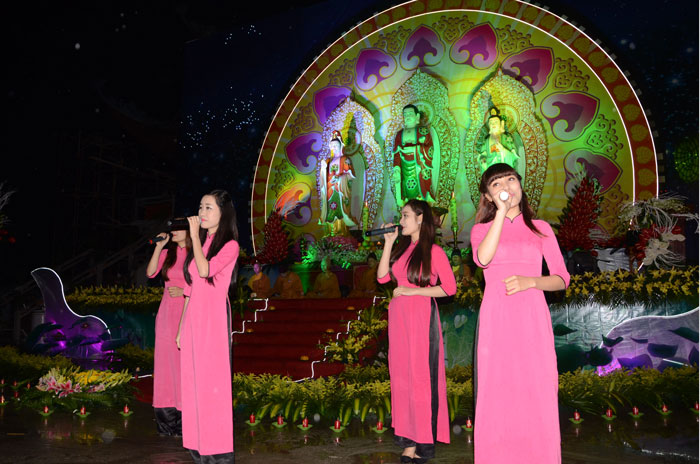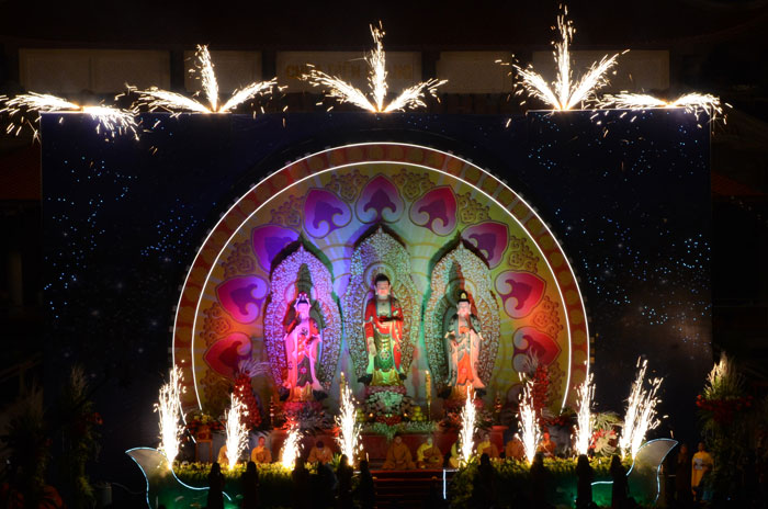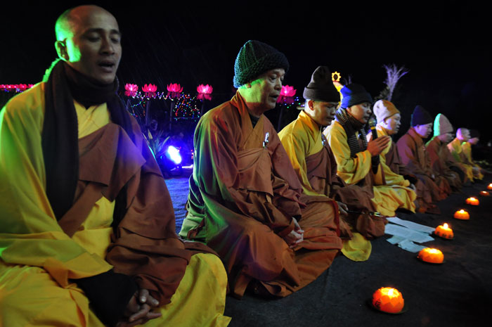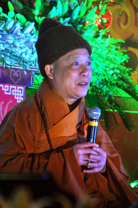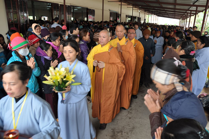 Buổi tối, đúng 18h00, Thượng tọa đã cùng chư Tôn đức quang lâm lễ đài chứng minh lễ hội hoa đăng kỷ niệm ngày vía của đức Từ phụ A Di Đà. Tuy thời tiết khá rét kèm theo mưa phùn, nên làm cho không khí càng thêm giá lạnh. Nhưng với lòng thành kính rất mực của toàn thể đạo tràng, đêm hội diễn ra rất trang nghiêm và long trọng. Hàng ngàn Phật tử trên tay với những ngọn nến lung linh huyền ảo, tỏa sáng đã làm ấm lại tâm hồn của mỗi người cũng như không gian của đêm hội. Với ánh sáng biểu tượng của từ bi và trí tuệ ấy, quý Phật tử lại một lần nữa cảm nhận được tình thương của đức Từ phụ đã dành cho nhân loại. Đêm lễ càng long trọng hơn với những màn pháo hoa hoành tráng và những giai điệu du dương ca ngợi tán thán công hạnh của đức Phật A Di Đà.