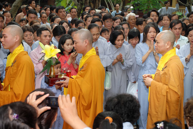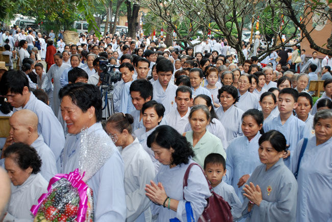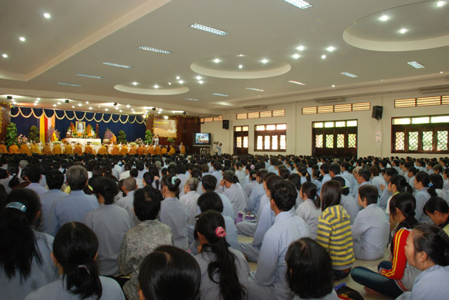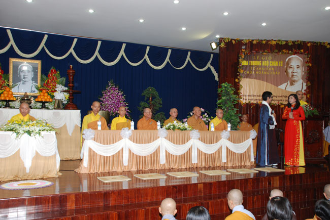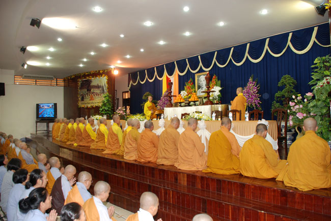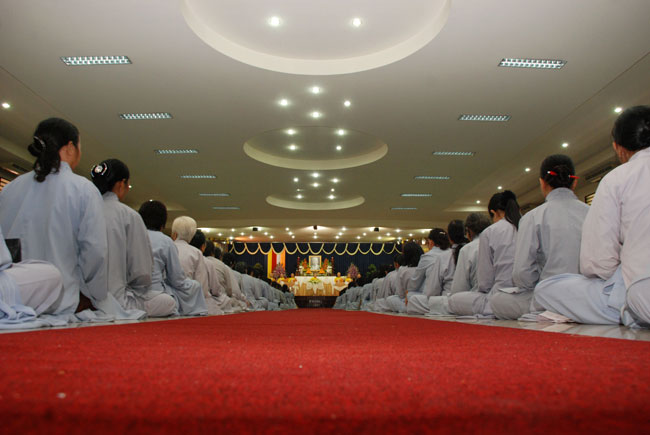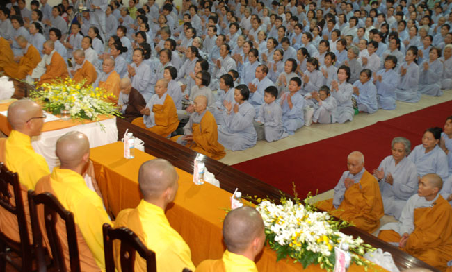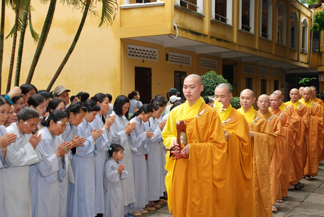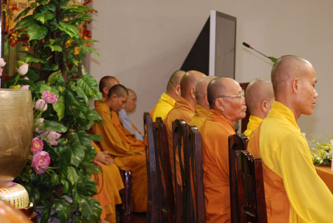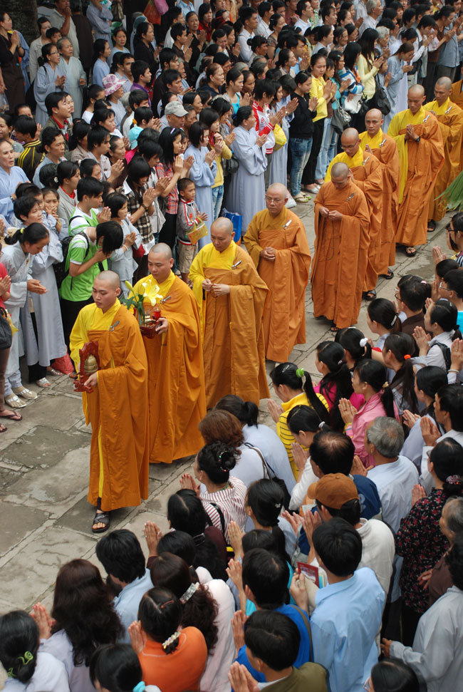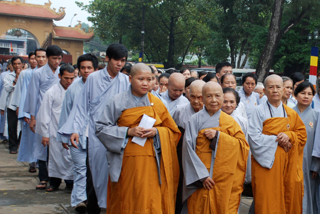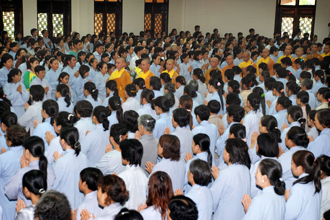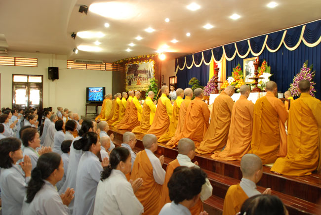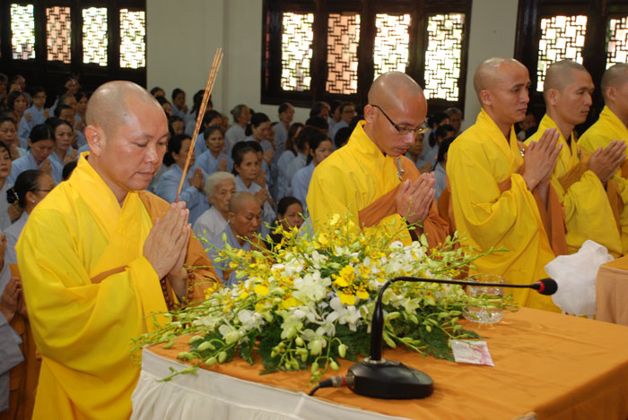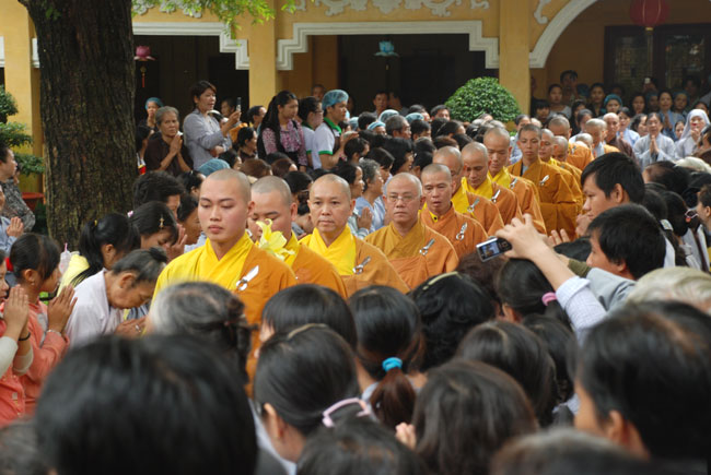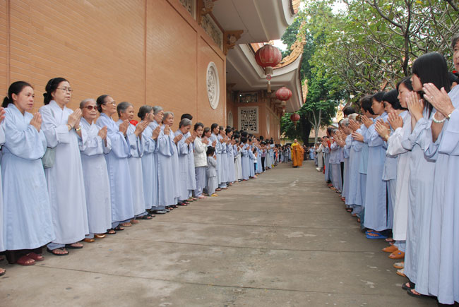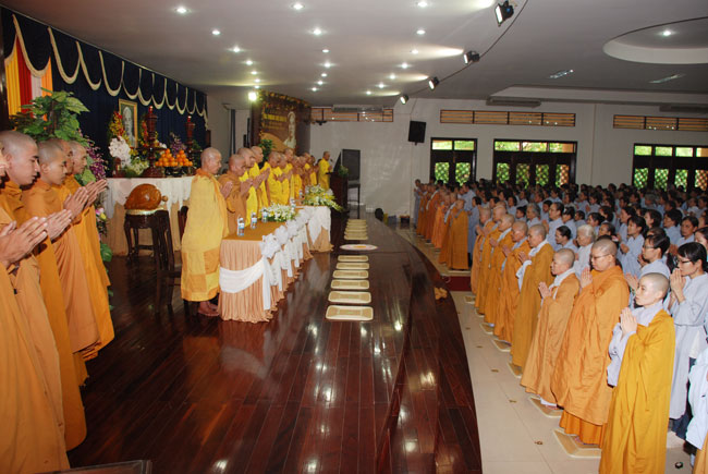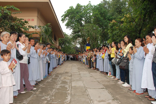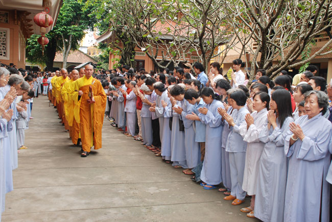 Đúng 9h sáng, khi ba hồi chuông trống bát nhã vang lên, cũng là lúc hai hàng Phật tử trang nghiêm chắp tay thành kính cung nghinh chư tôn đức quang lâm giảng đường cử hành lễ.