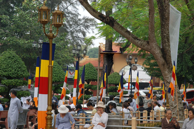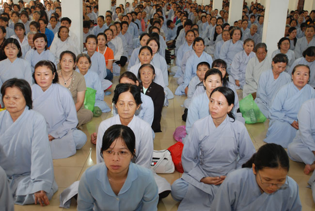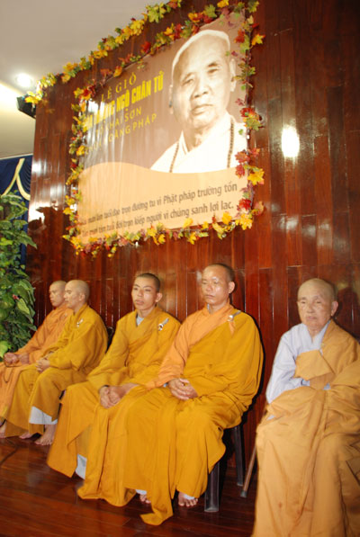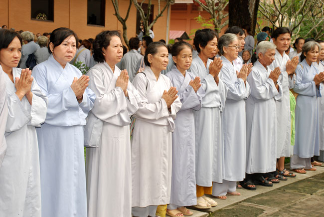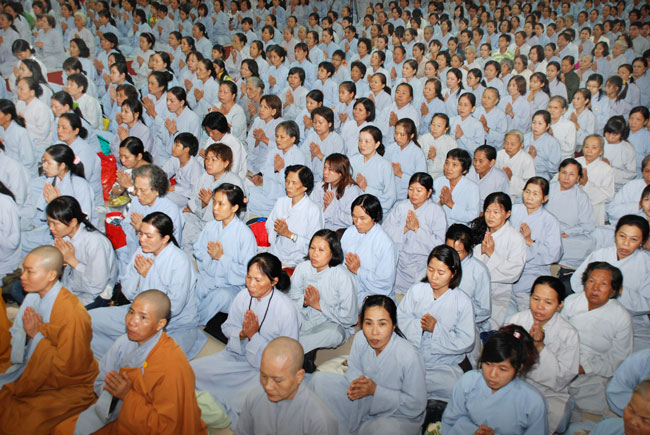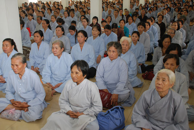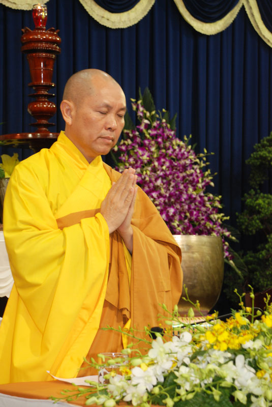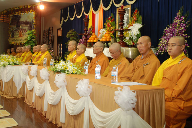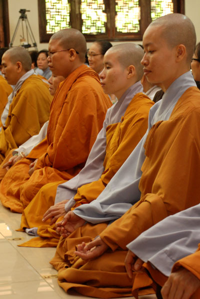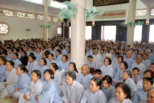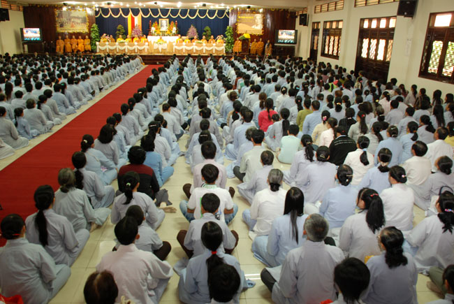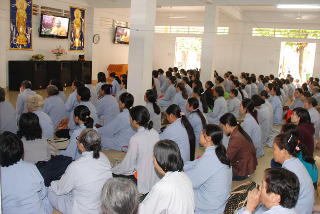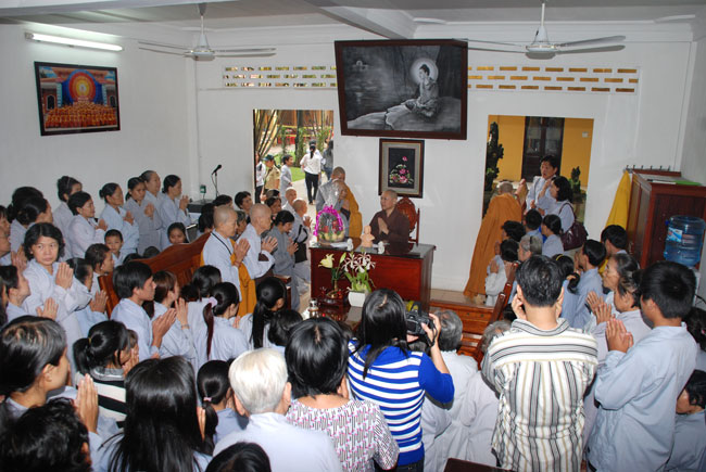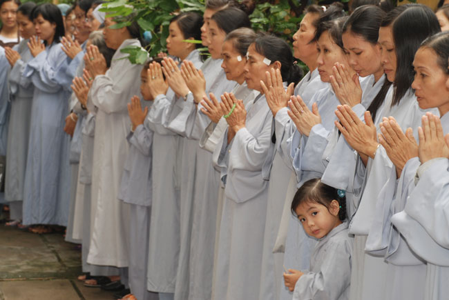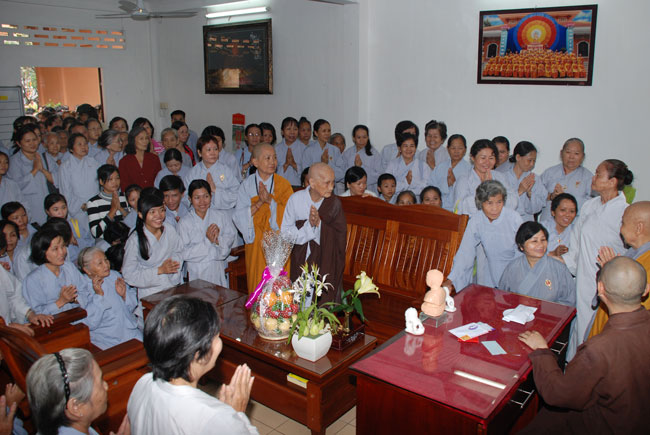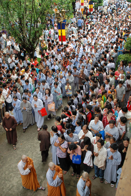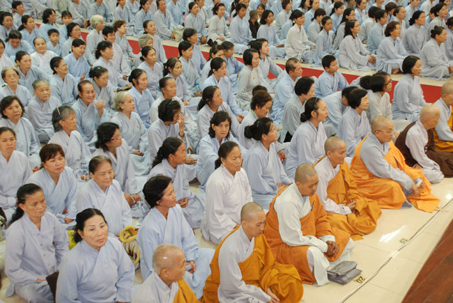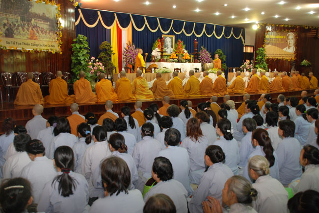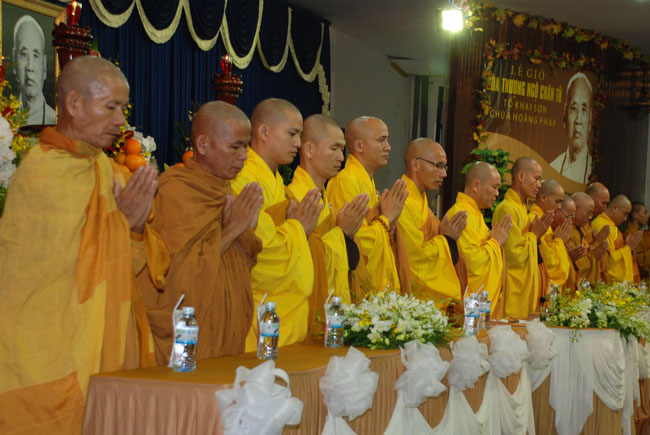 Đúng 9h sáng, khi ba hồi chuông trống bát nhã vang lên, cũng là lúc hai hàng Phật tử trang nghiêm chắp tay thành kính cung nghinh chư tôn đức quang lâm giảng đường cử hành lễ.
