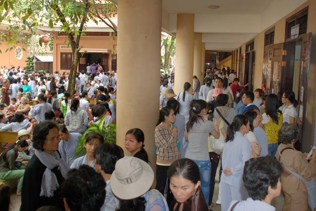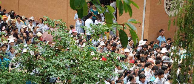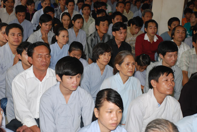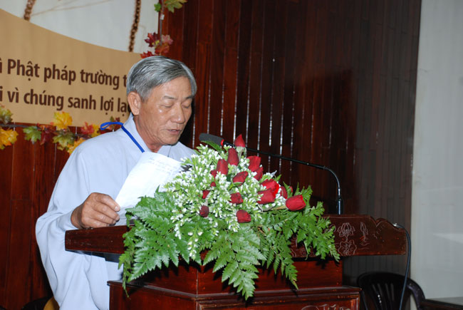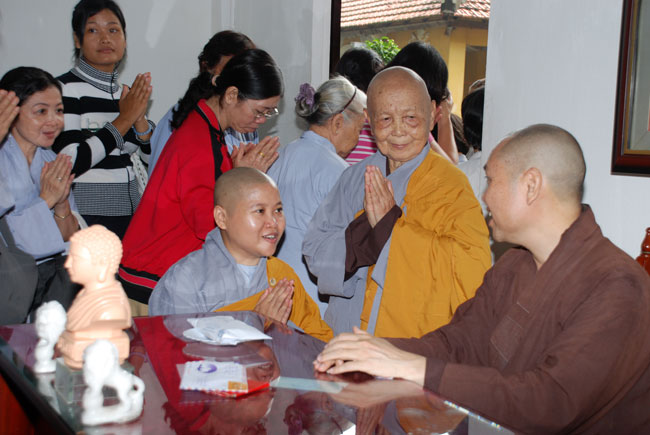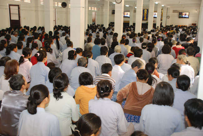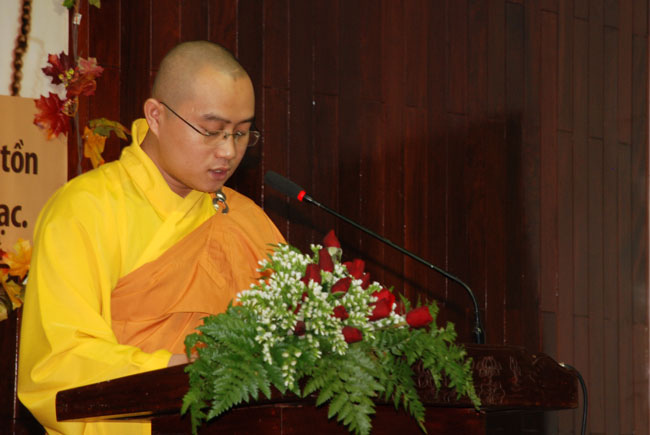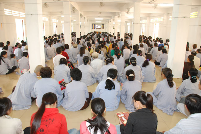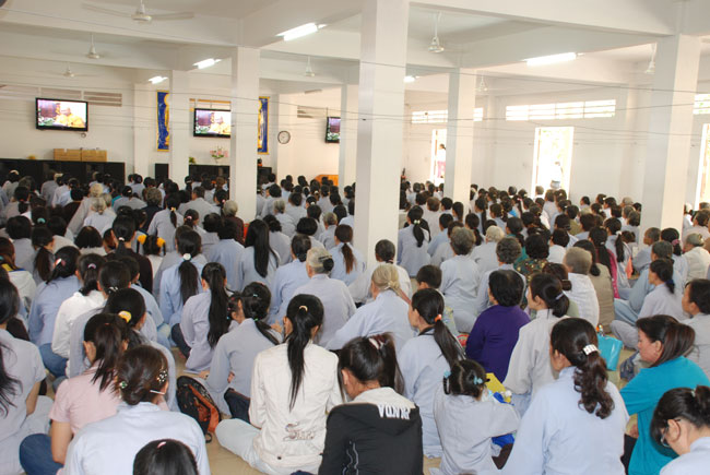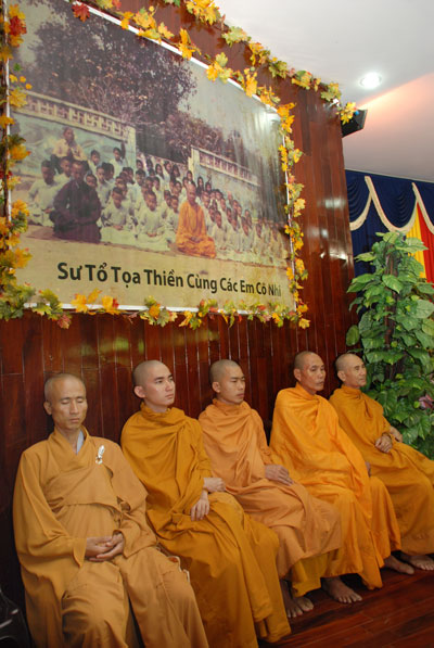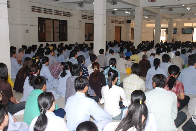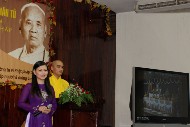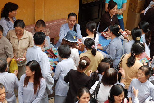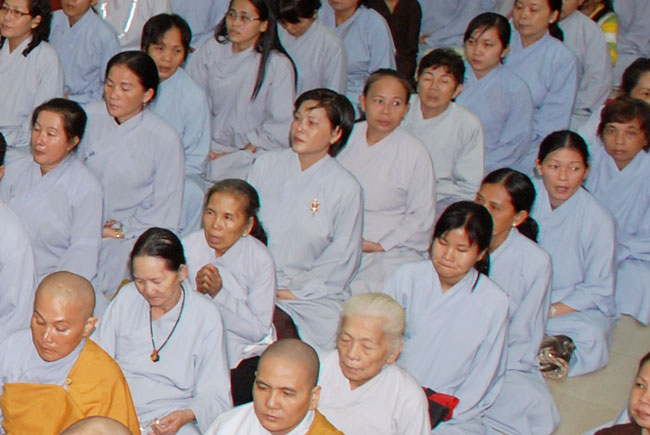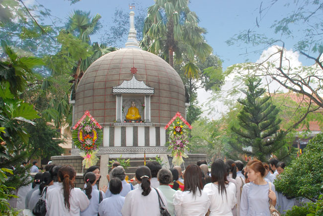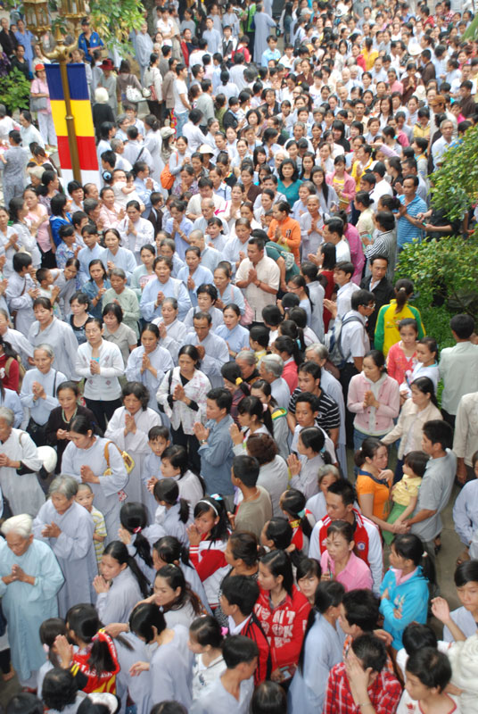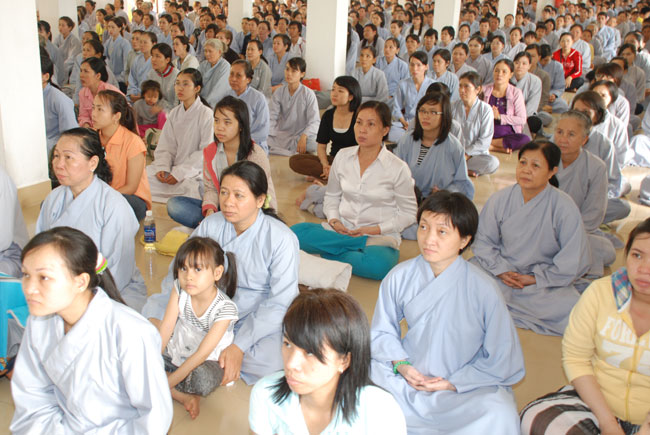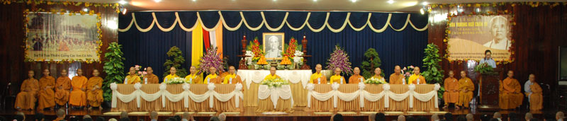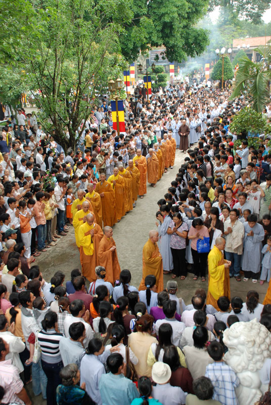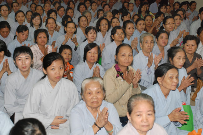 Đúng 9h sáng, khi ba hồi chuông trống bát nhã vang lên, cũng là lúc hai hàng Phật tử trang nghiêm chắp tay thành kính cung nghinh chư tôn đức quang lâm giảng đường cử hành lễ.