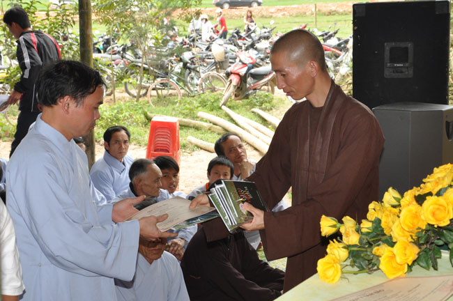 Cuối buổi lễ, Thượng tọa đã tặng hơn 400 phần quà Pháp bảo gồm 01 cuốn sách “Ý nghĩa quy y Tam Bảo” và VCD “Khó vẫn làm được” & “ Phật pháp nhiệm màu kỳ 26” do chùa Hoằng Pháp thực hiện.