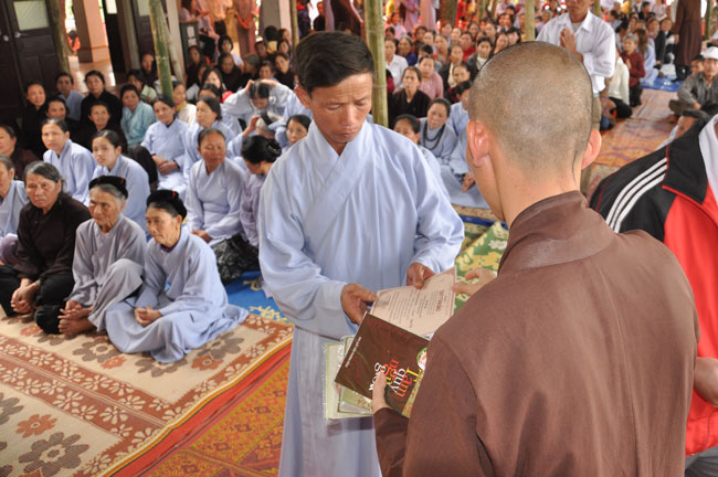 Sau khi đăng ký danh sách quy y, quý thiện nam tín nữ nghiêm trang ngồi vào hàng và dưới sự hướng dẫn của Đại đức Thích Tâm Phong – chư Tăng chùa Hoằng Pháp, tiếng niệm Phật đã cất cao thay cho lời tri ân sâu sắc đến Thượng tọa Thích Chân Tính.